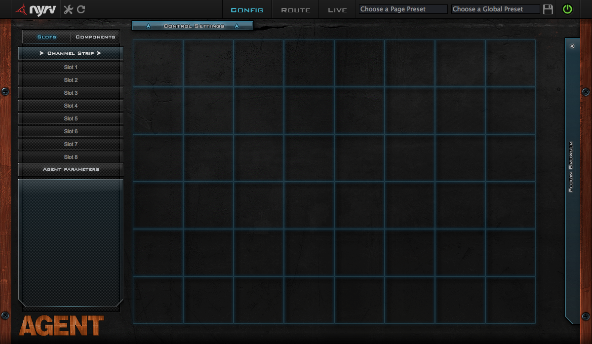 L’interface d’Agent comporte trois pages : « Config », « Route » et « Live ». Pour commencer à créer un rack, il faut bien entendu passer par la première d’entre elles. Là, une grille 8×6 vous attend… Mais de quoi s’agit-il ? Ah oui, j’ai oublié de vous dire : Agent permet de constituer des racks virtuels de vos plug-ins, mais avec une petite particularité en plus, c’est vous qui créez l’interface graphique selon les paramètres de chaque plug-in du rack auquel vous souhaitez avoir accès ! Rendez-vous compte, sur le papier il est tout simplement possible d’élaborer de A à Z le Channel Strip ultime avec l’interface graphique – et donc l’ergonomie – de vos rêves… Joli programme !