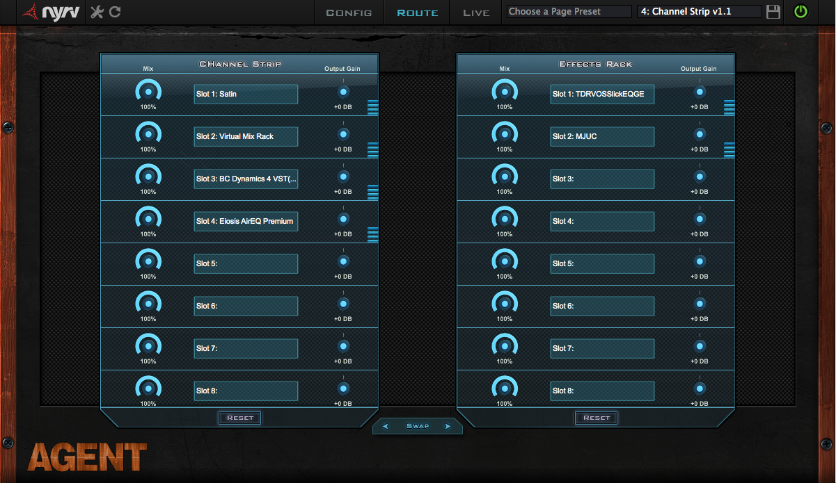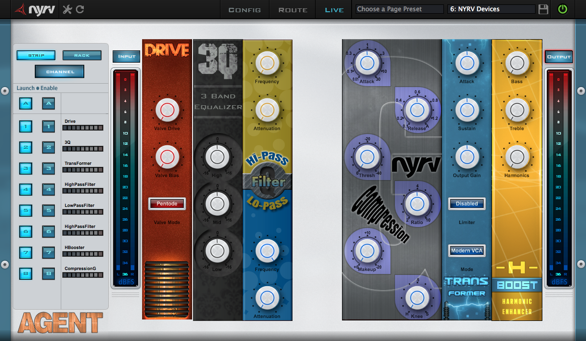 J’en veux pour preuve le Virtual Mix Rack de Slate Digital, ou la récente sortie de la version 5 du bundle SoundToys avec son Effect Rack. Aussi bien soient-ils, ces produits ont pour inconvénient commun de ne fonctionner qu’avec les plug-ins de leurs éditeurs respectifs. Afin de se constituer un rack personnalisé avec des plug-ins provenant de n’importe quel horizon, il existe cependant quelques solutions comme par exemple Patchwork du français Blue Cat Audio. Et puis il y a Agent, le premier né de la toute jeune société Nyrv Systems. Sorti en mai dernier, celui-ci adopte une approche du rack virtuel assez novatrice comme nous allons le voir…