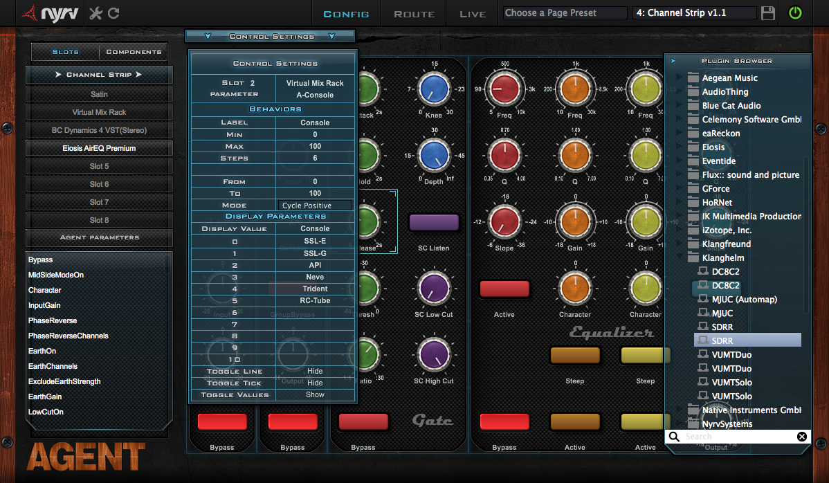 Bref, pour un plug-in censé vous donner la main sur l’ergonomie, il faut bien avouer que lui-même en manque sérieusement même si la prise en main est simple. Si vous êtes du genre à changer votre chaîne de traitement tous les quatre matins et/ou si vous avez du mal à faire des choix, autant vous dire qu’Agent n’est pas fait pour vous tant sa configuration est chronophage. À titre d’exemple, sachez qu’il m’a fallu pas moins de 3 heures pour configurer mon Channel Strip (presque) parfait avec une simulation de console, une émulation d’enregistreur à bande, un Gate, une premier égaliseur de nettoyage, un compresseur et un égaliseur de « coloration ». Pourquoi presque parfait ? Et bien parce que certains cas de figure ne semblent pas prévus. Par exemple, il est impossible d’inverser le comportement d’un bouton. L’utilisateur n’a pas la main sur les unités des valeurs s’affichant en pop-up lors de la manipulation d’un paramètre, il faut que le plug-in source envoie lui-même les unités, ce qui n’est pas toujours le cas. Il n’y a pas non plus de possibilité d’afficher la réduction de gain pour un compresseur. Les fonctions de groupement entre plug-ins offertes par des produits du genre émulation de consoles ne sont pas prises en compte. Impossible également d’intégrer les éventuelles fonctions de sidechain externe.