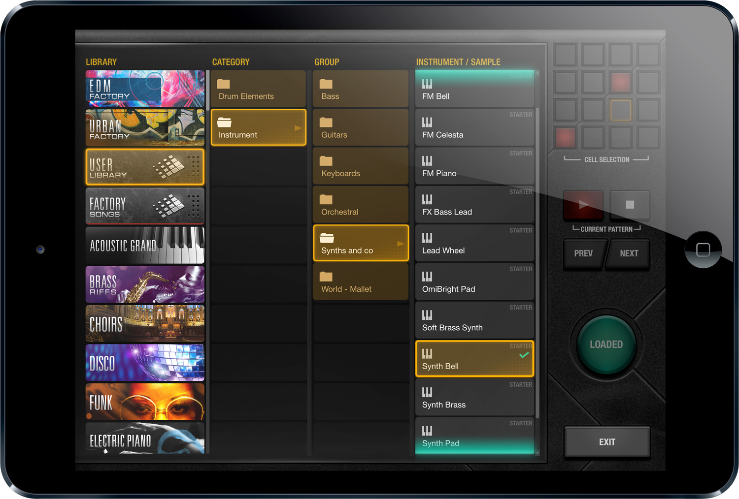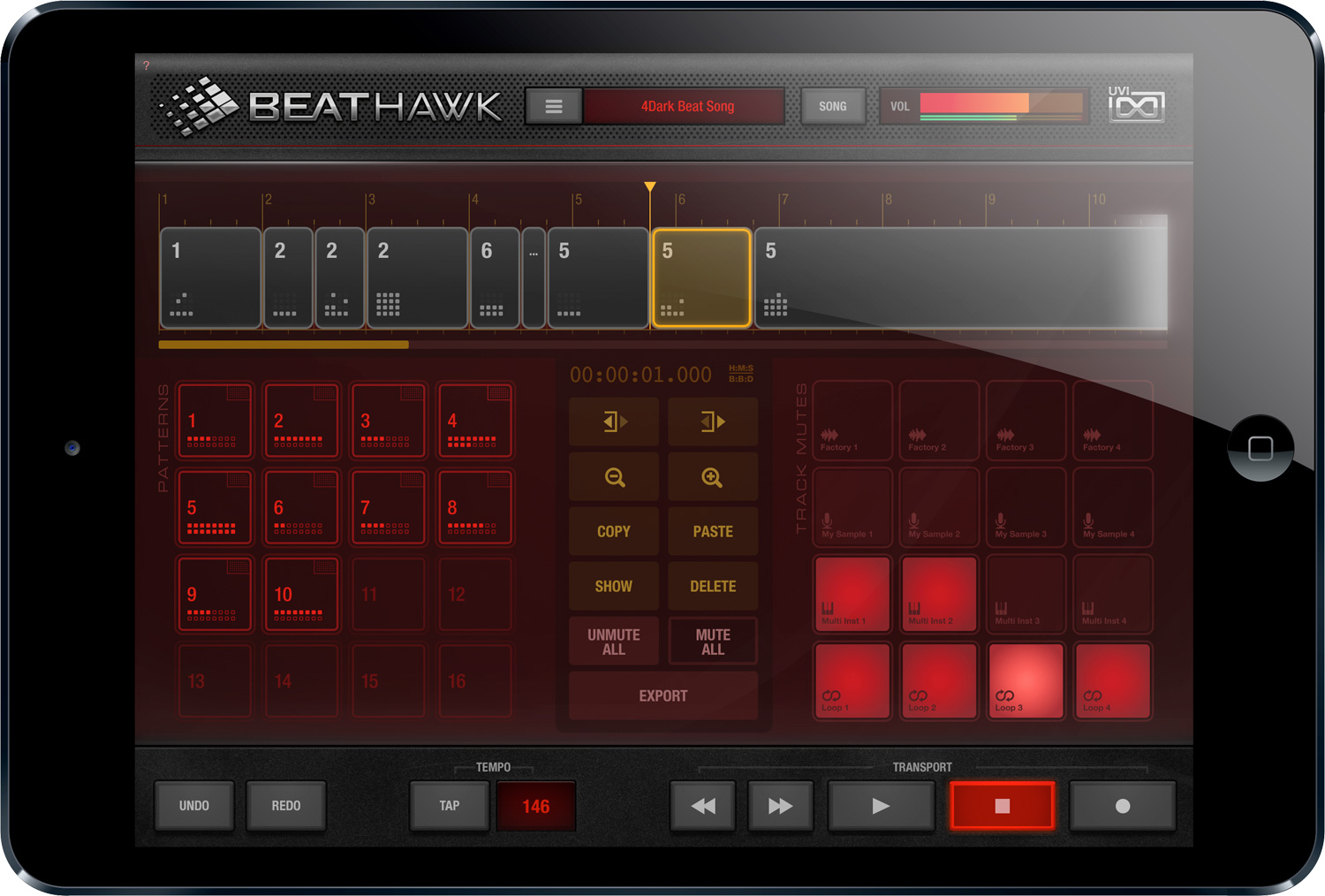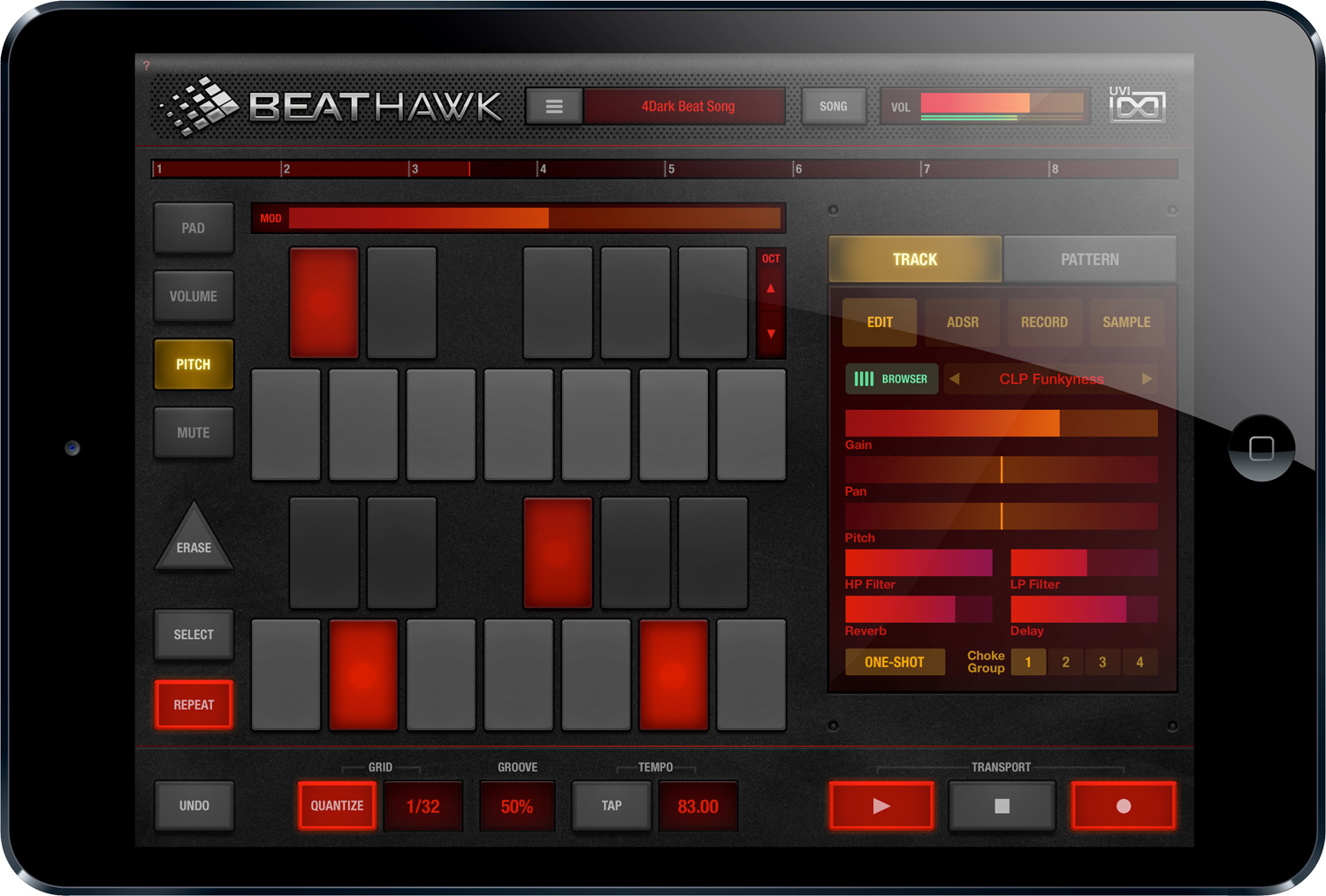 BeatHawk est un séquenceur de 16 pistes agrémenté d’une large bibliothèque de sons et d’effets provenant des collections d’UVI pour créer rythmes, mélodies, samples, les arranger et les mixer avant de les exporter ou de les utiliser dans d’autres applications. L’appli est basée sur le même moteur UVI Engine qui est employé dans les instruments virtuels de la marque et vous pourrez compléter la collection existante par des banques disponibles en achat in-app.