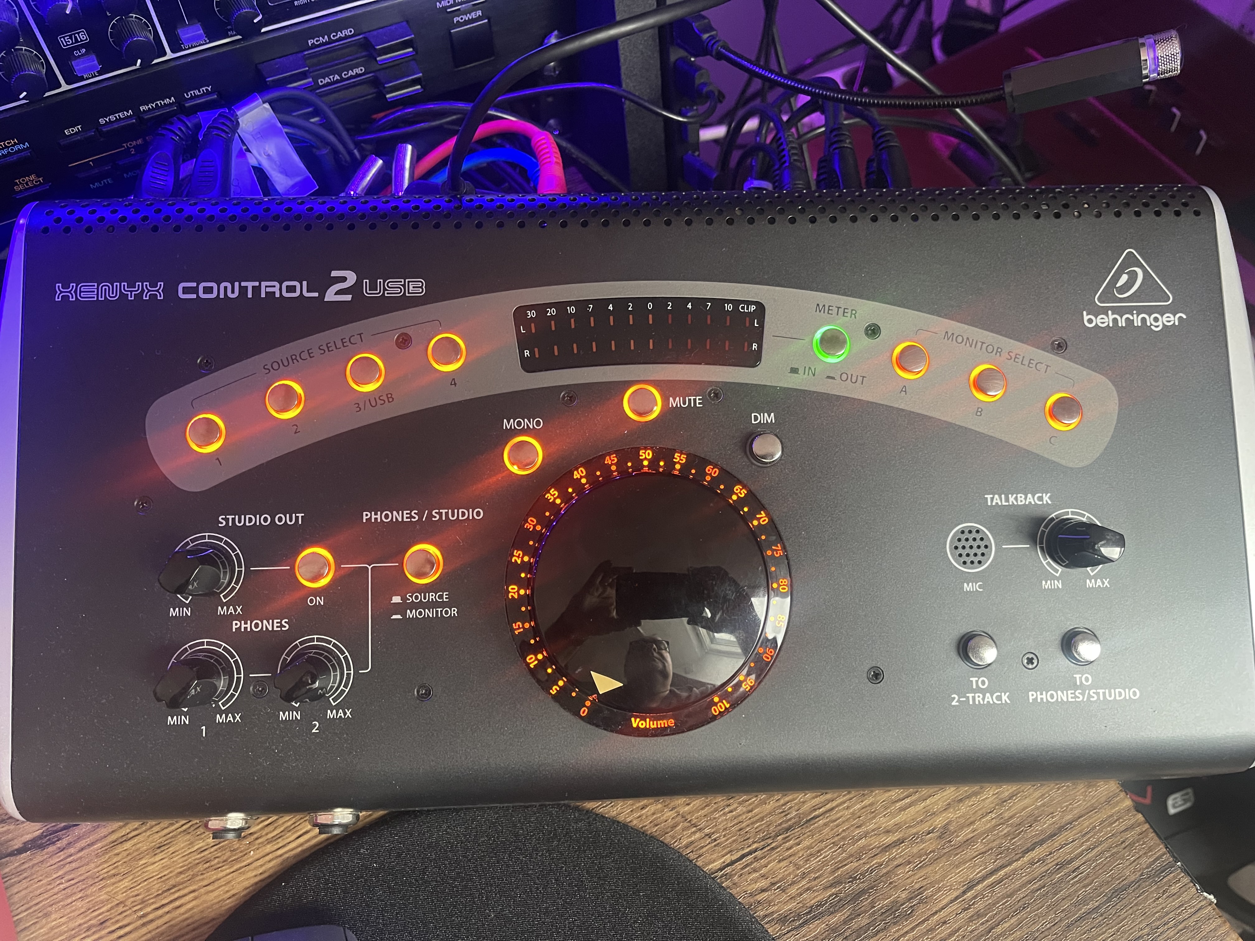 J'utilise ce tank comme contrôleur de monitoring, pour écouter sur une paire de moniteur studio, une paire de Hifi et une enceinte bluetooth JBL. Je me sers des entrées pour DAW principal, un laptop, et une prise Aux de téléphone pour écouter des trucs dans le studio directement