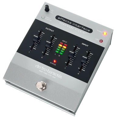 B-Stock, Electro Harmonix Effects Interface Hardware Plugin; Effects Pedal for Electric Guitar; Electro Harmonix Effects Interface; use pedals and other physical guitar equipment with your DAW easy and seamless or use your favorite computer plugins for use in your guitar rig. No need for special converters or direct boxes, the Effects Interface handles your signal and delivers it between your hardware and software via a simple USB-C connection; operates in 3 distinct modes: Hardware Plugin Mode: – Send tracks/signal from your DAW through you pedals/hardware just like you were using a plugin, Pedalboard Mode: Run your instrument into your DAW, through your plugins, and back out to your signal chain, effectively turning your plugins into a pedal, and Audio Interface Mode: use the Effects Interface as a traditional 2-in/2-out USB audio interface; Stereo inputs and outputs with dedicated level control sliders; Headphone output with volume control; Controls: L & R Input Level, L & R Output Level; LED: Power, USB, Status; Display: Input Level; Footswitches: Effect Bypass; Connections: L & R Input (2 x 1/4"" Jack), L & R Output (2 x 1/4"" Jack); Power Supply connector: Barrel Connector 5.5 x 2.1 mm, center negative; Current Draw: 200 mA; powered by a 9 V DC Power Supply (included); Dimensions: (W x D x H): 114 x 146 x 57 mm (4,5"" x 5,75"" x 2,25""); Note: Battery operation is not supported, B-Stock with full warranty, may have slight traces of use