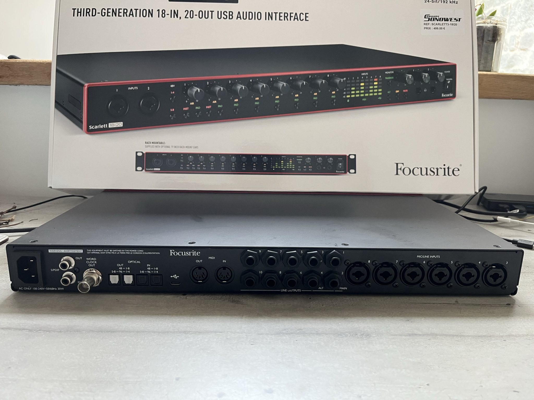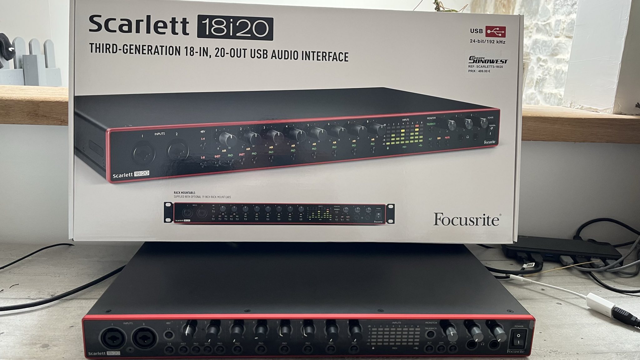 J'ai le câble d'alimentation, le câble USB pour brancher à un PC, ainsi que la boite d'origine. Comme vous pouvez le voir sur la boite, carte son achetée à Sonowest en première main.