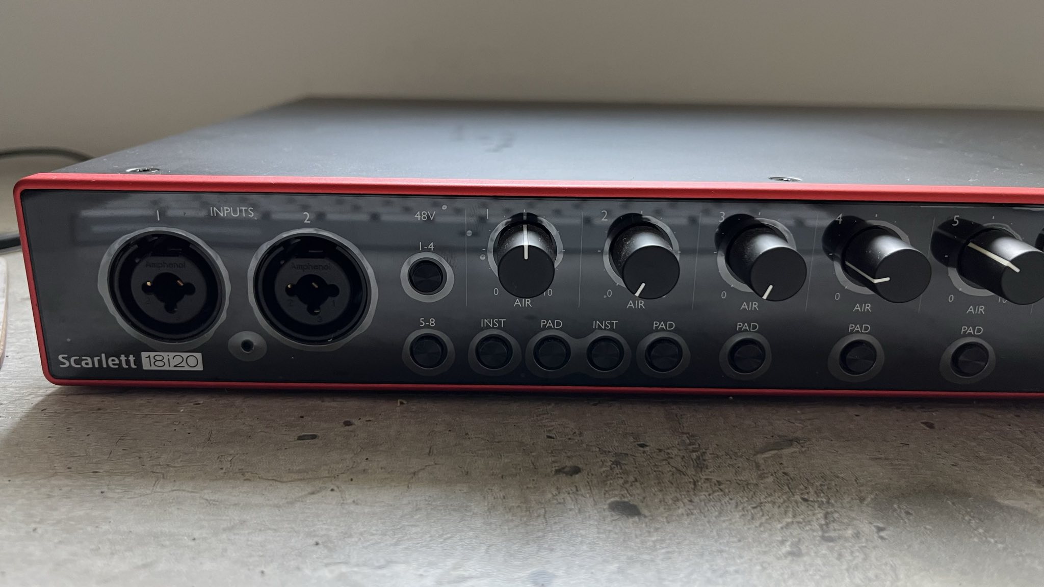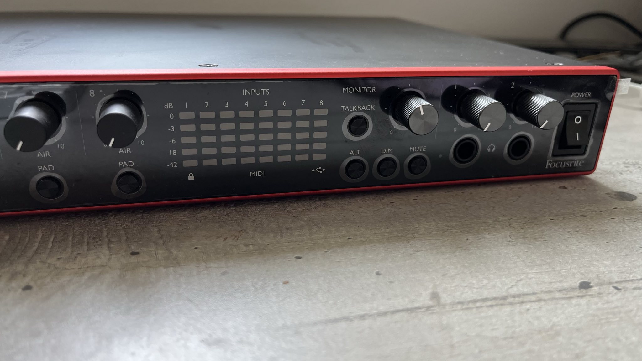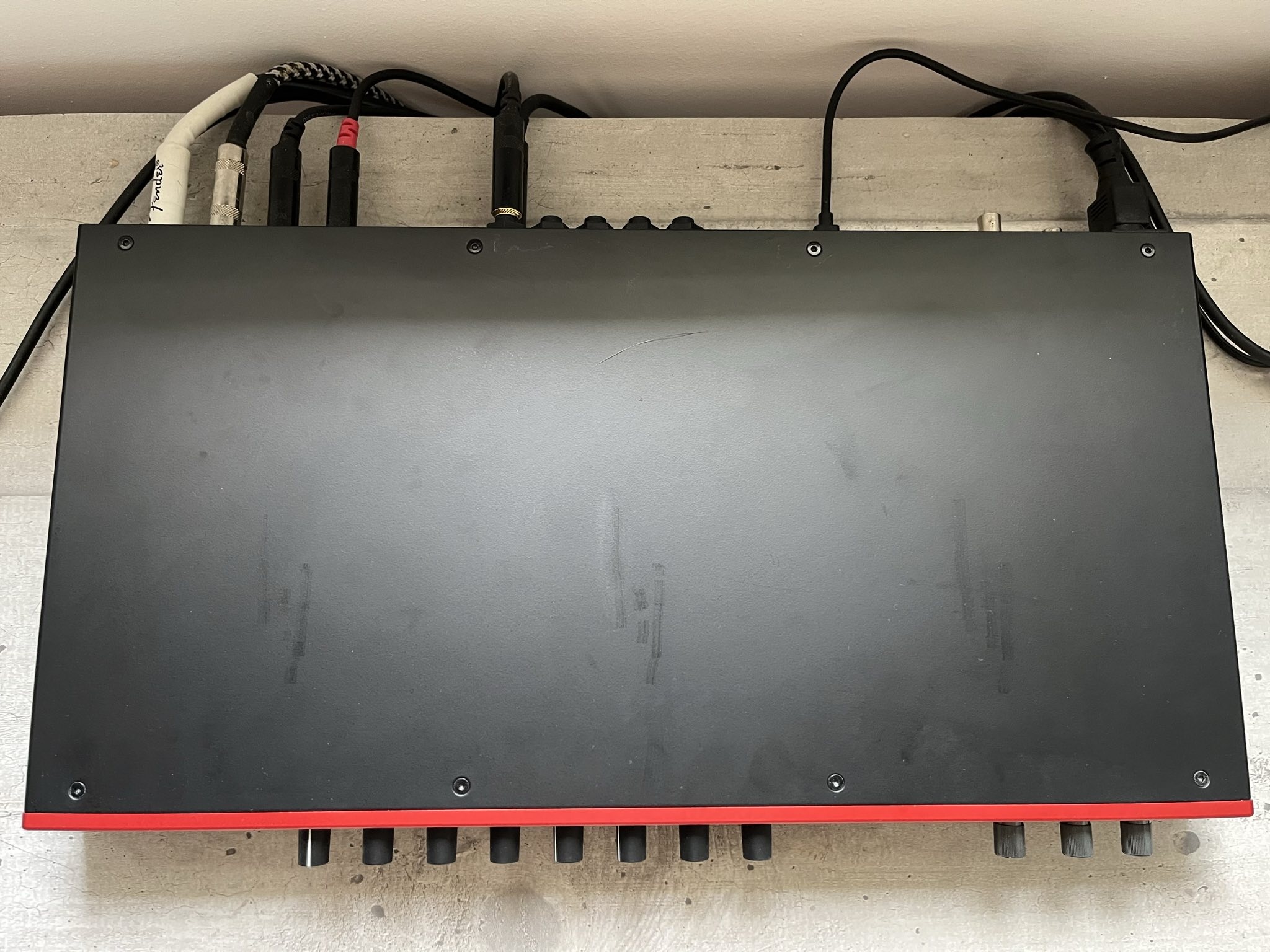 Elle est en très bon état. Visible sur la vue de dessus, quelques traces (qui ressortent beaucoup parce que la photo est prise avec la lumière qui arrive en plein dessus). C'est lié à un écran externe qui a été posé dessus un certains temps. Le plastique protecteur de la face avant est toujours dessus. Tout est parfaitement fonctionnel. Toujours utilisée sur mon bureau, jamais sortie de chez moi. Je l'utilisais pour y brancher tout mes synthés, mes pédales d'effet et ma guitare. Jamais constaté de dysfonctionnement sur aucune sortie ou entrée.
