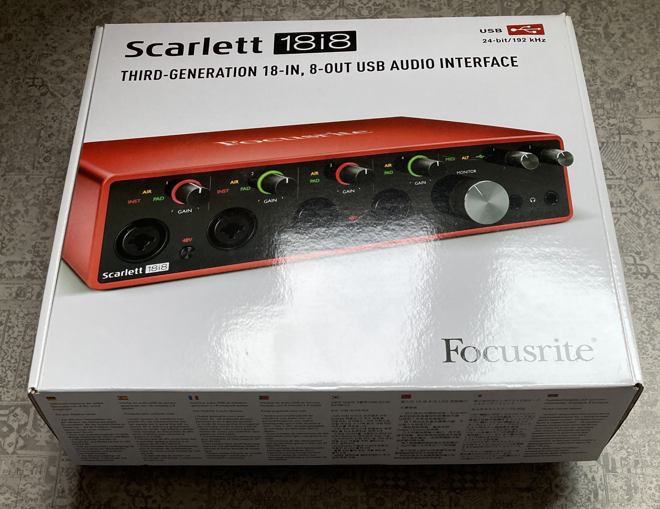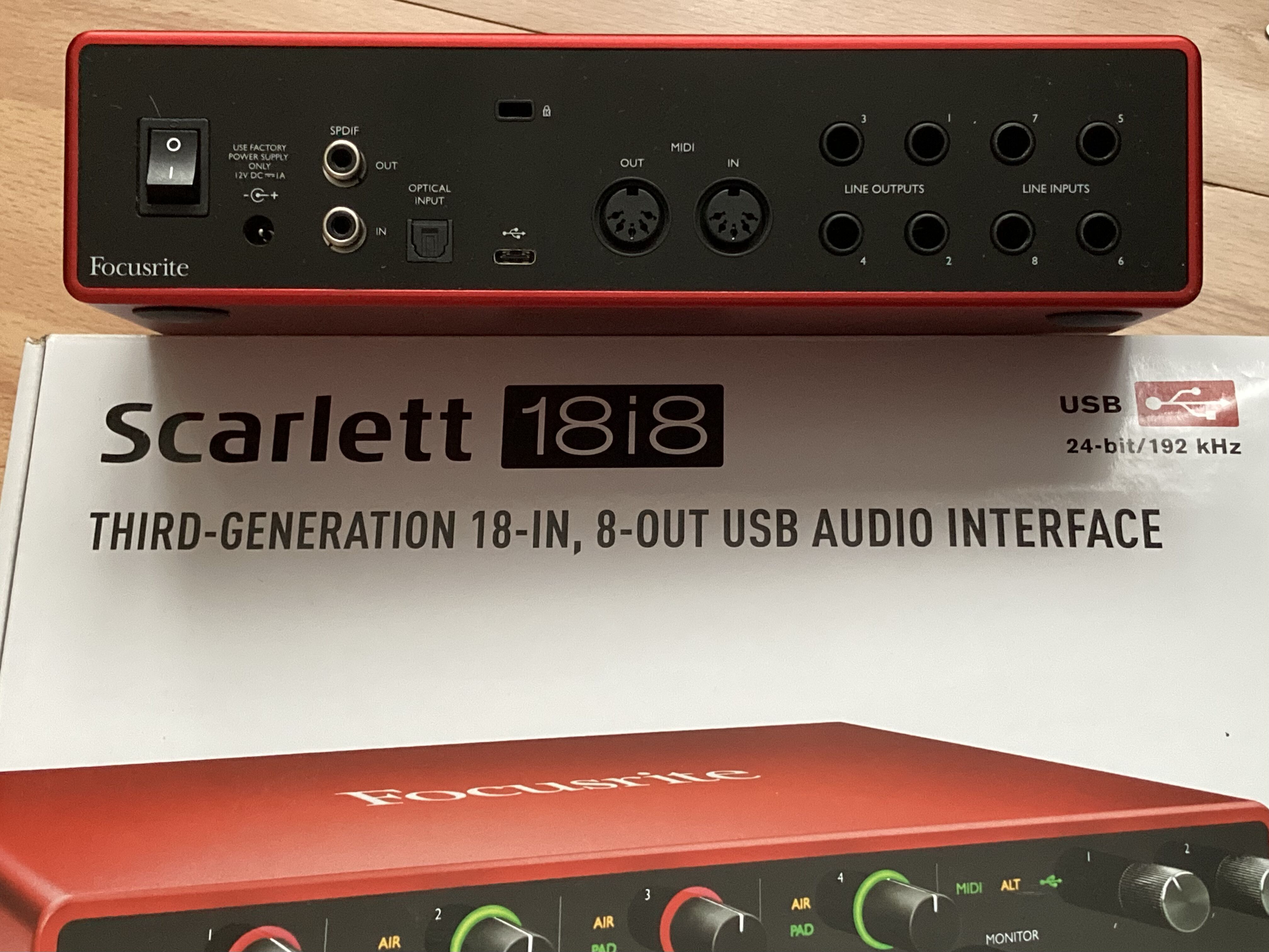 Toujours en home studio non fumeur, emploi très modéré, façades immaculées, avec boite et alimentation.En bref, 8 entrées dont 4 combos XLR/jacks, USB-C, jusqu'à 192Khz, + 10 entrées et 4 sorties optiques.