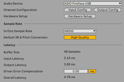 Elle est même plus stable que ma Cranborne 500R8 à 2000€ : avec mon PC sur la RME je peux utiliser le buffer minimum de 48 samples même dans un projet chargé en plugins et en instruments virtuels, la latence est presque aussi bonne que les cartes RME récentes avec seulement 4.79 ms (2.15 ms entrée et 2.65 ms sortie), et il n'y a pas de décrochages, pas d'artefacts/pops dans le son.