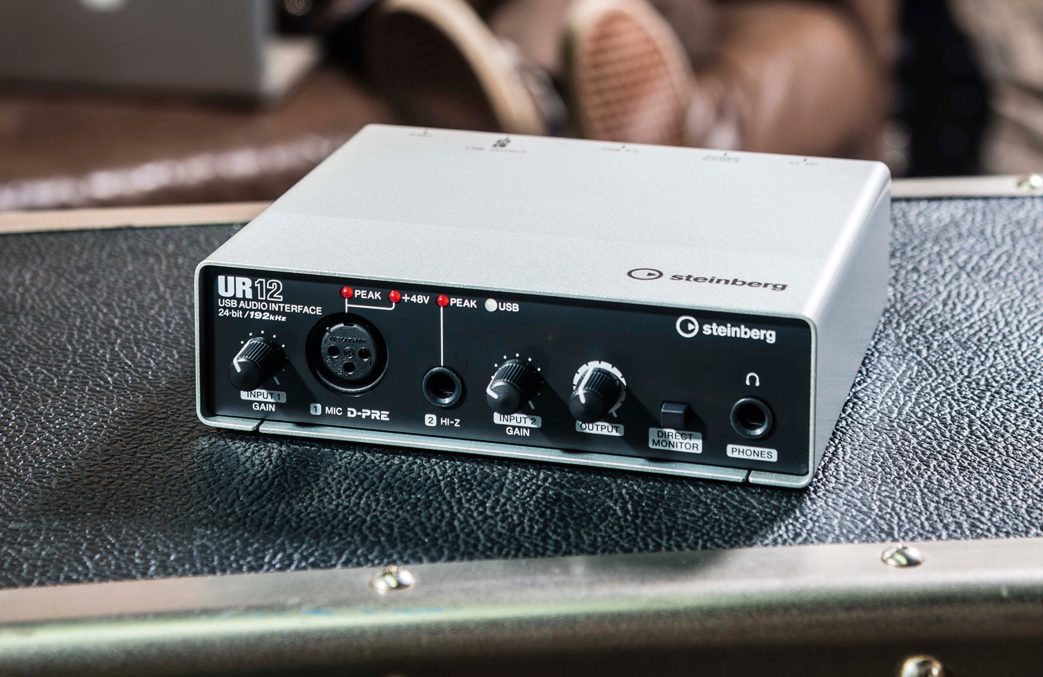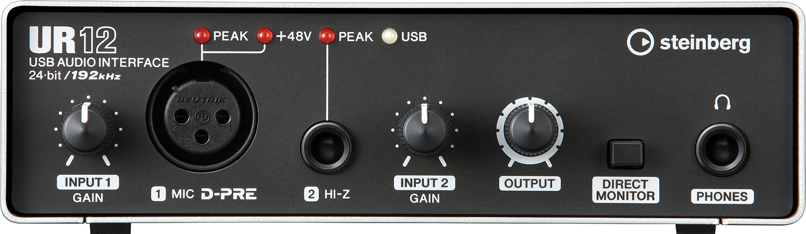 L’UR12 est une interface audio USB 2 canaux comprenant un préampli micro Yamaha D-Pre en classe A avec connecteur XLR Neutrik en façade et alimentation fantôme, une entrée instrument Hi-Z sur jack TS et deux sorties ligne sur RCA. Une sortie casque est également disponible pour le monitoring direct. Steinberg annonce la présence d’une fonction de loopback si vous souhaitez utiliser l’interface pour faire du broadcasting en live sur internet.