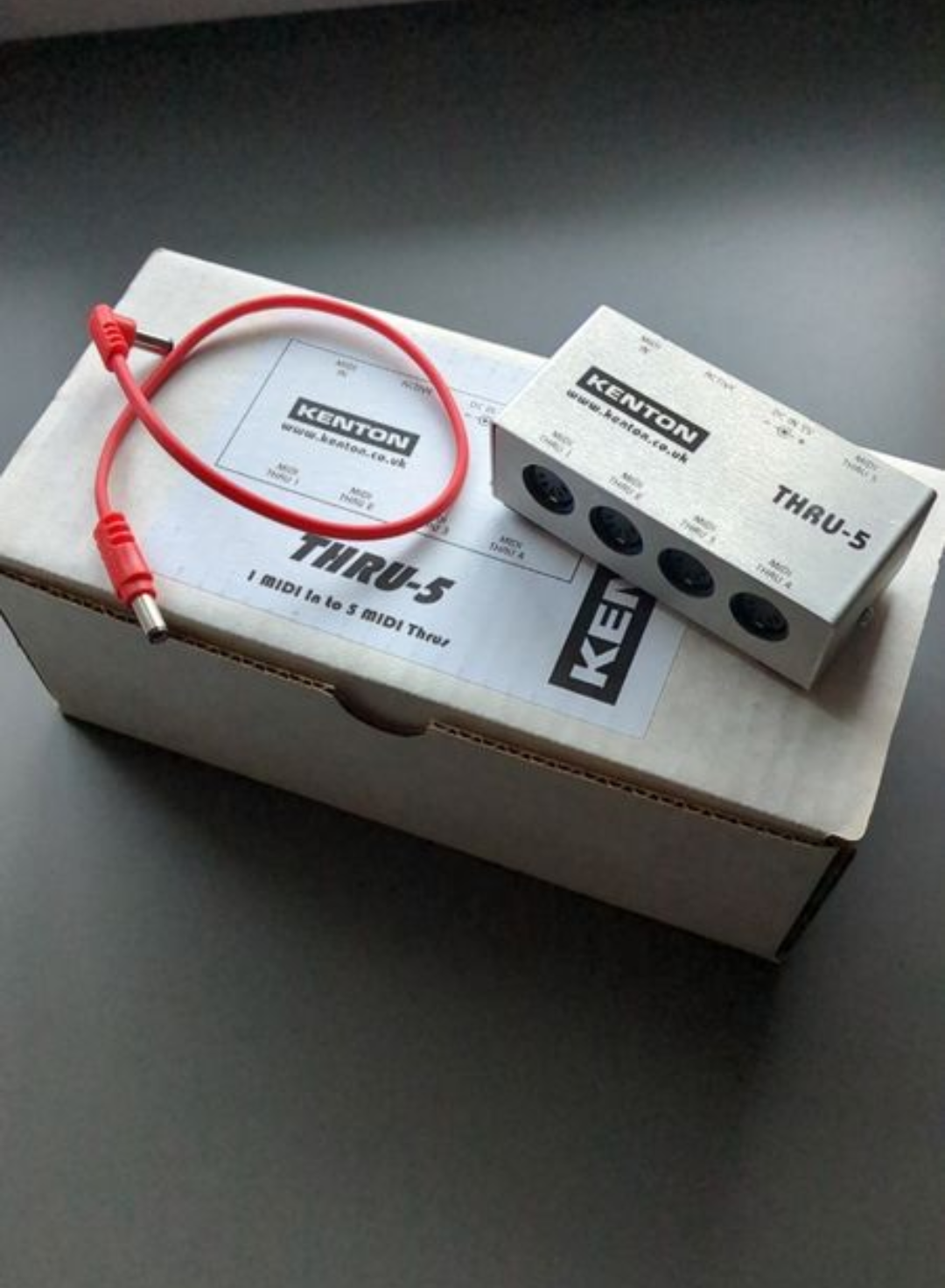 Je vends ce boîtier MIDI Kenton Thru 5 pour piloter du matériel midi comme des effets, des synthés et autres claviers. 1 entrée et 5 sorties. Avec câble d'alimentation spécifique (inversé) pour se brancher sur une sortie alimentation d'effets 9v.- Type de produit : Boîtier MIDI