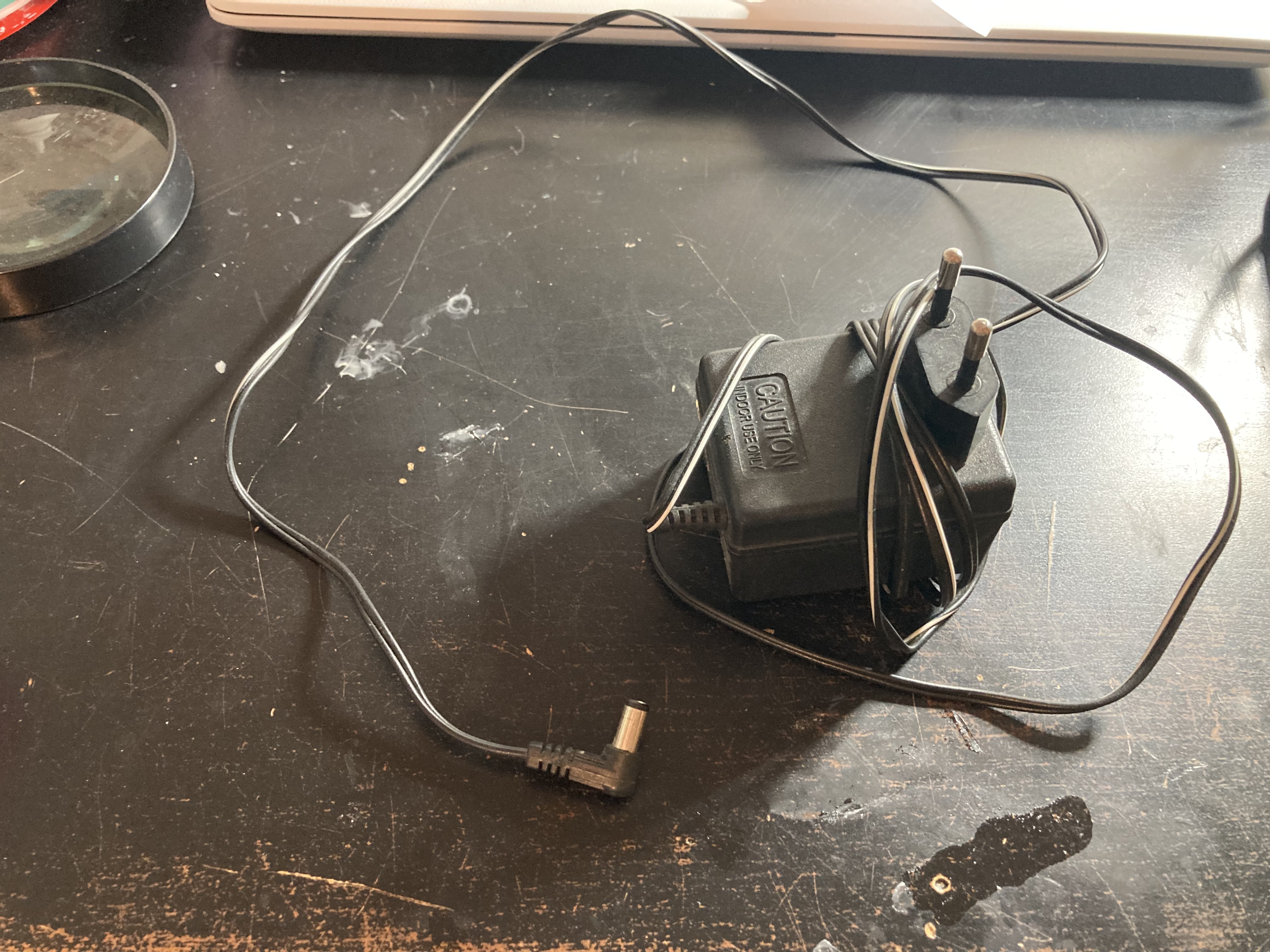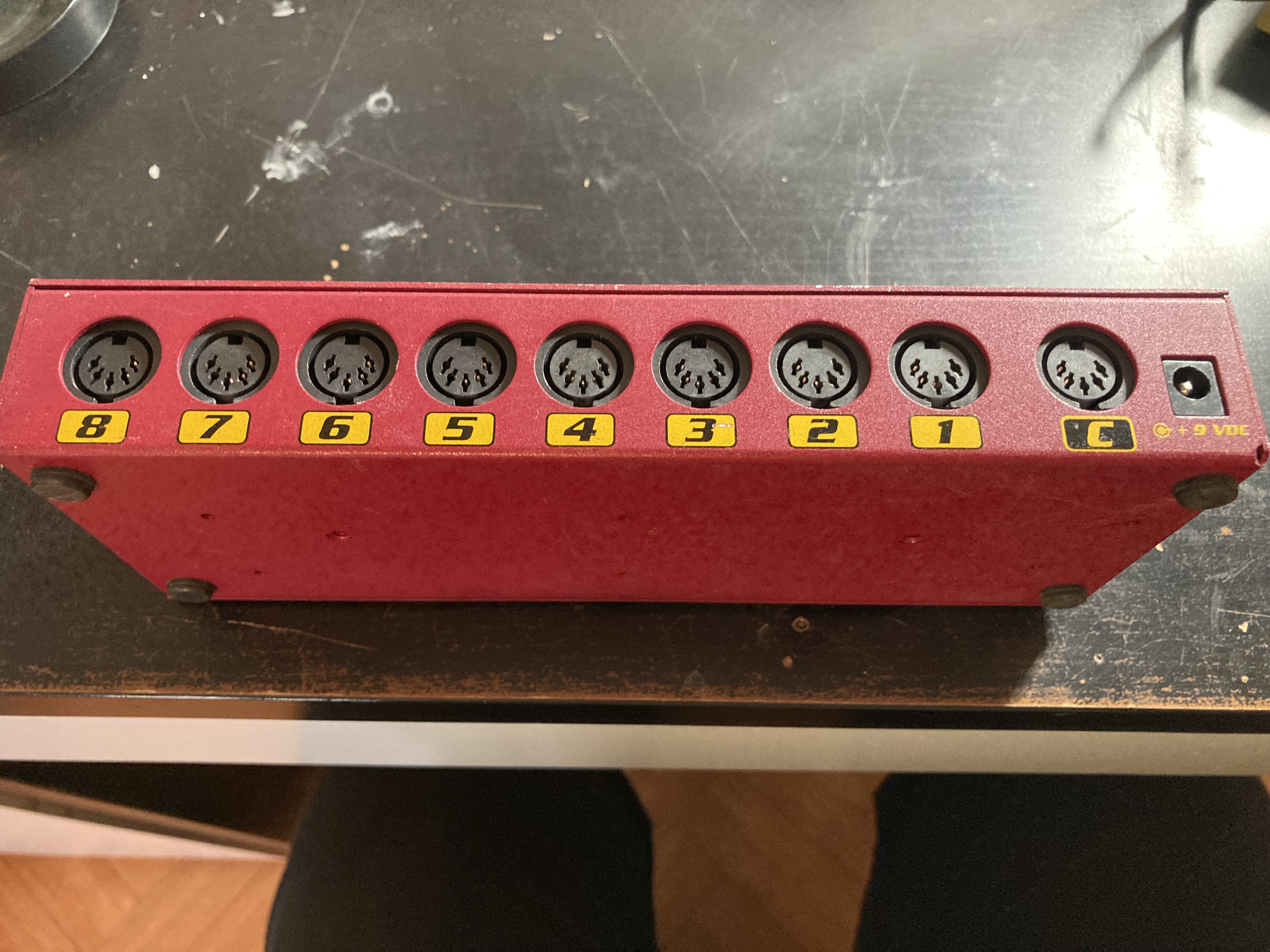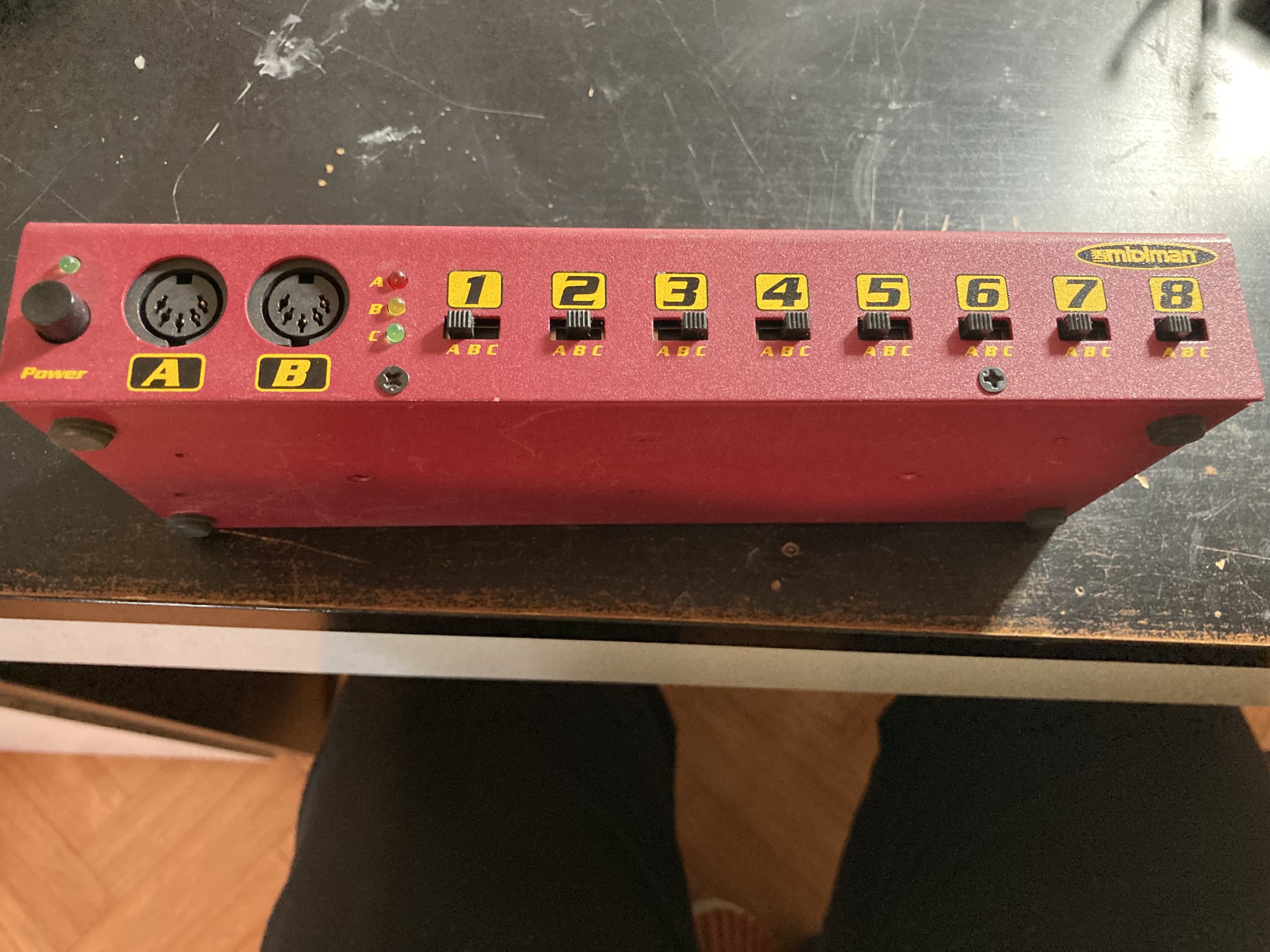 Interface midi avec 3 entrées midi (À, B et C) et 8 sorties.En façade 8 commutateurs 3 positions pour choisir l’entrée (À,B ou C) et un bouton power.