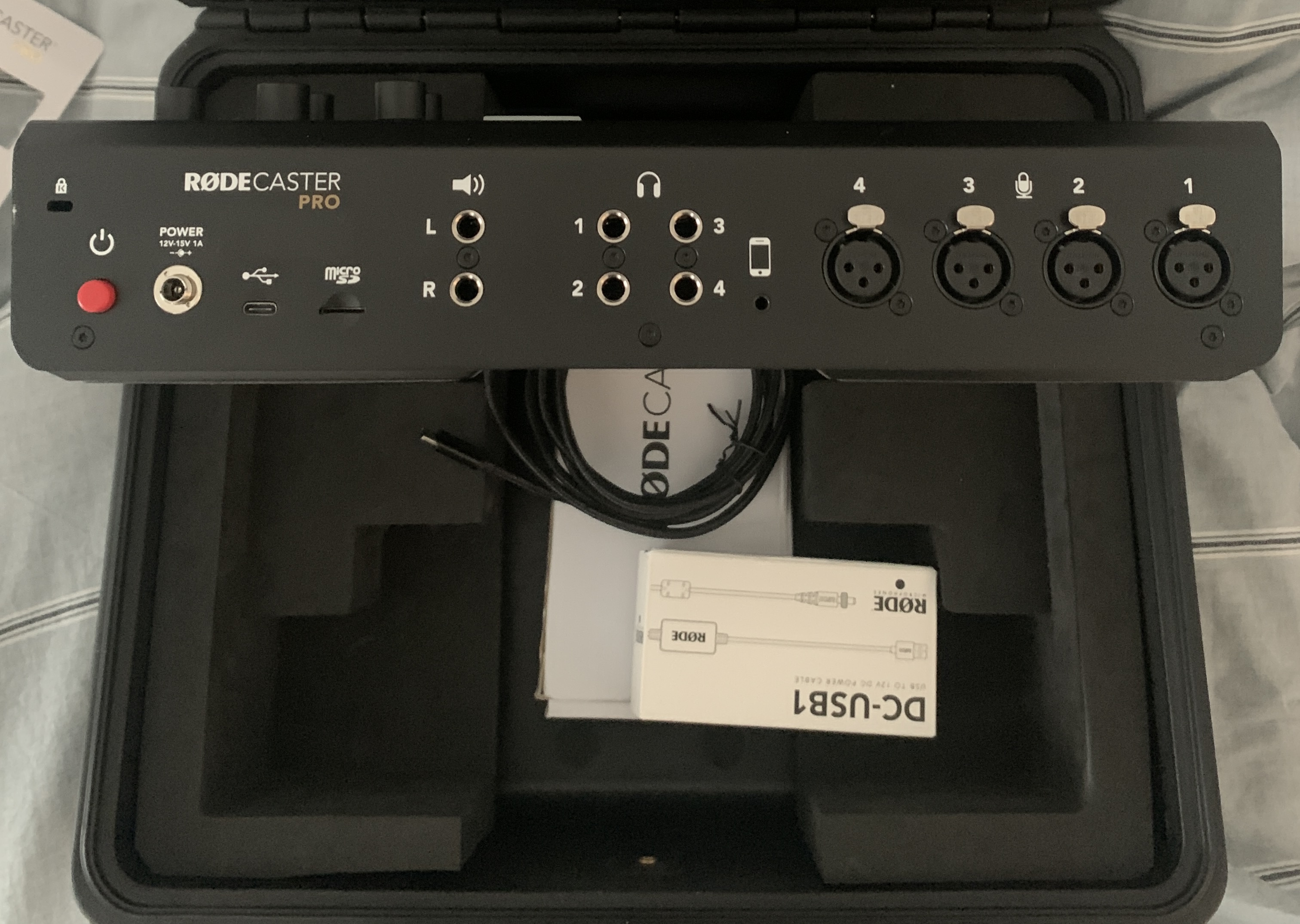 1 adaptateur Rode DC-USB1 qui permet d'alimenter le Rodecaster Pro avec une Powerbank USB ( donc totale autonomie-mobilité )
