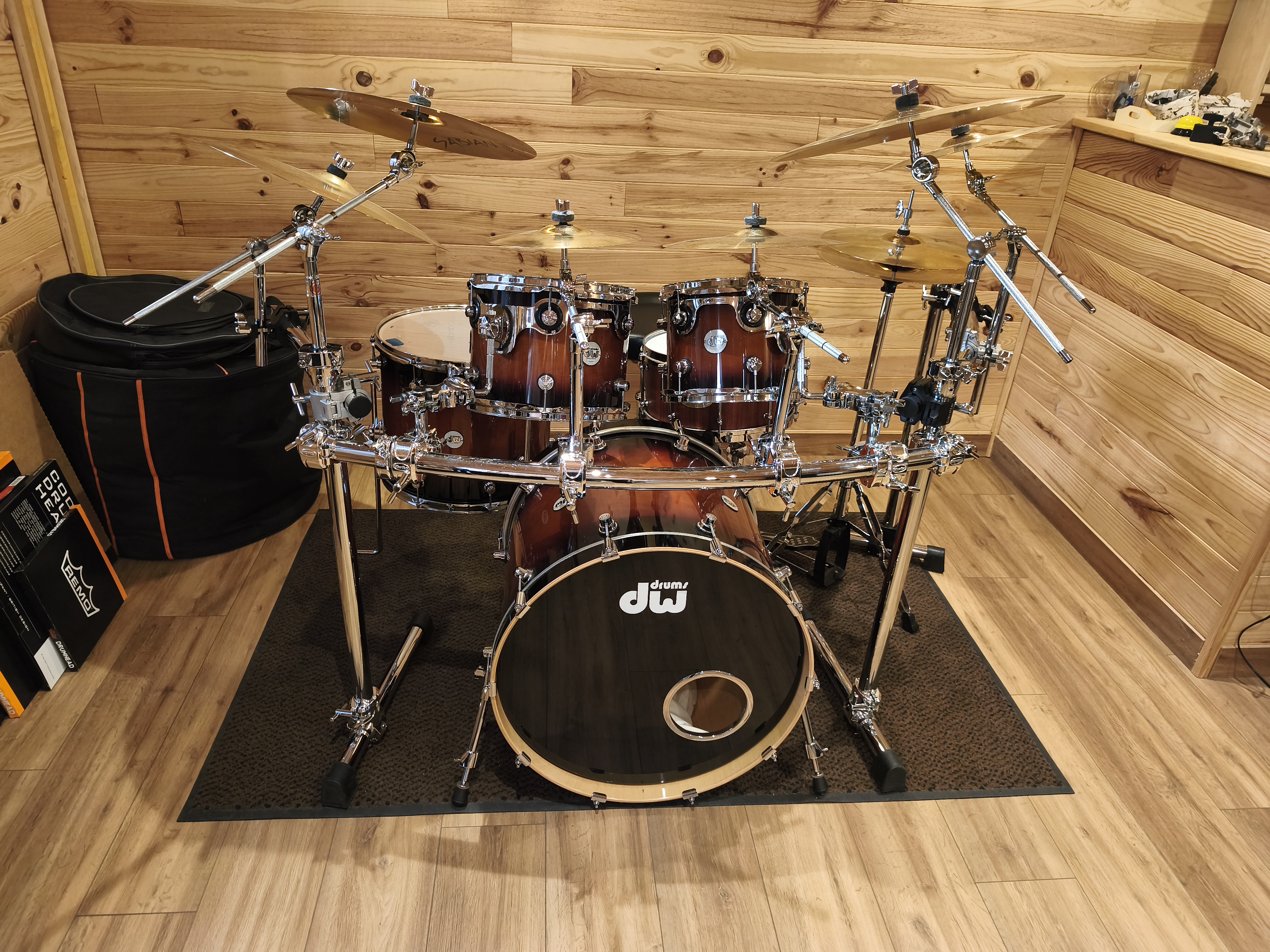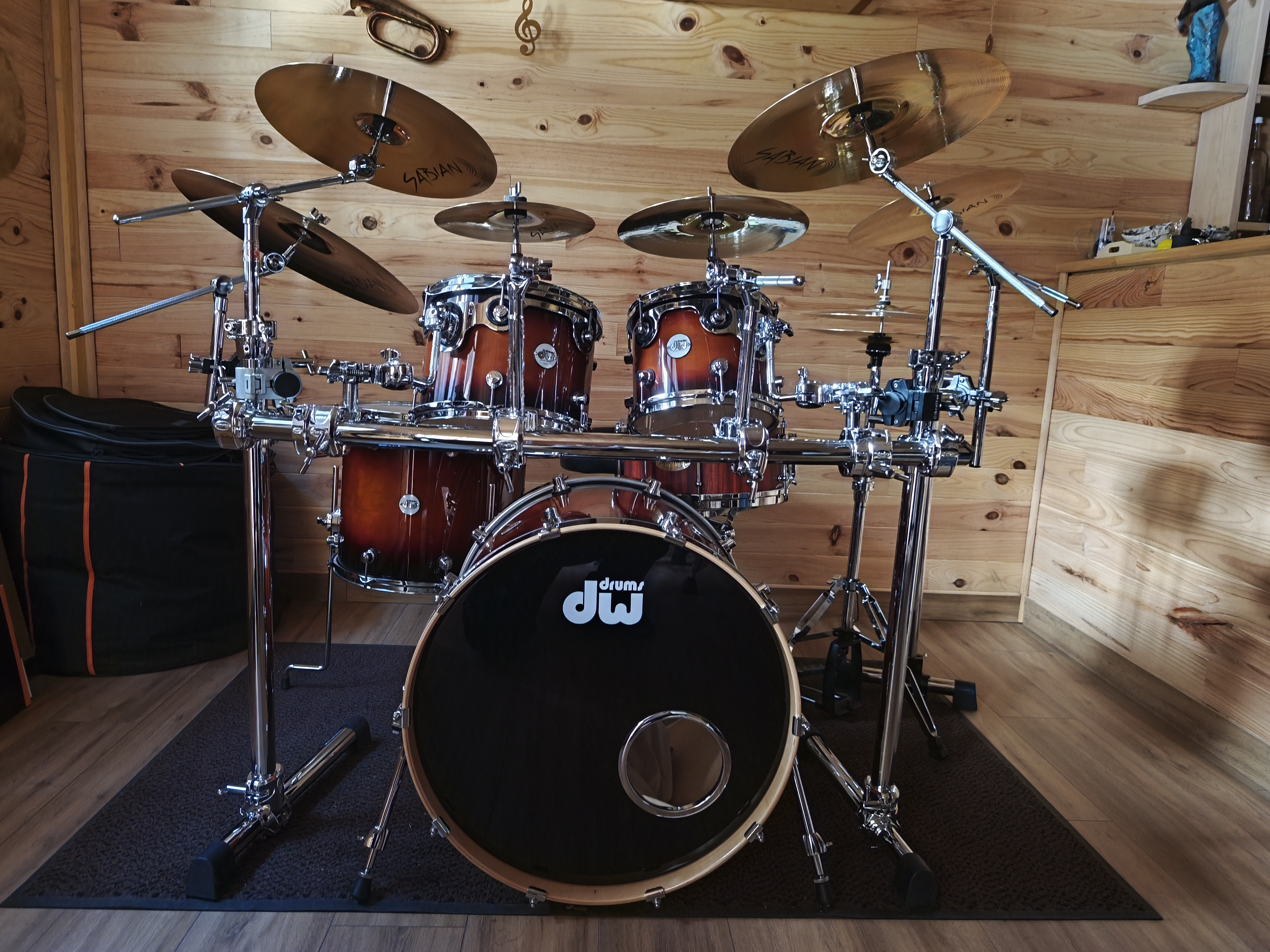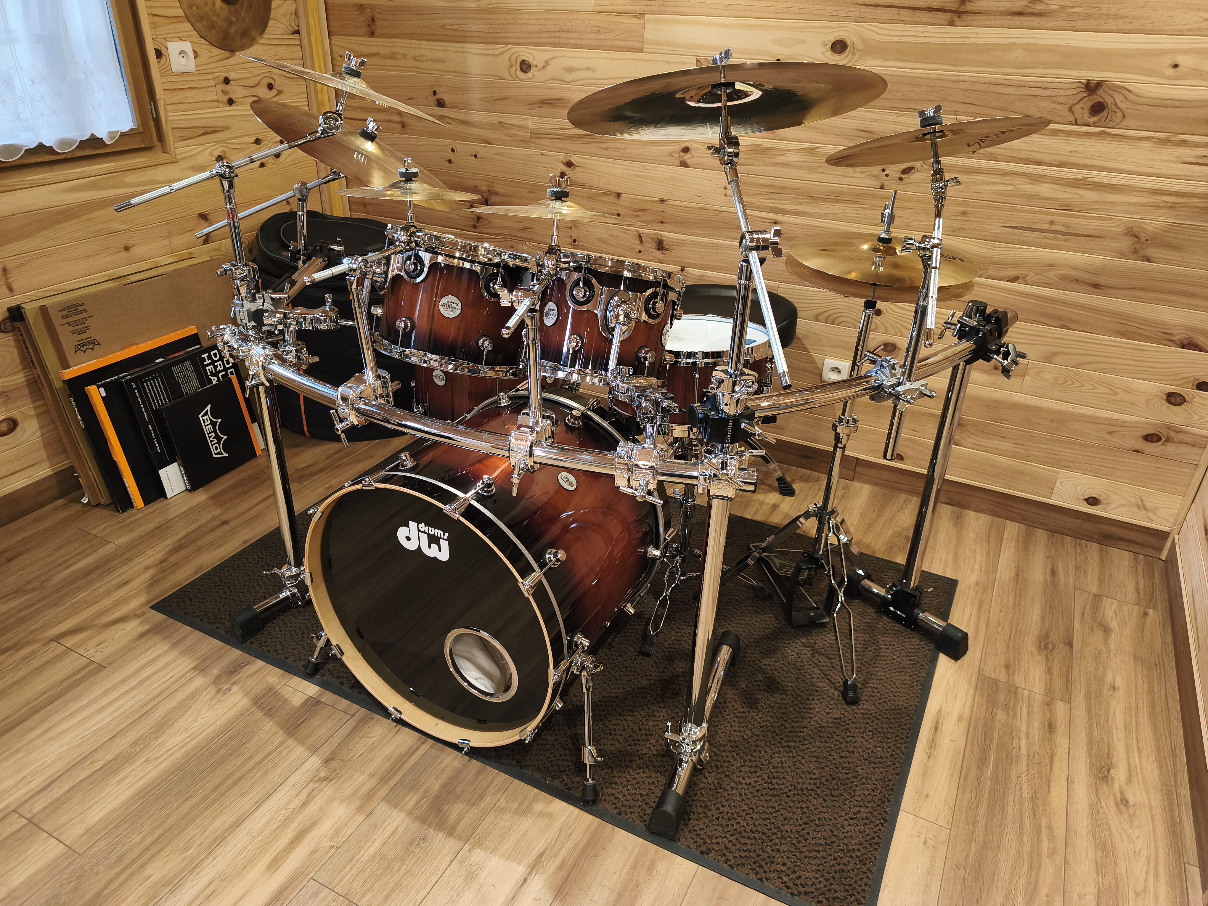 Set de futs DW DESIGN Tobacco burst 22x18"BD, 10x8"TT, 12x9"TT, 16x14"FTCaisse claire CUSTOM SHOP PADOUK 14 x 6.5