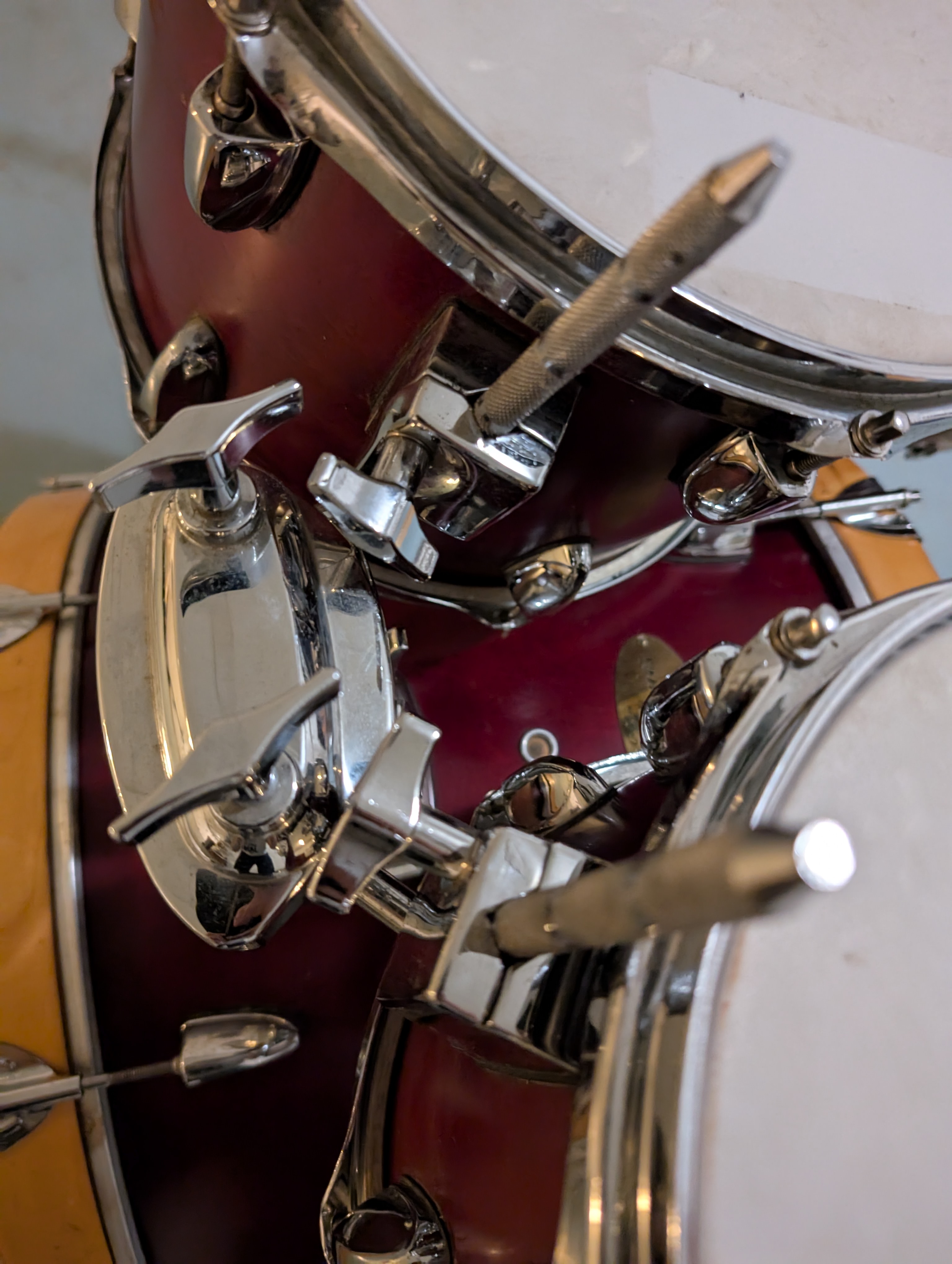 - les vis de serrage des trois toms (photos 7 et 8) ne se serrent plus assez pour tenir durablement les toms qui redescendent avec le temps, pour pallier ce soucis je rajoute une épaisseur autour de la tige à serrer.