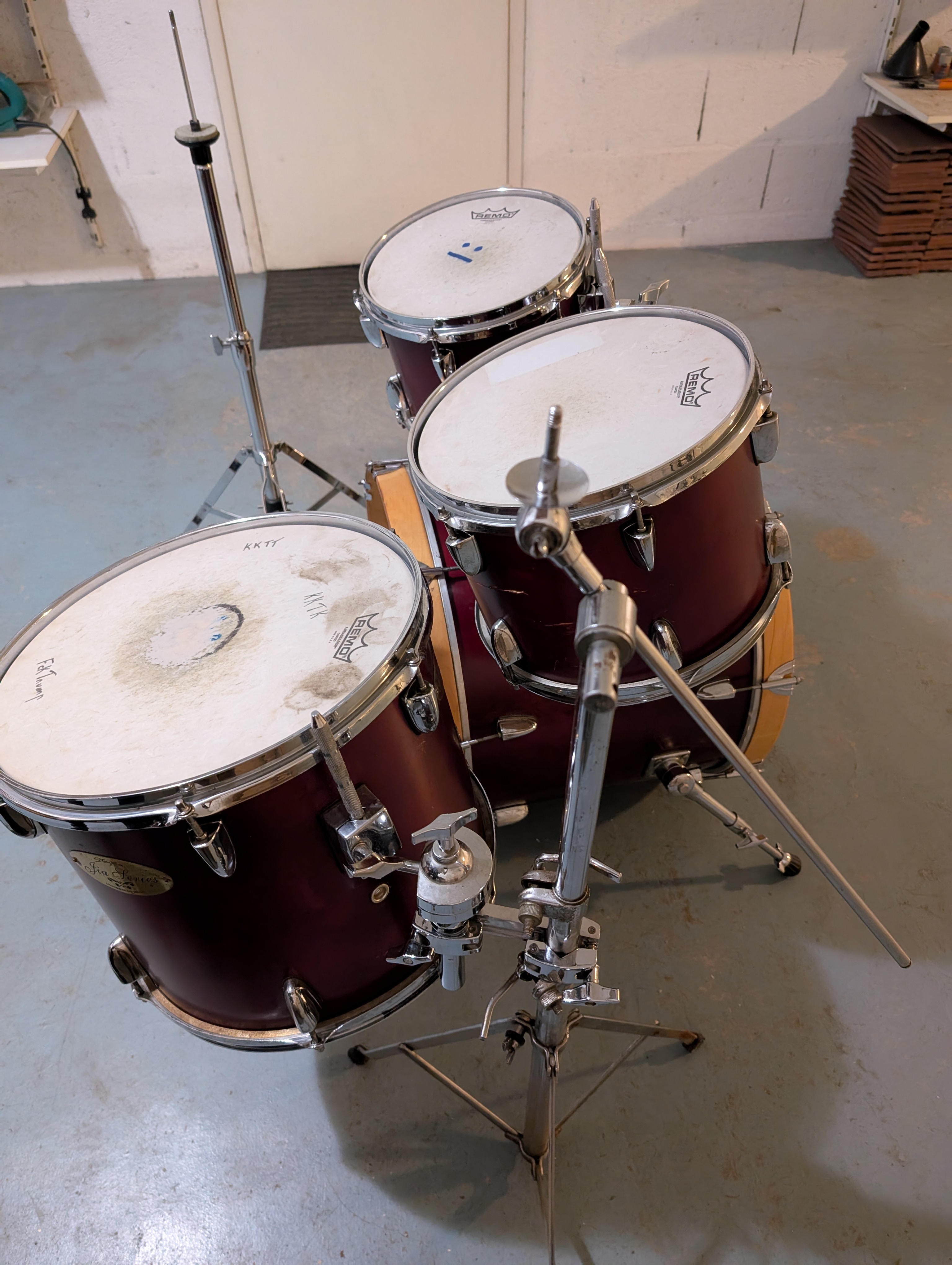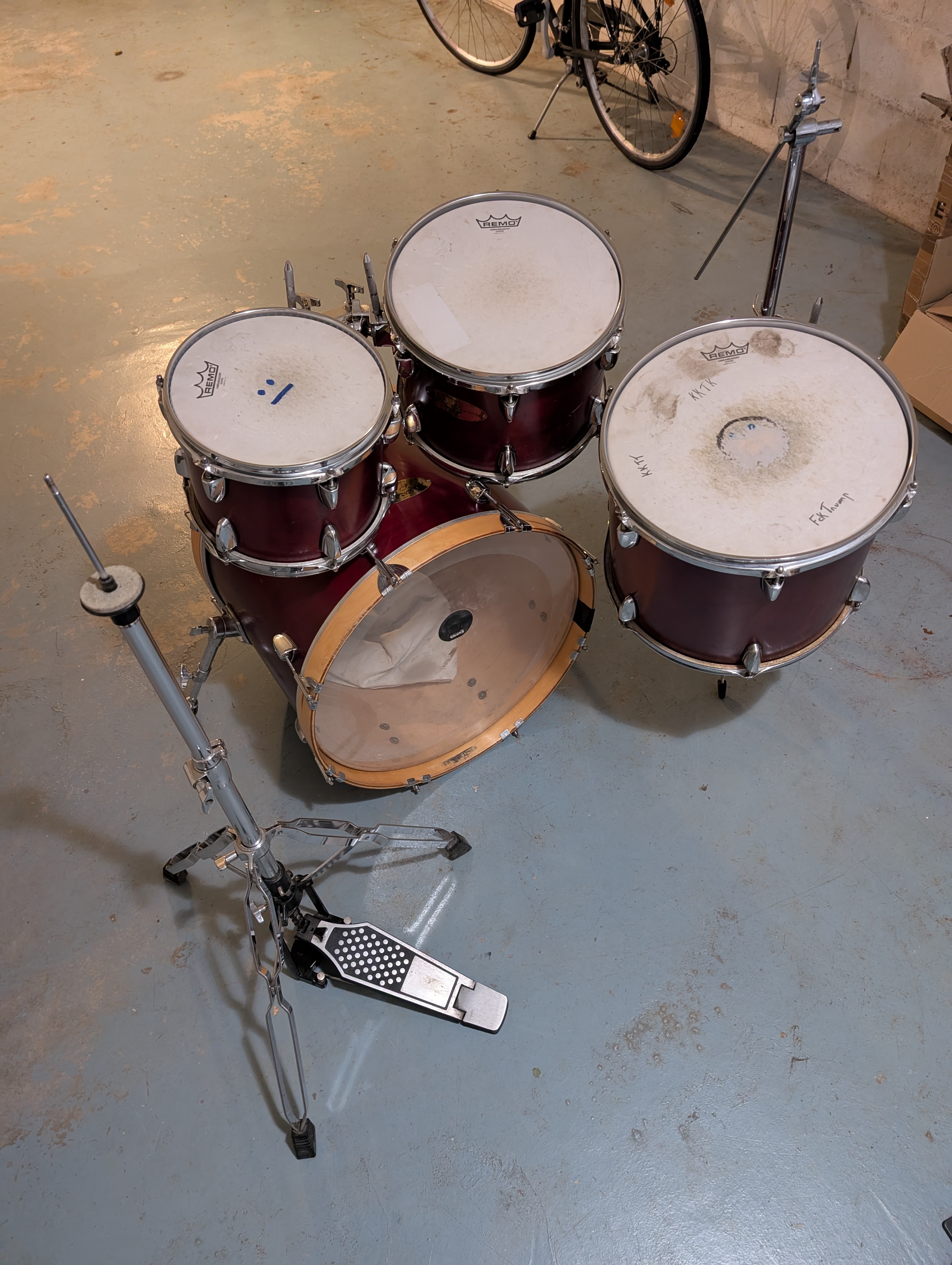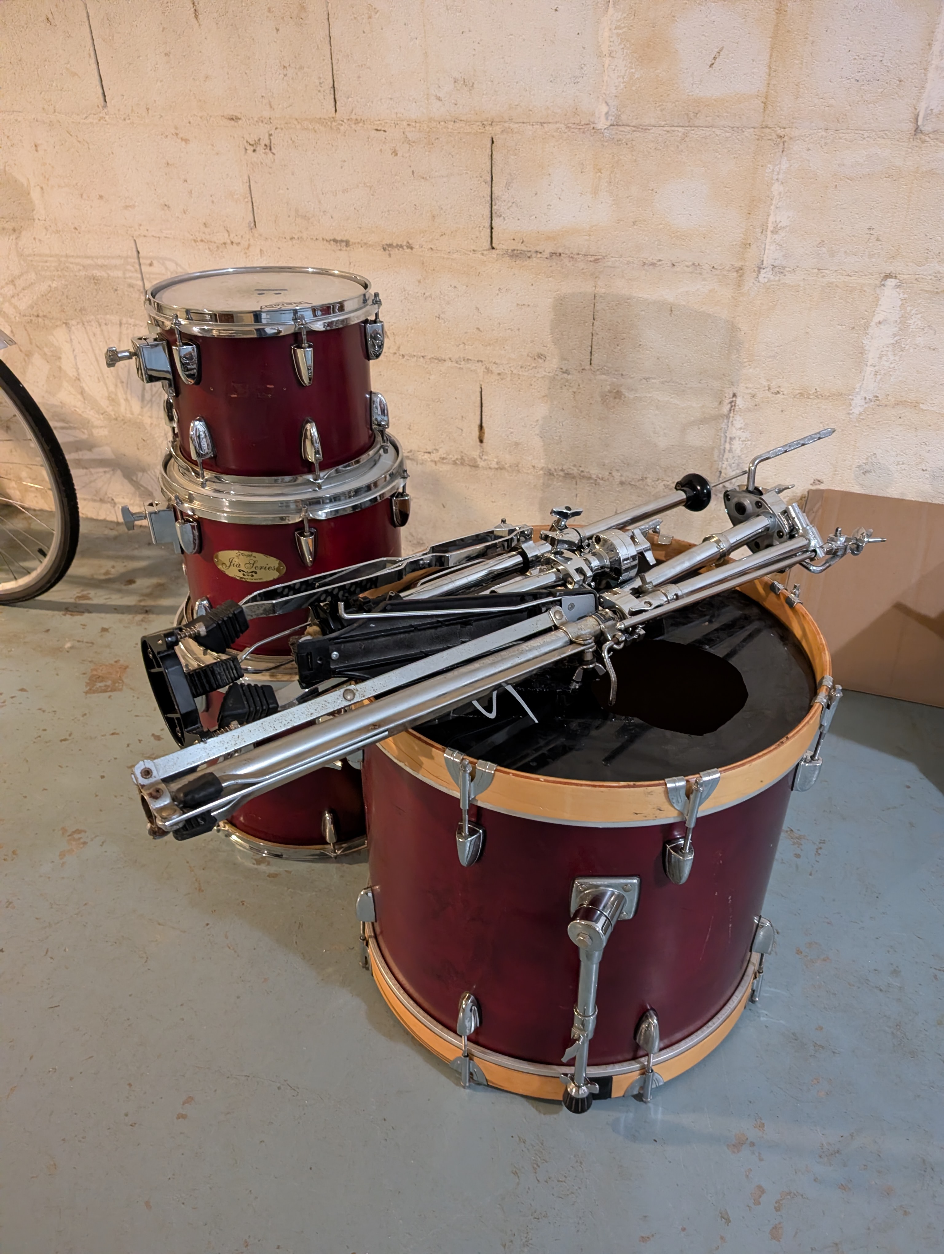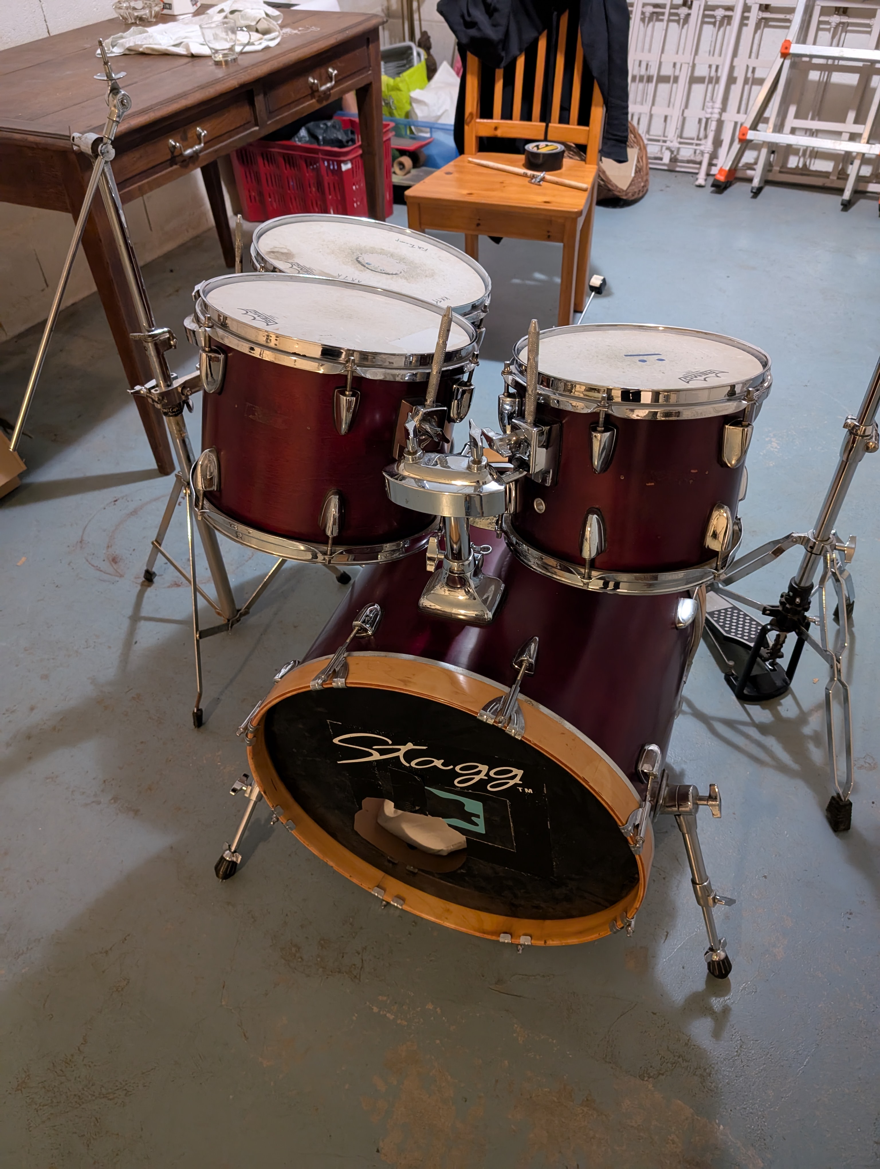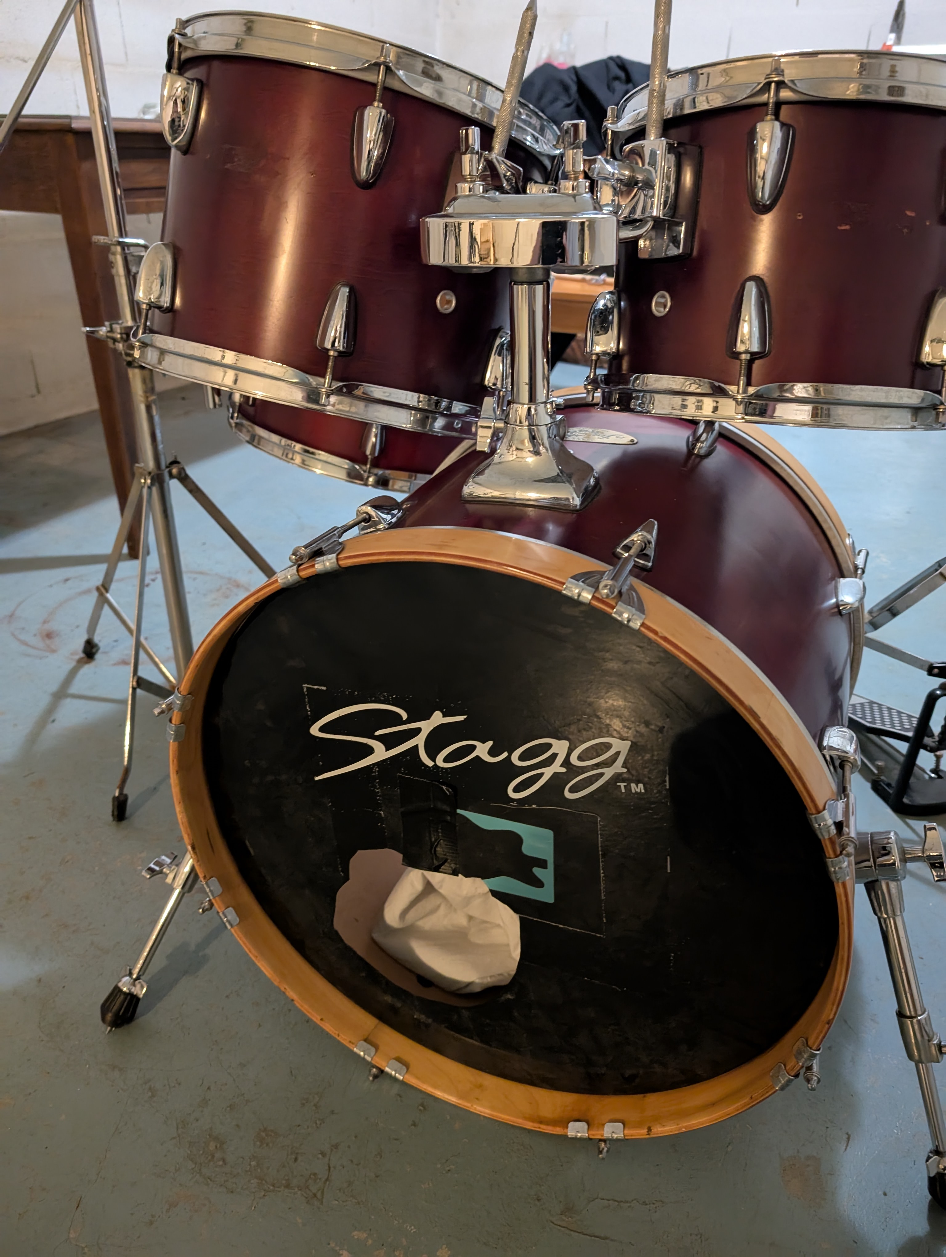 Je vends une batterie de marque Stagg, format 20-10-12-14, en bon état côté fûts (j'ai tout nettoyé récemment), les peaux sont fatiguées mais encore utilisables.Vendue avec un pied de hi-hats et un pied de cymbale qui fait aussi support de tom basse à l'aide d'un clamp.