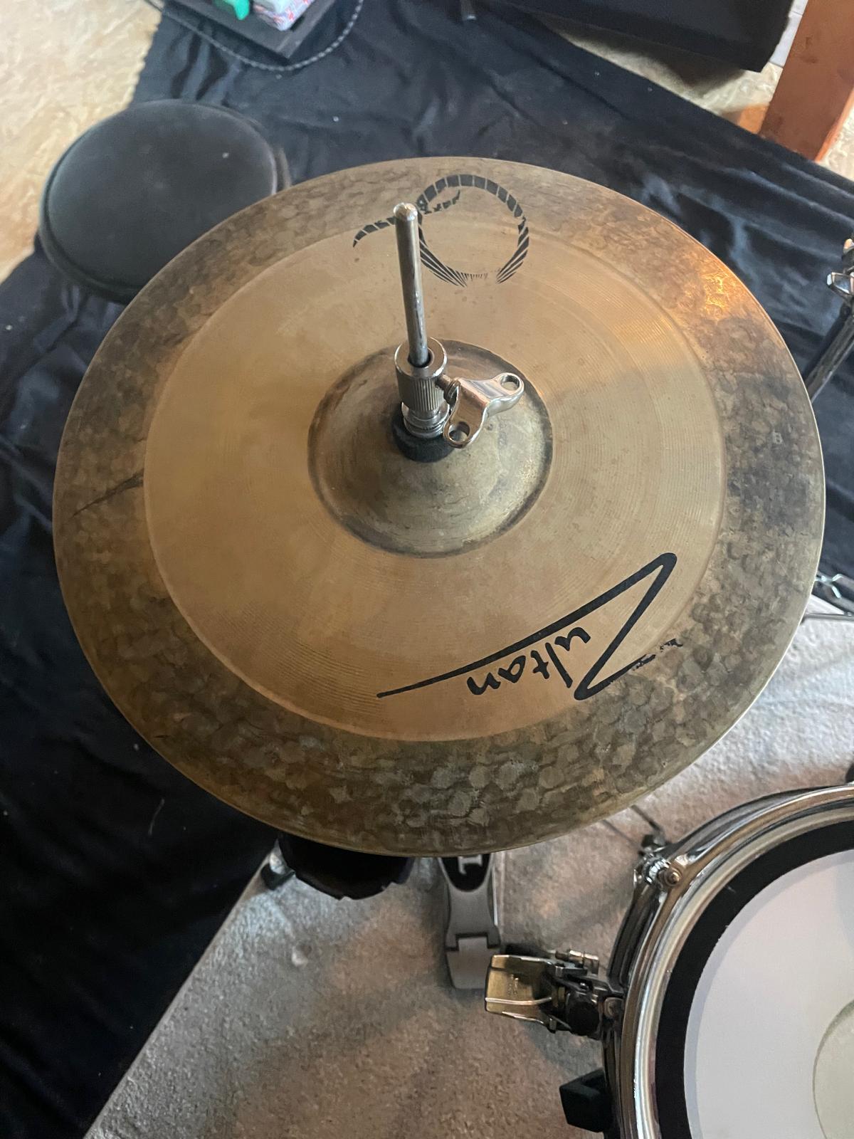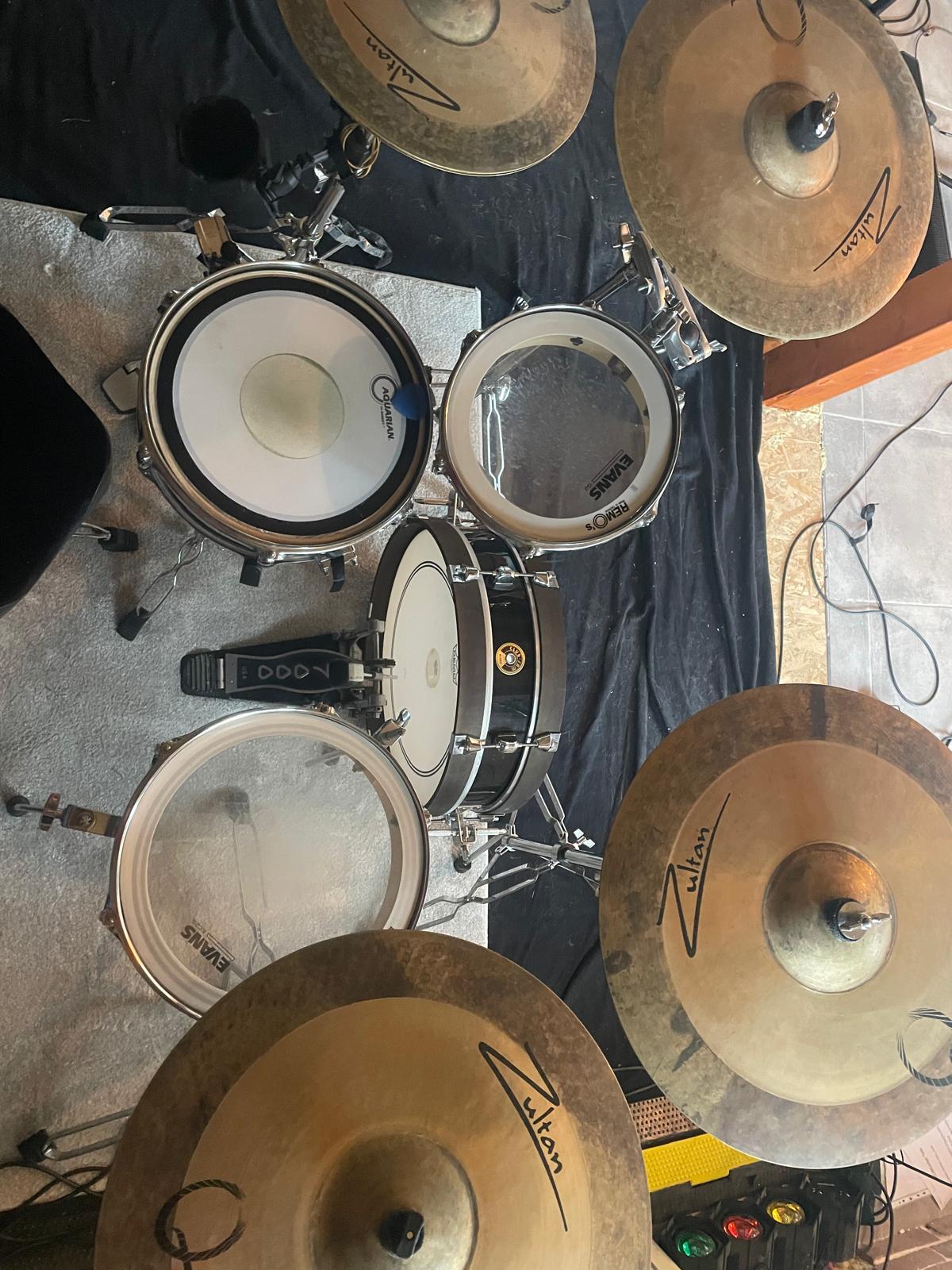 A vendre Tama Club Jam Pancake COMPLETE. Avec housse de toms. 3 pieds cymbales perche, pieds charleston et caisse claire Tamburo.Set de 4 cymbales Zultan série Q : charle 14" , crash 14", crash 16" et ride 20".