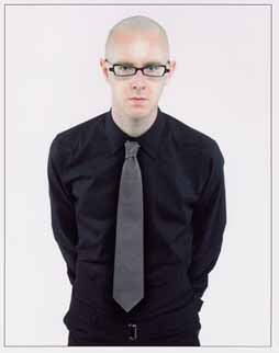 Citation : Genre crane rase avec des lunette noires rectangulaires a la richie hawtin habillé tout en noirs