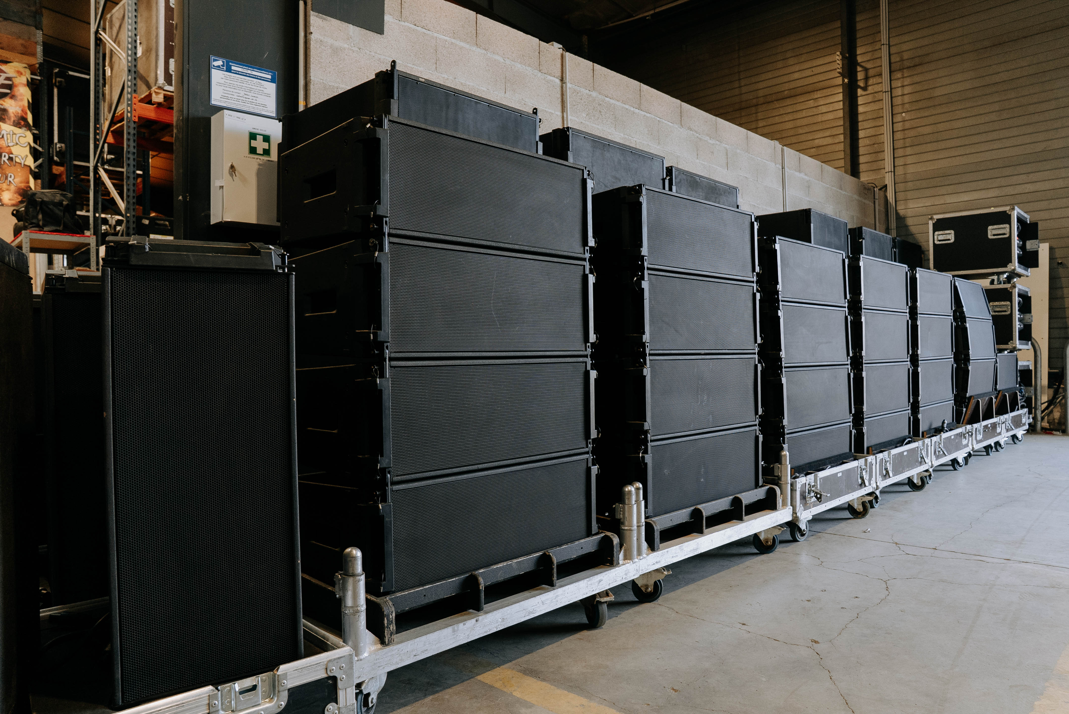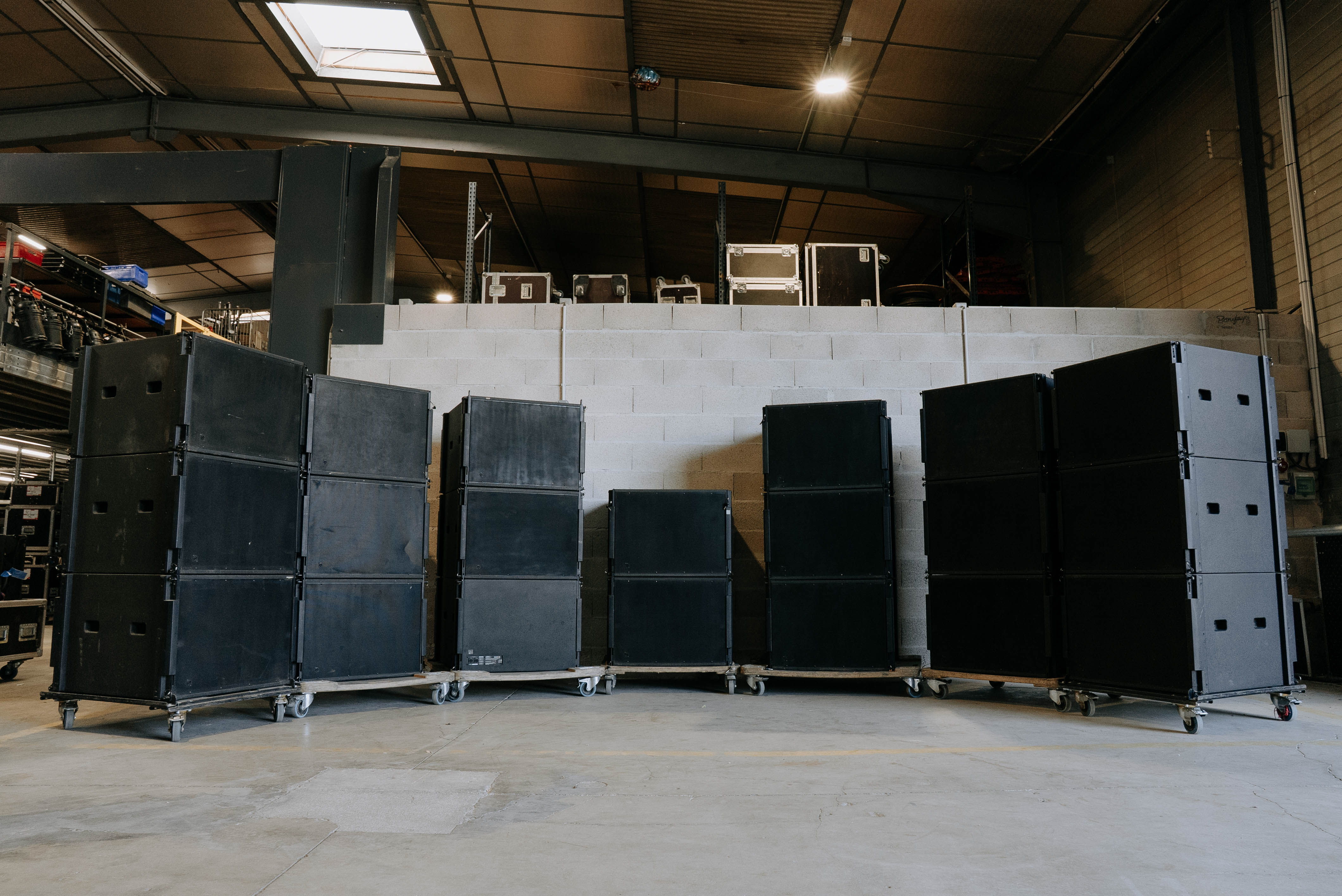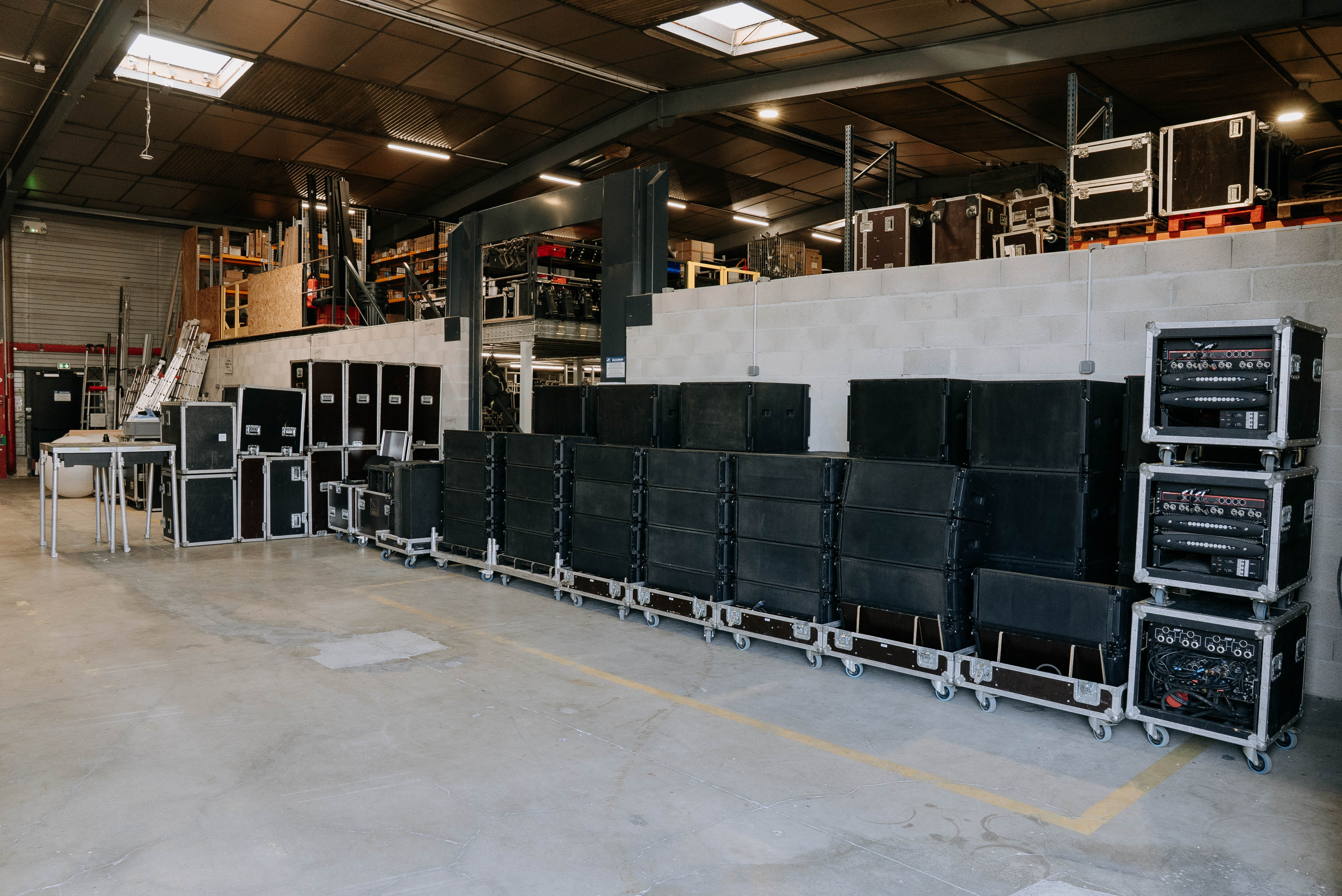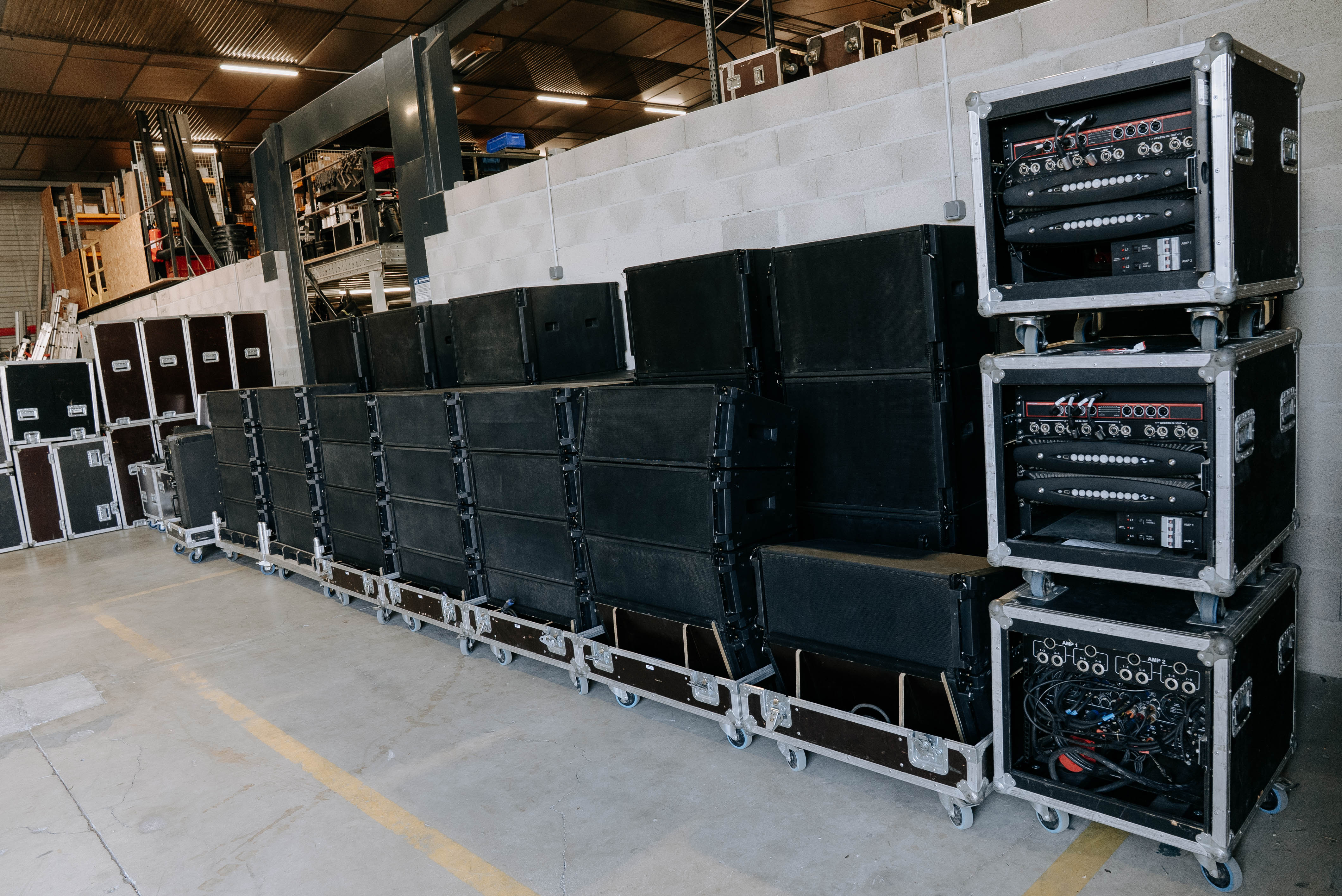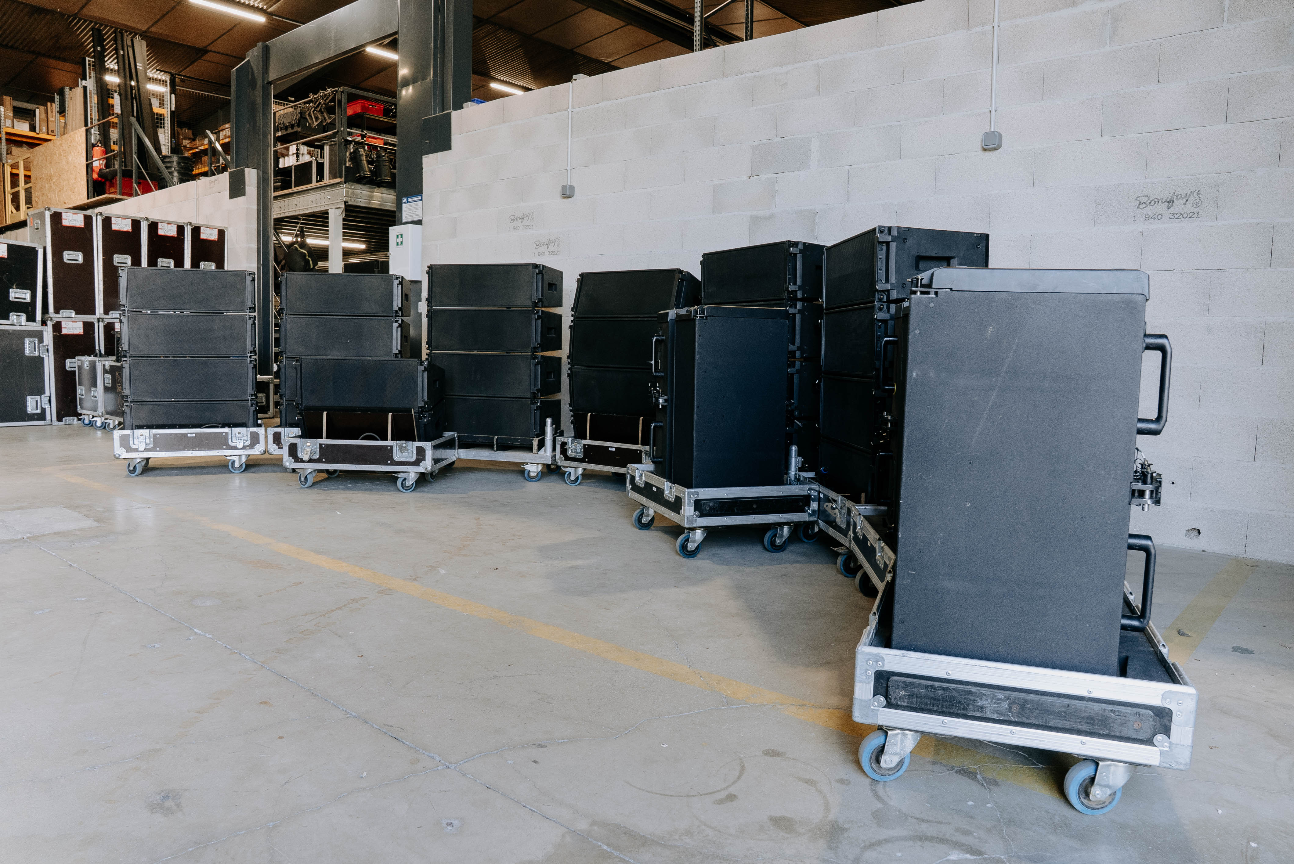 Subs montés en stacks de 3 sur plateaux roulants flyés