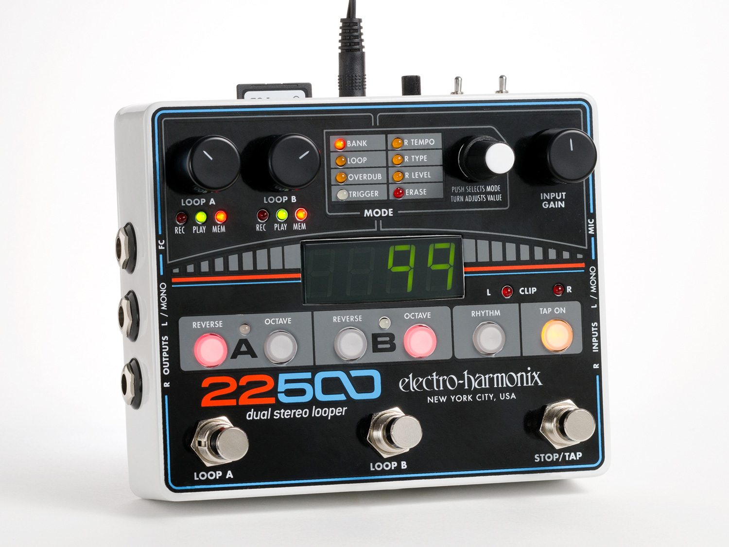 La nouvelle pédale 22500 permet de jouer deux boucles en même temps, en parallèle ou en série, avec un option de quantisation. Electro-Harmonix fournit une carte SD de 8 GB pour que vous puissiez enregistrer jusqu’à 12 heures de boucles.