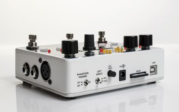 La 22500 peut opérer en mono ou stéréo ; l’entrée gauche/mono permet de brancher un instrument ou un micro, grâce aux connexions jack 6.35 mm et XLR avec alimentation fantôme et contrôle du gain séparé du micro. Un port USB servira à faire des sauvegardes/restauration sur un PC ou un Mac et Electro-Harmonix fournit l’alimentation 9.6V AC. Vous pourrez compléter le 22500 avec un contrôleur au pied pour sélectionner les banques mémoire.