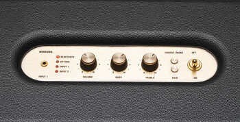 Le Woburn présente un panneau de contrôle sur lequel vous choisirez le type d’entrée parmi celles pré-citées, mais aussi des potards de volume, basses et aigus.
