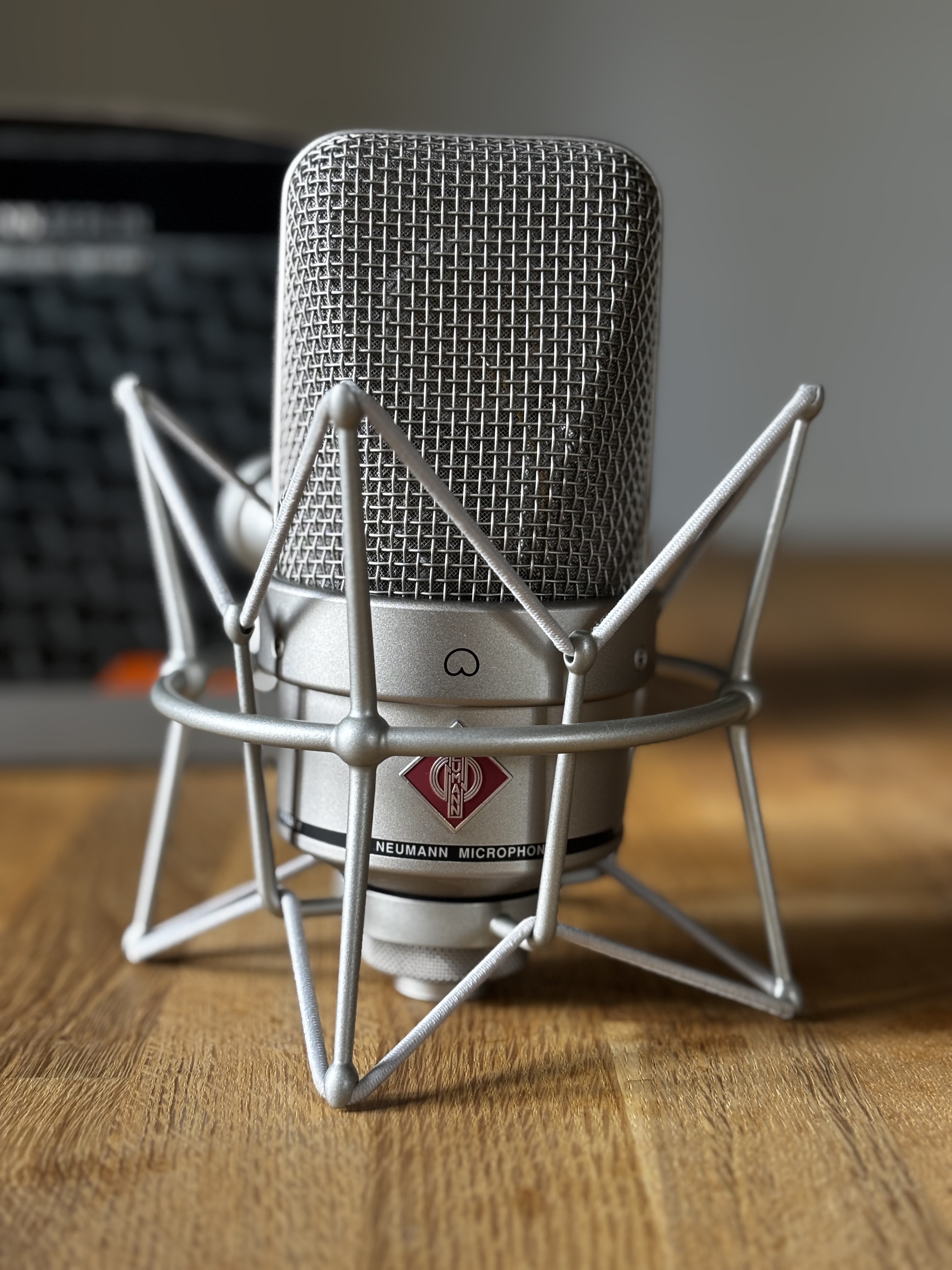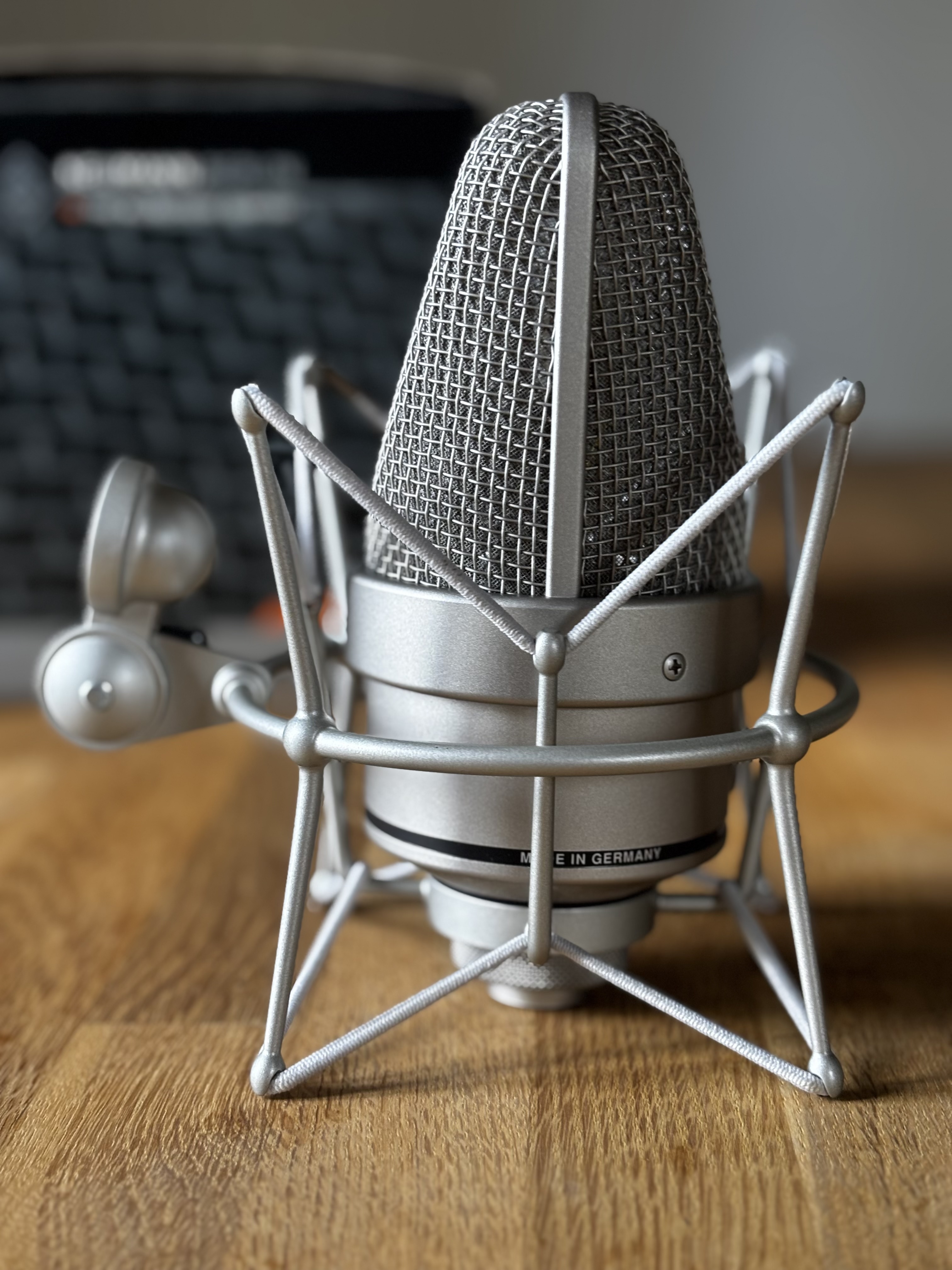 Microphone de studio, look rétro. Son d'une grande chaleur, optimisé pour l'enregistrement de voix. Utilise la même capsule que les modèles légendaires M 49 et U 47.