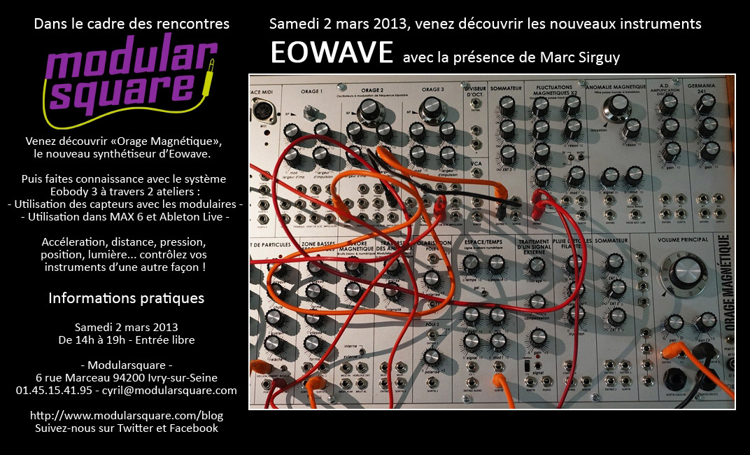 Marc Sirguy viendra présenter les nouveaux instruments Eowave qui sortiront en 2013, et notamment le synthé modulaire Orage Magnétique, et animera deux ateliers autour du système Eobody 3 et de ses capteurs :