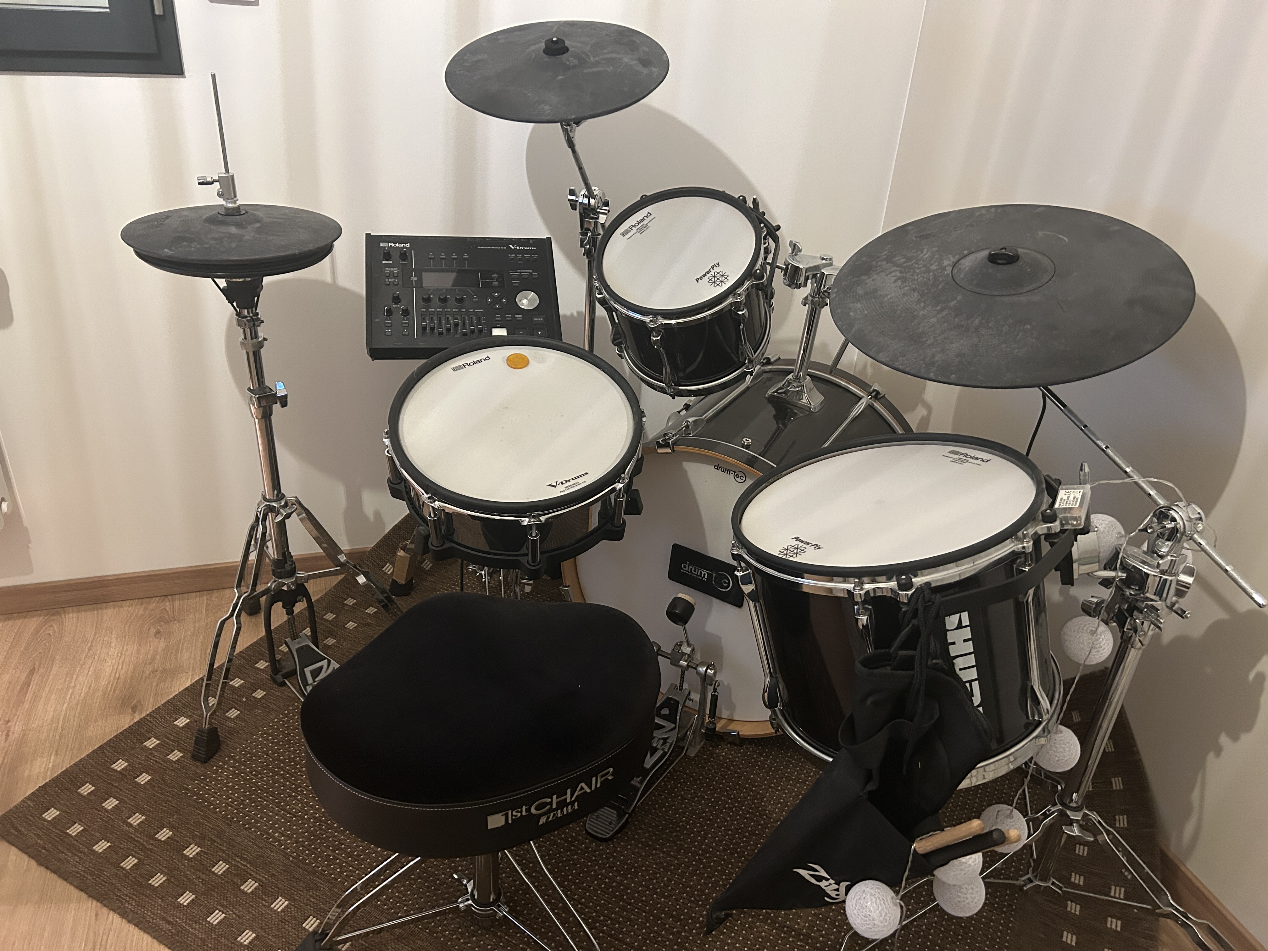Possibilité de vendre le tout avec le stand PDS-20 + une batterie acoustique transformée en numérique (capteurs internes JOKEBI) et peaux Drumtec Power Ply 3pli, 1 GC 22X18, 3X TOMS 10X12, 12X13 et 14X14 + 1X cymbale CY-14C hardware (stand HI HAT, 2 stands de cymbale et pédale de GC, sans siège) pour 3500 euros.