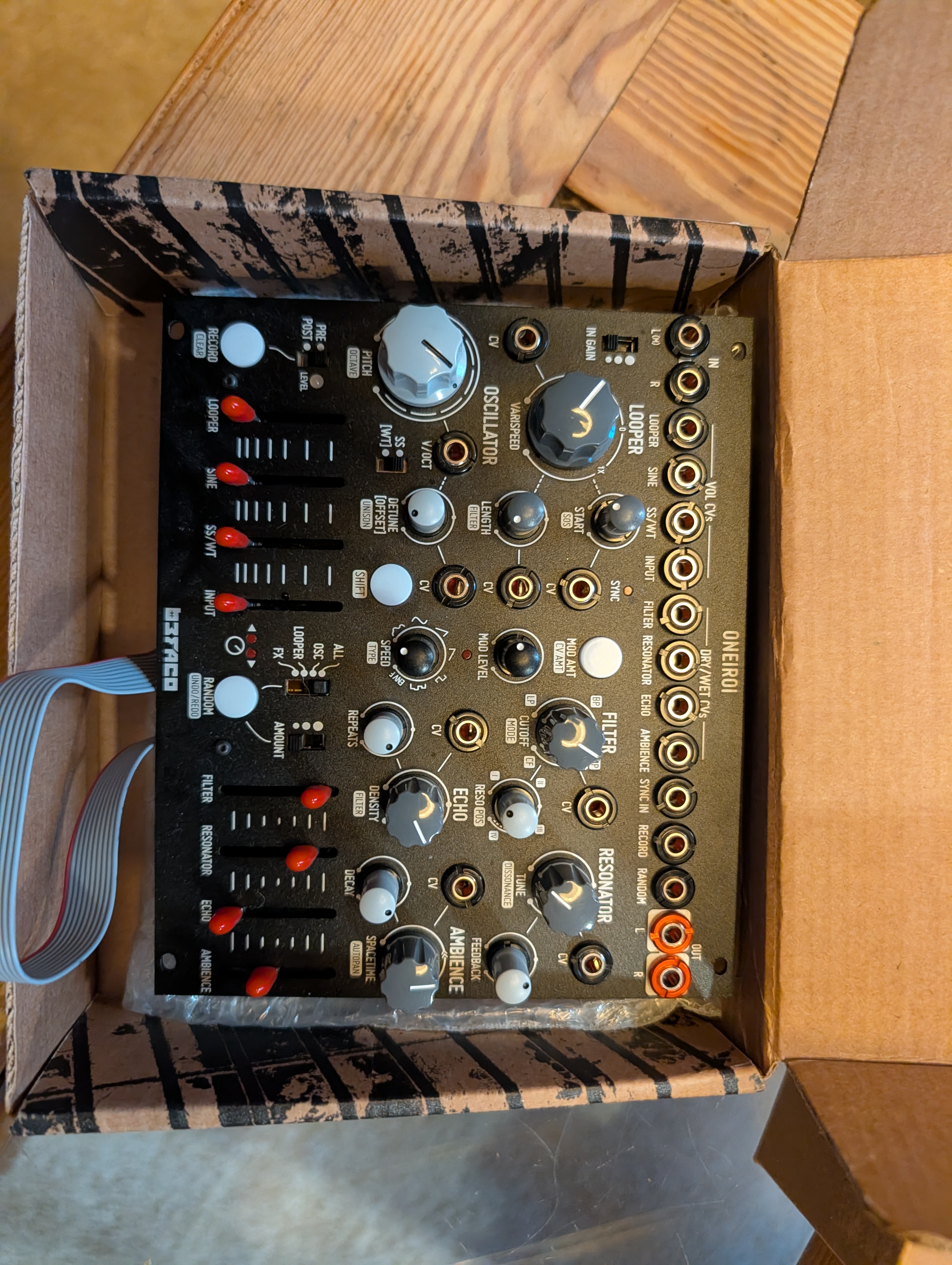 Globalement c'est finalement un module assez simple: un oscillo avec deux formes d'ondes mélangeables: une sinus et une supersaw, un looper basique qui peut jouer à l'envers, une entrée audio pour y balancer tout ce qu'on veut.