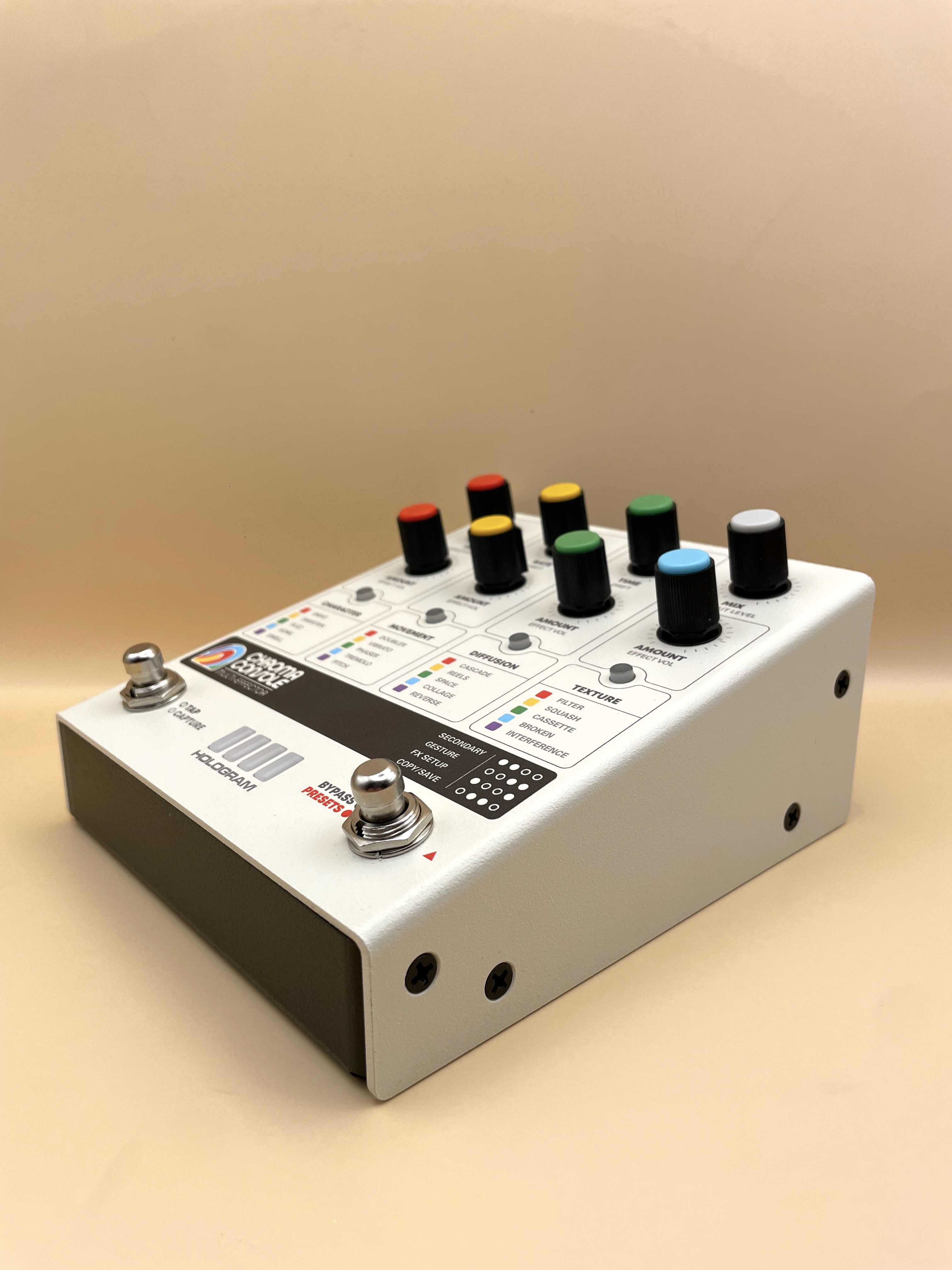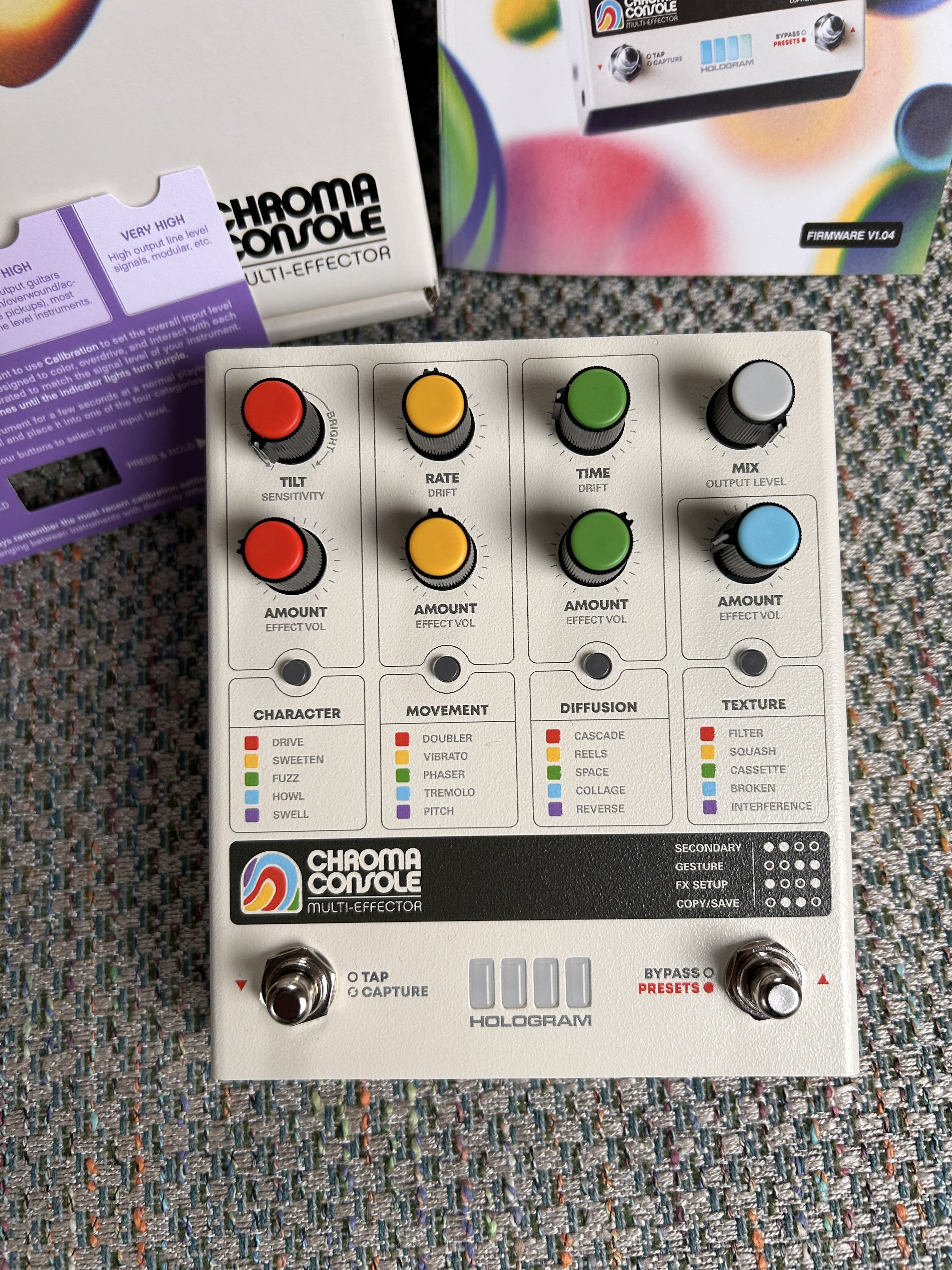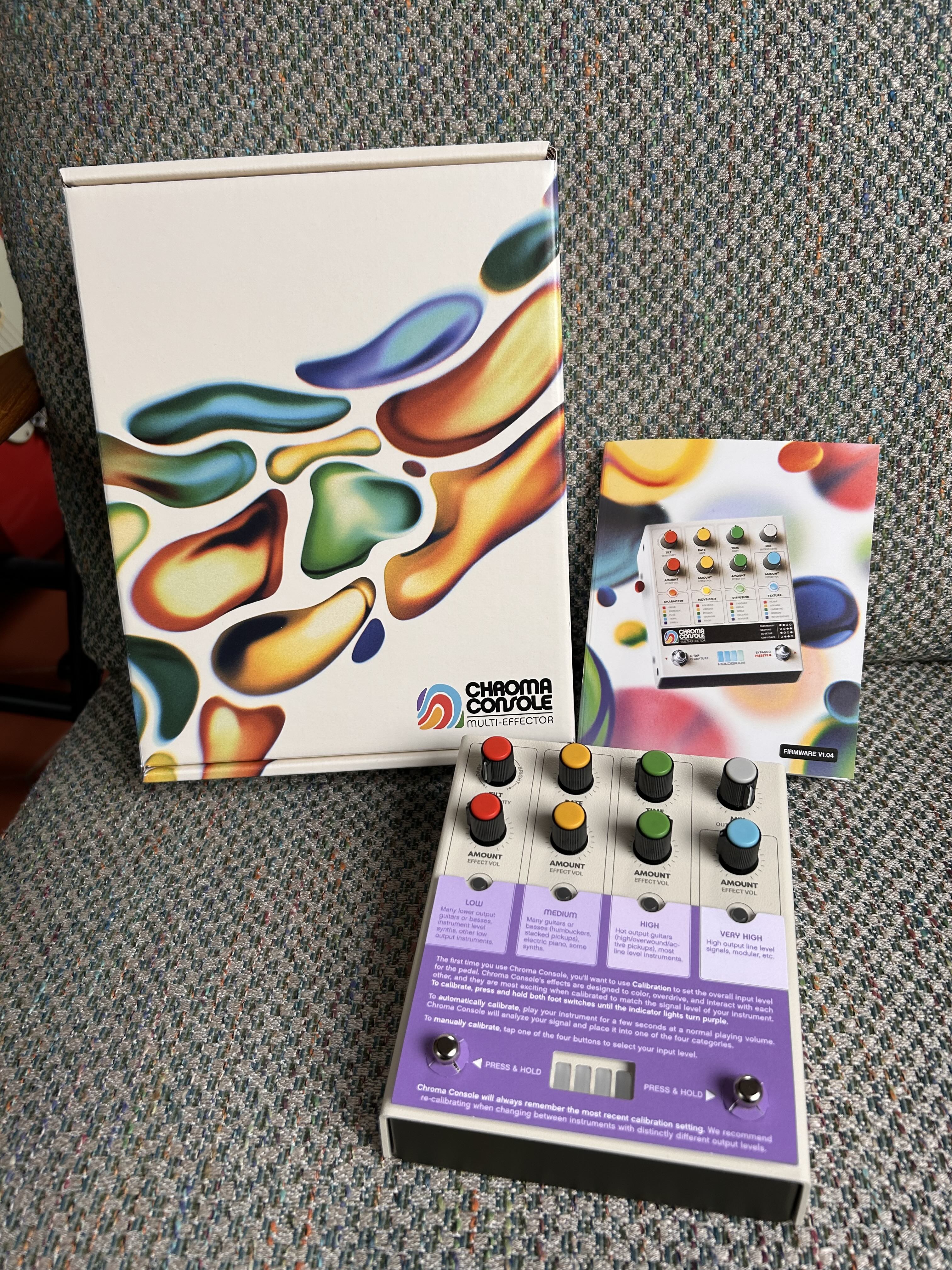 Après une annonce en grande pompe faite de superbes teasers, la pédale était sortie fin 2023 suscitant beaucoup d'attentes chez les curieux de pédales boutique dans la veine de Chase Bliss ou encore Red Panda. Hologram Electronics s'était déjà fait remarqué avec le Microcosm (on trouve des avis intéressants sur AF). Pourtant, aucun avis n'a été posté sur la Chroma Console, alors je m'y colle
