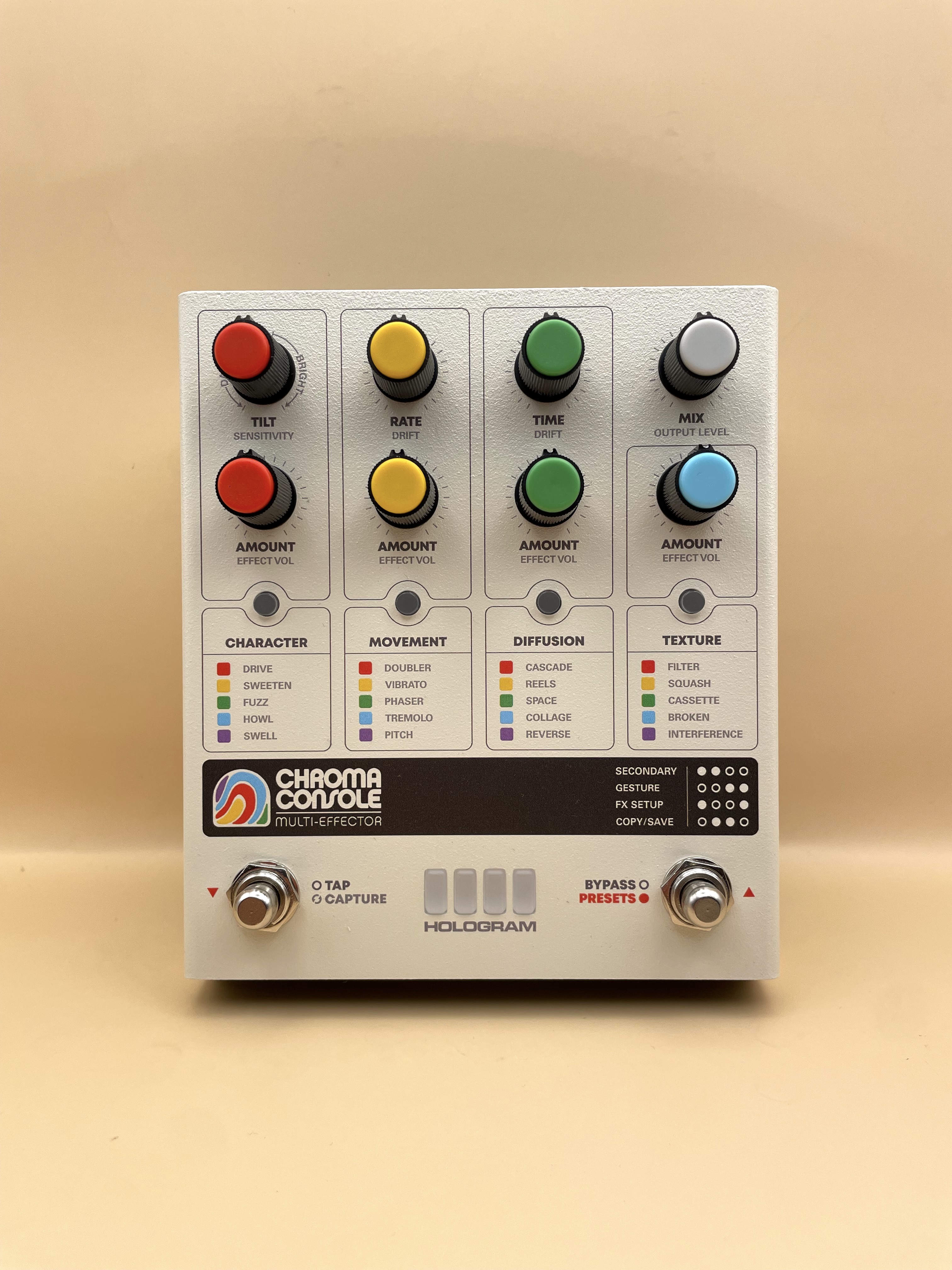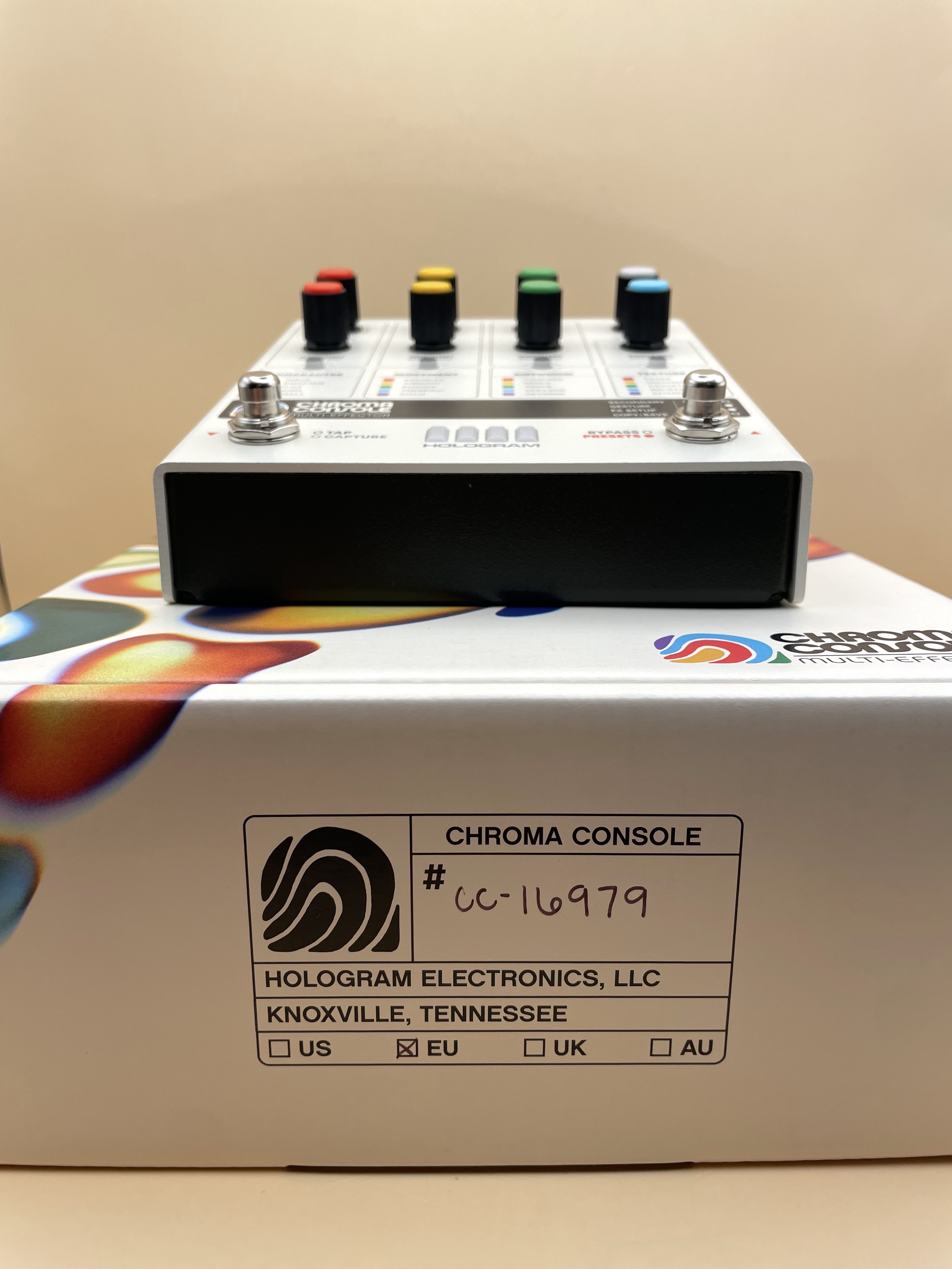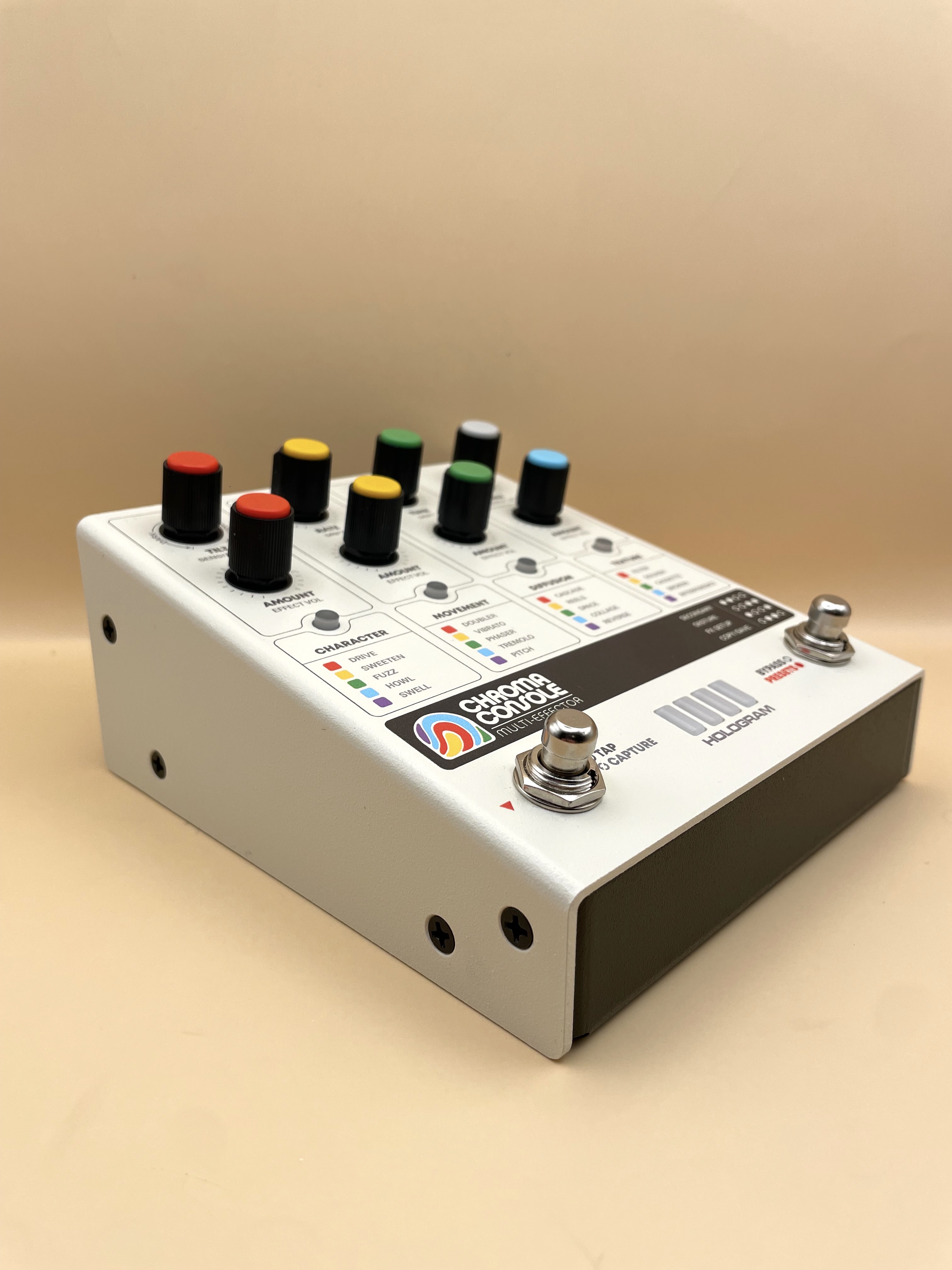 Après une annonce en grande pompe faite de superbes teasers, la pédale était sortie fin 2023 suscitant beaucoup d'attentes chez les curieux de pédales boutique dans la veine de Chase Bliss ou encore Red Panda. Hologram Electronics s'était déjà fait remarqué avec le Microcosm (on trouve des avis intéressants sur AF). Pourtant, aucun avis n'a été posté sur la Chroma Console, alors je m'y colle