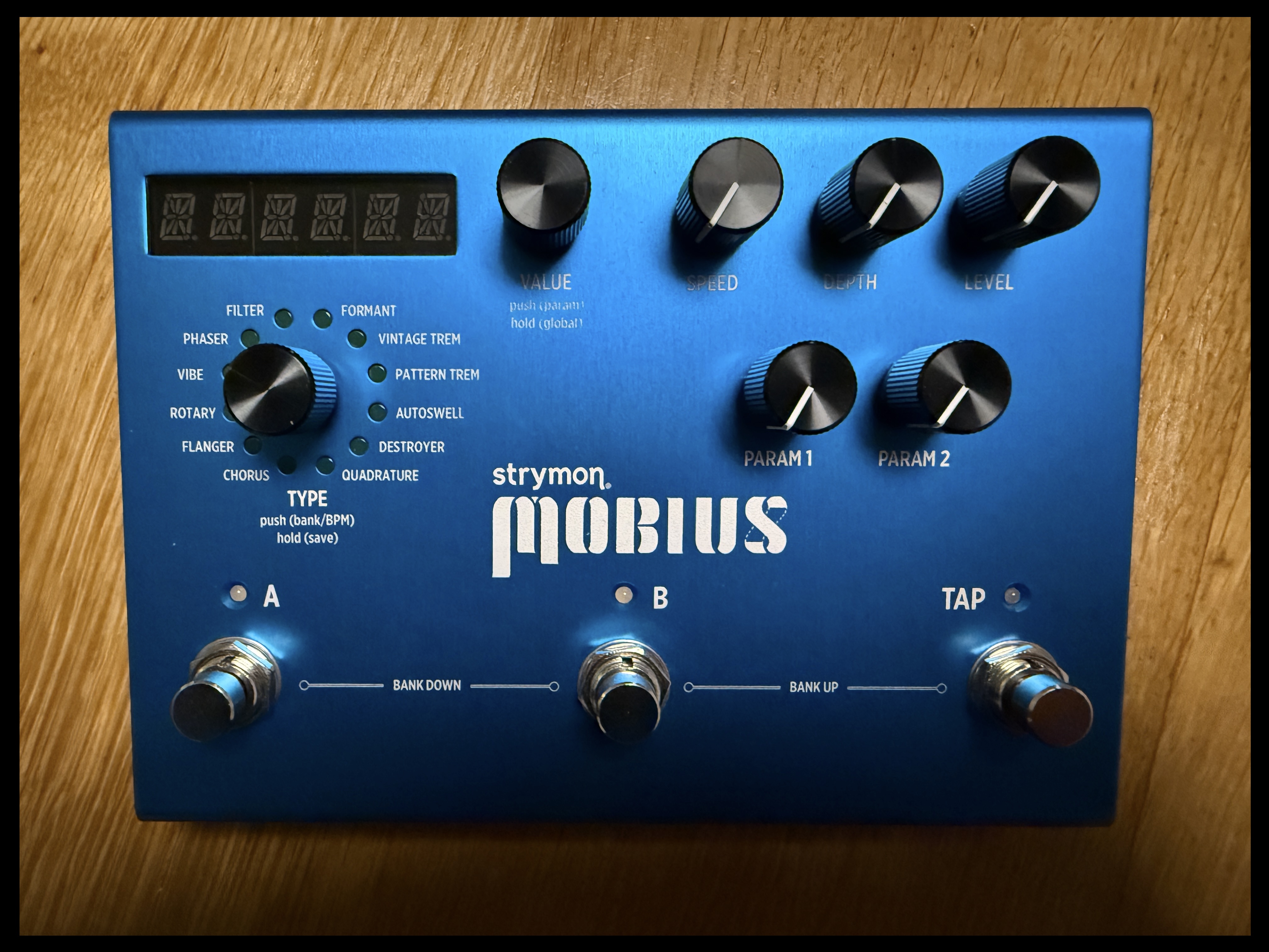 Le Strymon Mobius regroupe douze effets de modulation indispensables, sachant que pour chacun de ces effets il peut y avoir plusieurs modes de fonctionnements, comme pour le Chorus qui a cinq modes différents ou le Flanger qui en a six. On trouve aussi un Rotary (Leslie), une Uni-Vibe, un phaser, un filtre, un trémolo vintage et un autoswell (qui coupe l’attaque puis remonte progressivement le son), et quatre programmes plus rares et expérimentaux.
