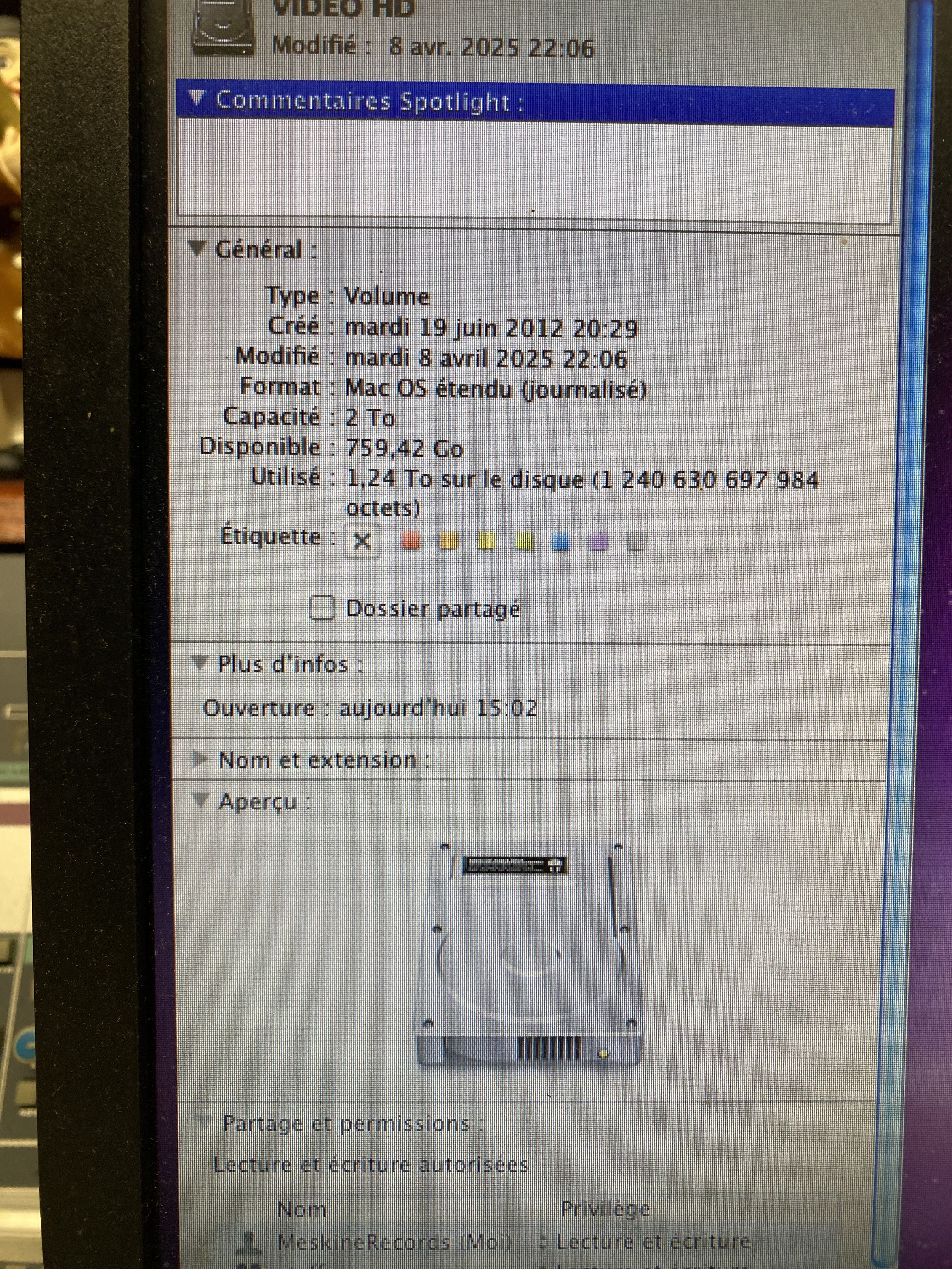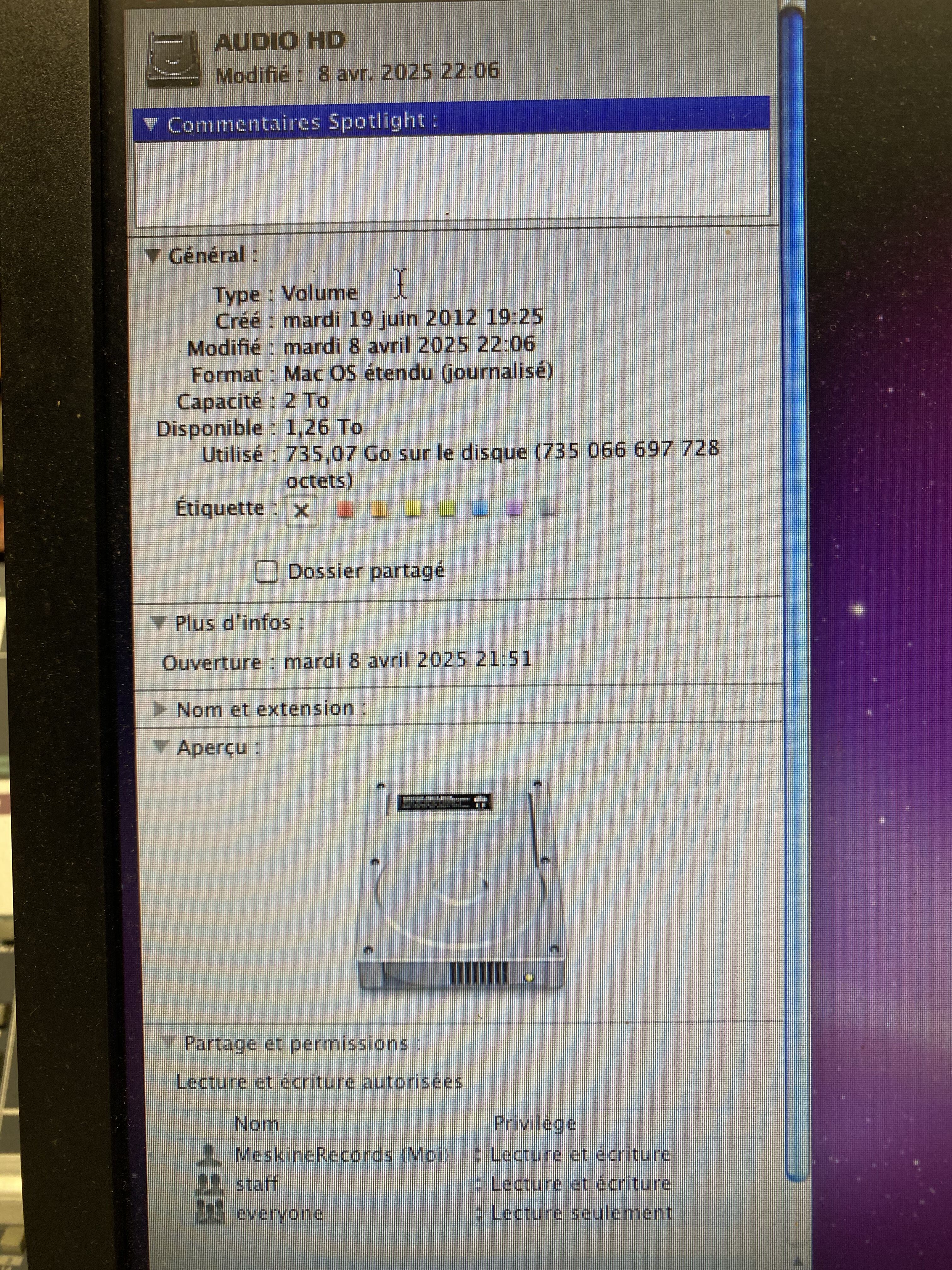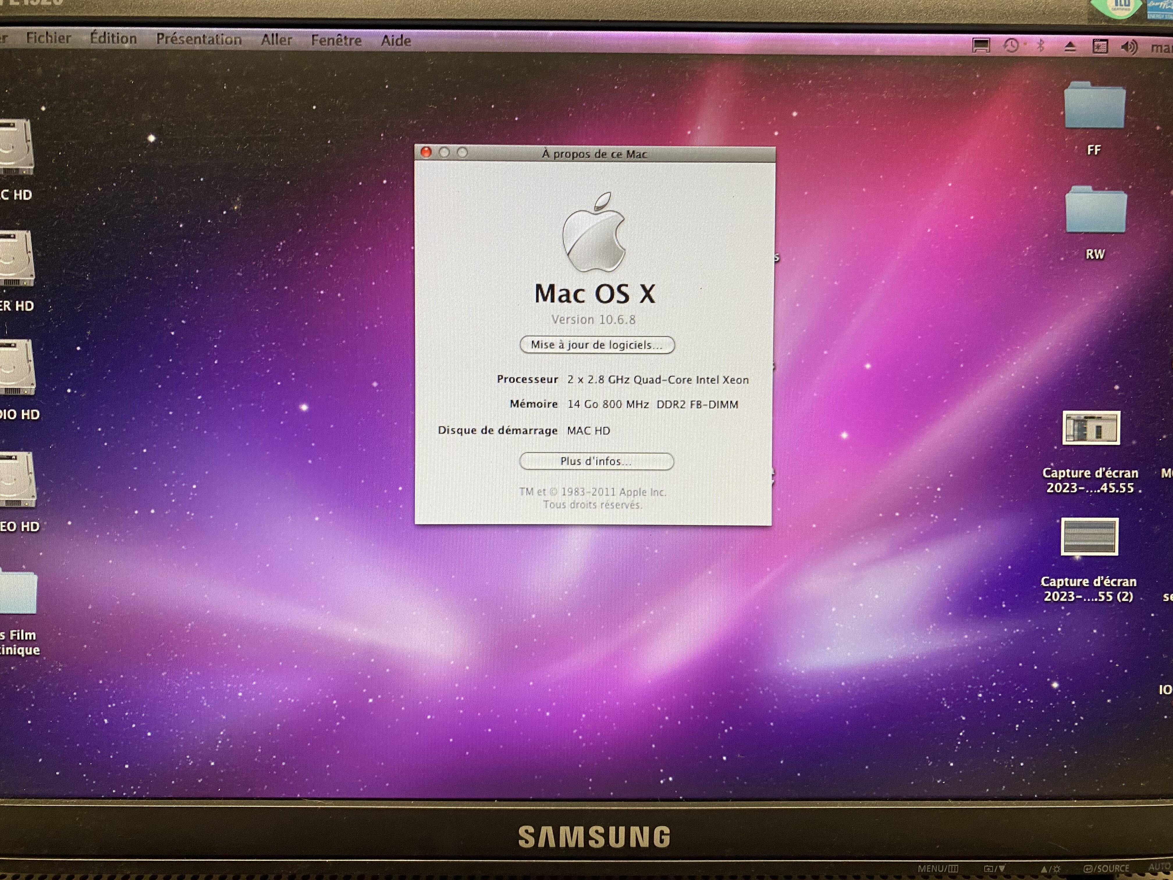 Vend Mac Pro 2009, Processeur Intel Xeon, 2 x 2,8Ghz Quad-Core, très bon état, pas de rayures, avec ecran 24" Cinema Display Full HD en parfait état lui aussi, tourne sous Léopard actuellement mais peut être mis a jour jusqu'a Mac OS Catalina 10.15 ( 2020 ), disque d'installation dispo si vous souhaitez tout remettre à zéro. 16go de RAM ( extensible ) et 7,5 To sur quatre disque dur rangés dans la tour dans 4 tiroirs, gros potentiel de stockage, lecteur cd / dvd intégré. Fonctionne parfaitement.Je m'en servais pour mon studio d'enregistrement musical professionnel, je le revend car besoin d'un matériel plus puissant encore.