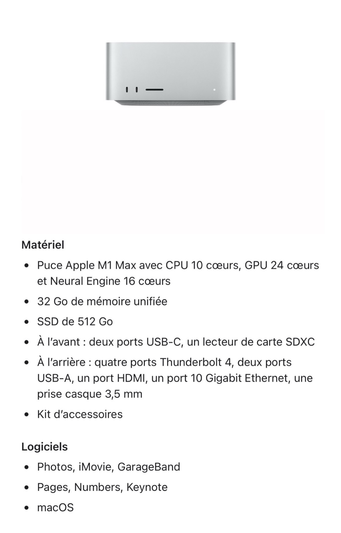 APPLE Mac Studio M1 Max – 32 Go – État impeccable – Setup Apple inclusJe vends mon Mac Studio M1 Max (32 Go / 512 Go), en parfait état.