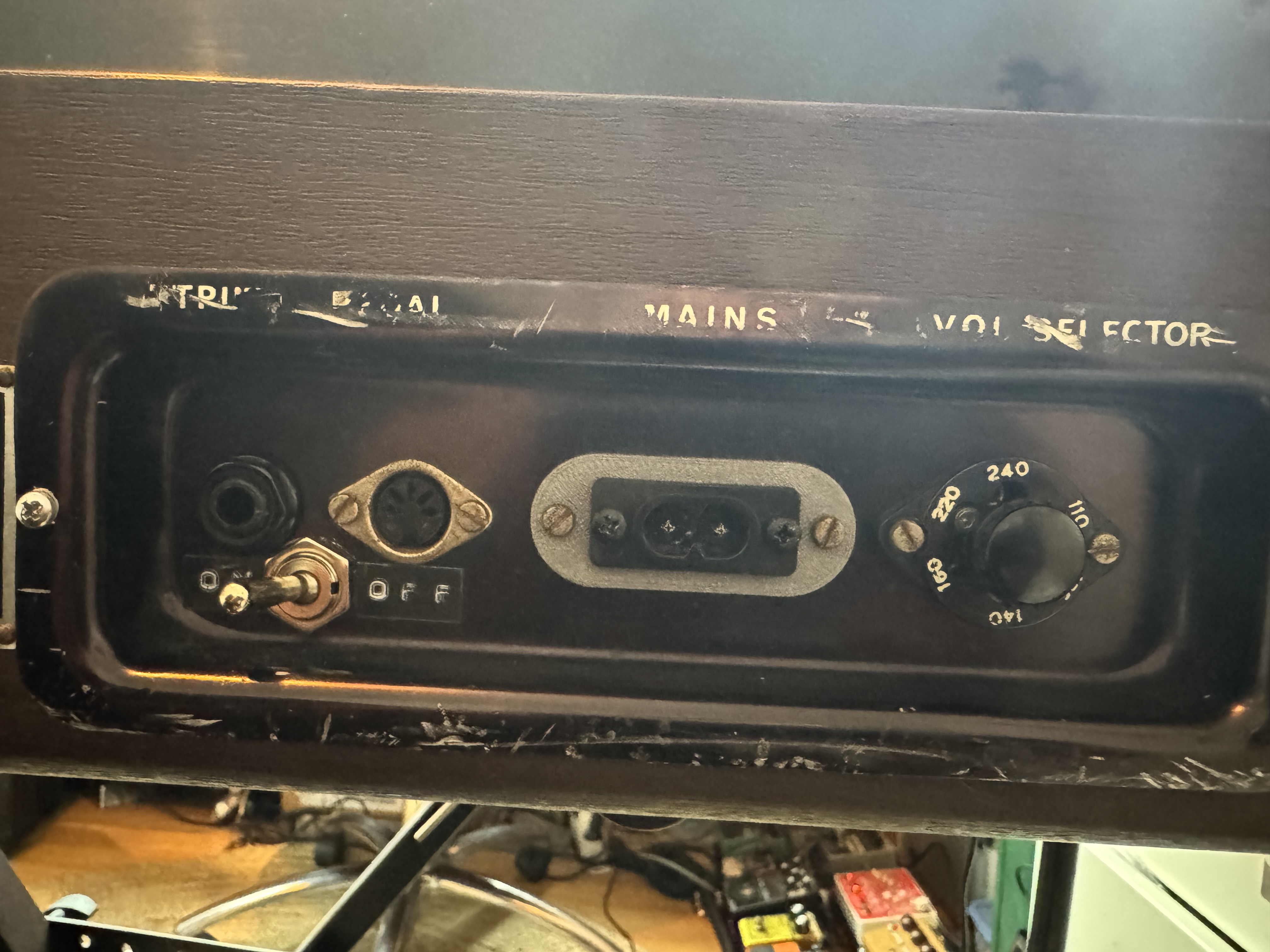 La pédale de volume d’origine (contrôlant le niveau général) étant absente, j’ai fabriqué un boîtier équipé d’un potentiomètre pour la remplacer.