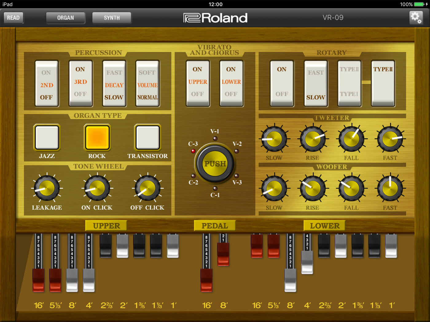 Trois modalisations sont proposées : ROCK, JAZZ et orgue à transistors (on croirait vraiment entendre les Doors). Le Reface YC de chez Yamaha ne m'a pas convaincu bien qu'il fût moins onéreux mais les touches de son clavier sont trop petites et trop peu nombreuses. A noter que sur le VR-09 possède 61 touches adaptées au jeu d'orgue. Toutefois, l'emploi de la percussion rend muette la tirette 9 (1').