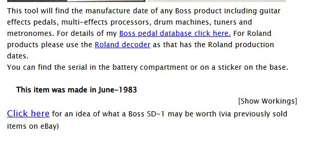 Overdrive boss SD1 datant de juin 1983, made in Japan, Black Label.Possède la fameuse puce JRC 4558.