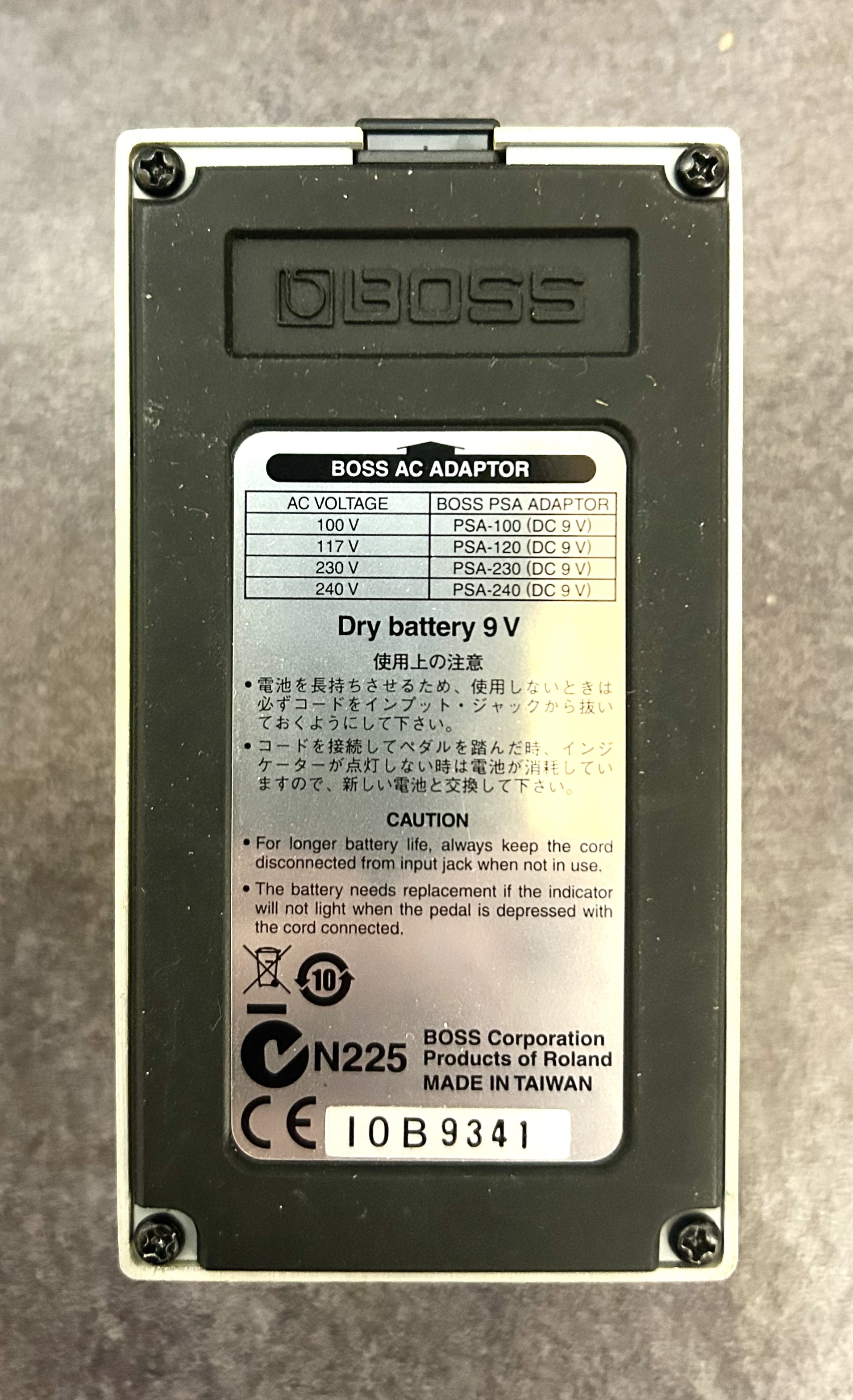 Pédale d’overdrive Boss SD-1 « made in Taiwan », avec la boîte d’origine, la notice d’origine, et une pile de 9V presque neuve