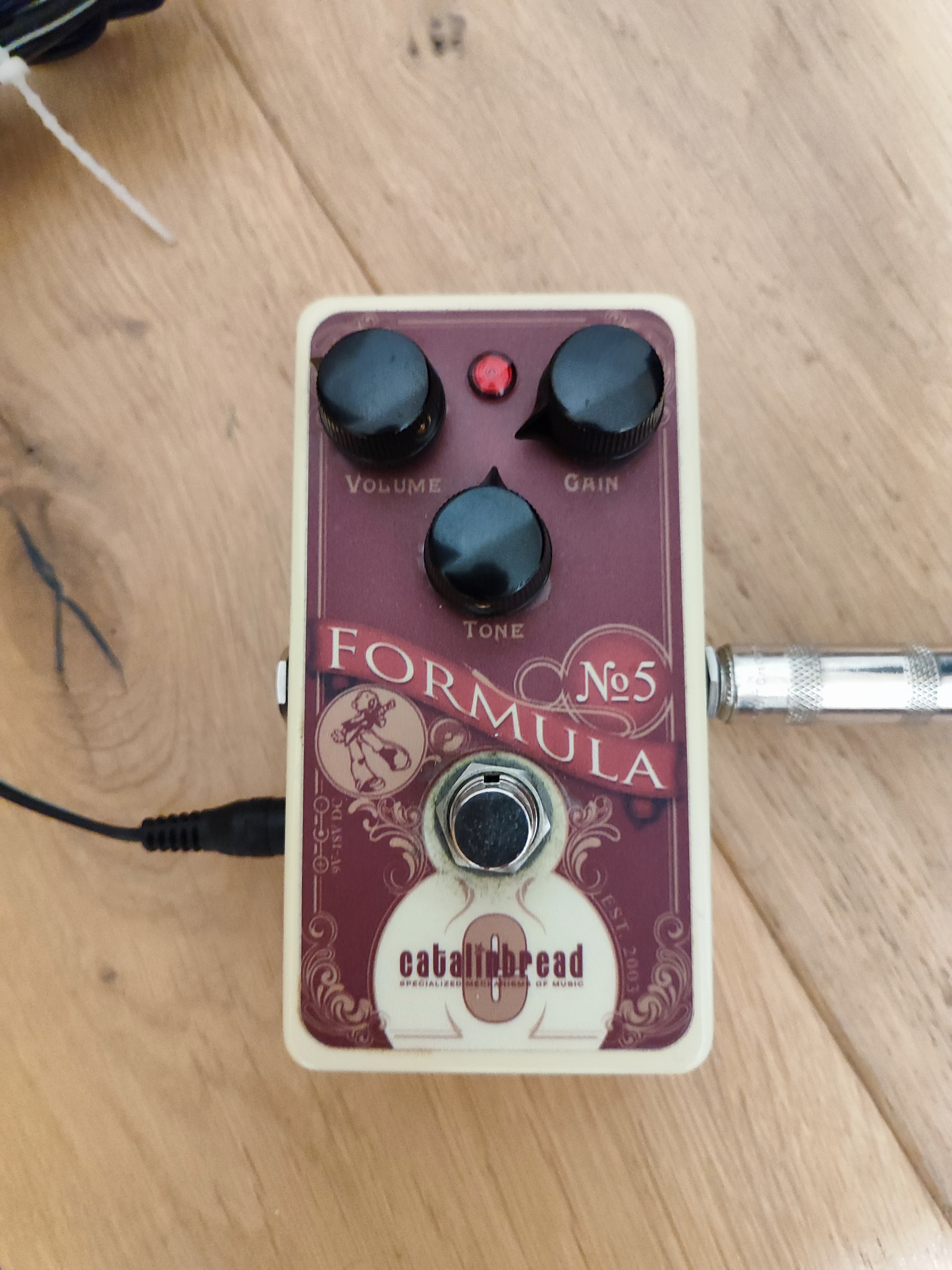 La Catalinbread Formula n°5 comprend 3 potards : Volume - tone - gain. Le footswitch est en true-bypass, et l'alimentation peut se faire en 9V, ou en 18V pour augmenter encore son caractère.