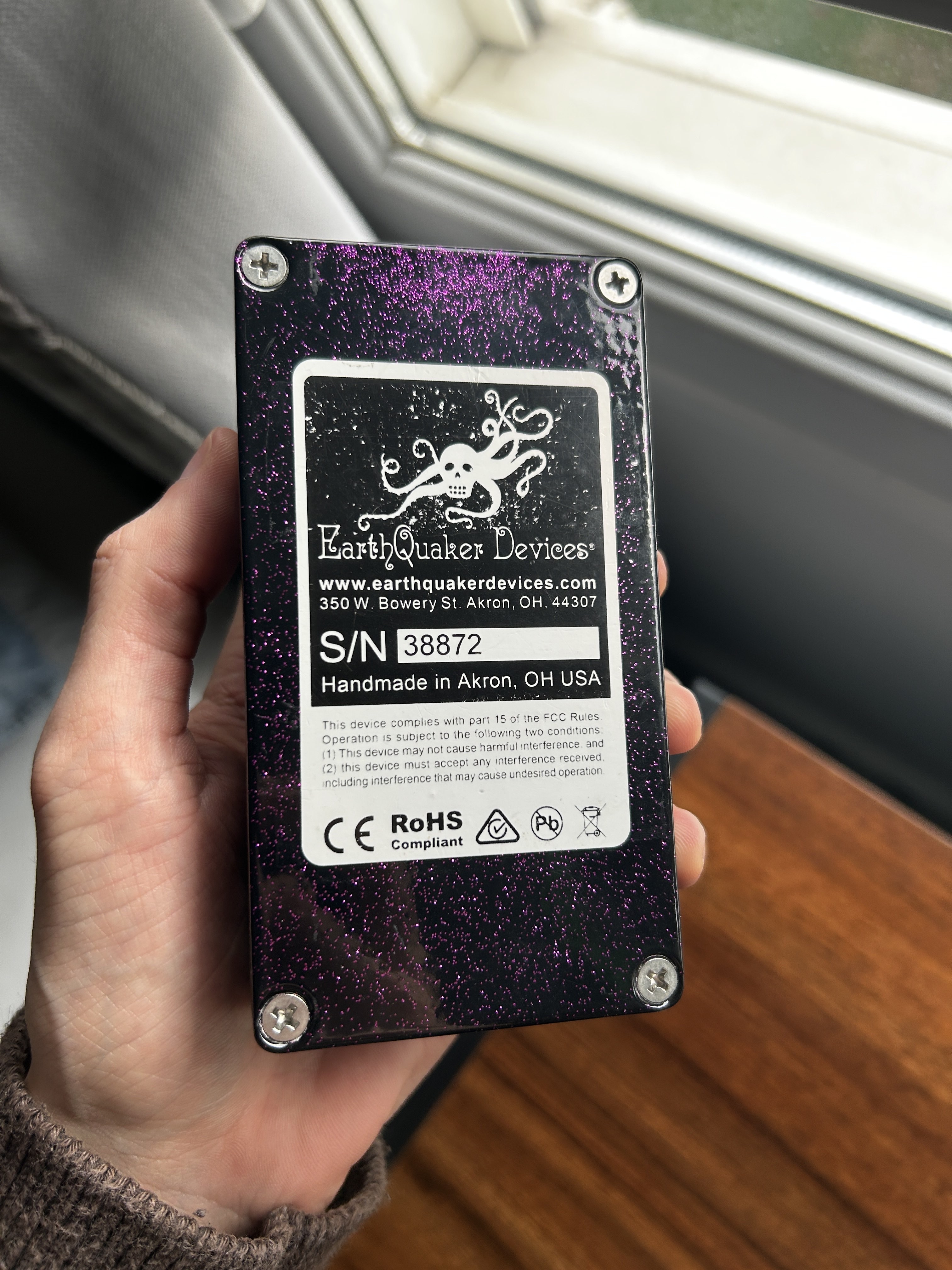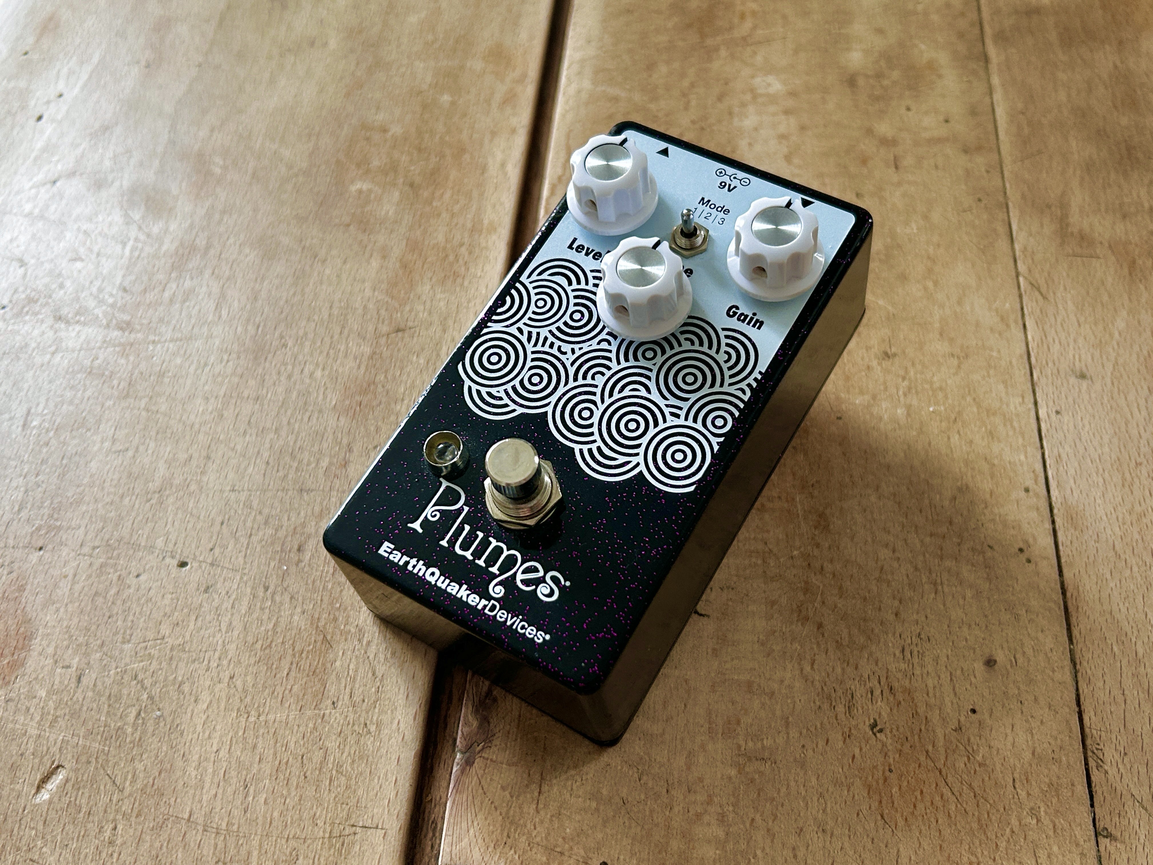 Pédale d’overdrive Plumes de chez Earthquaker Devices, édition limitée Purple Sparkle pour la boutique Gear Hero.
