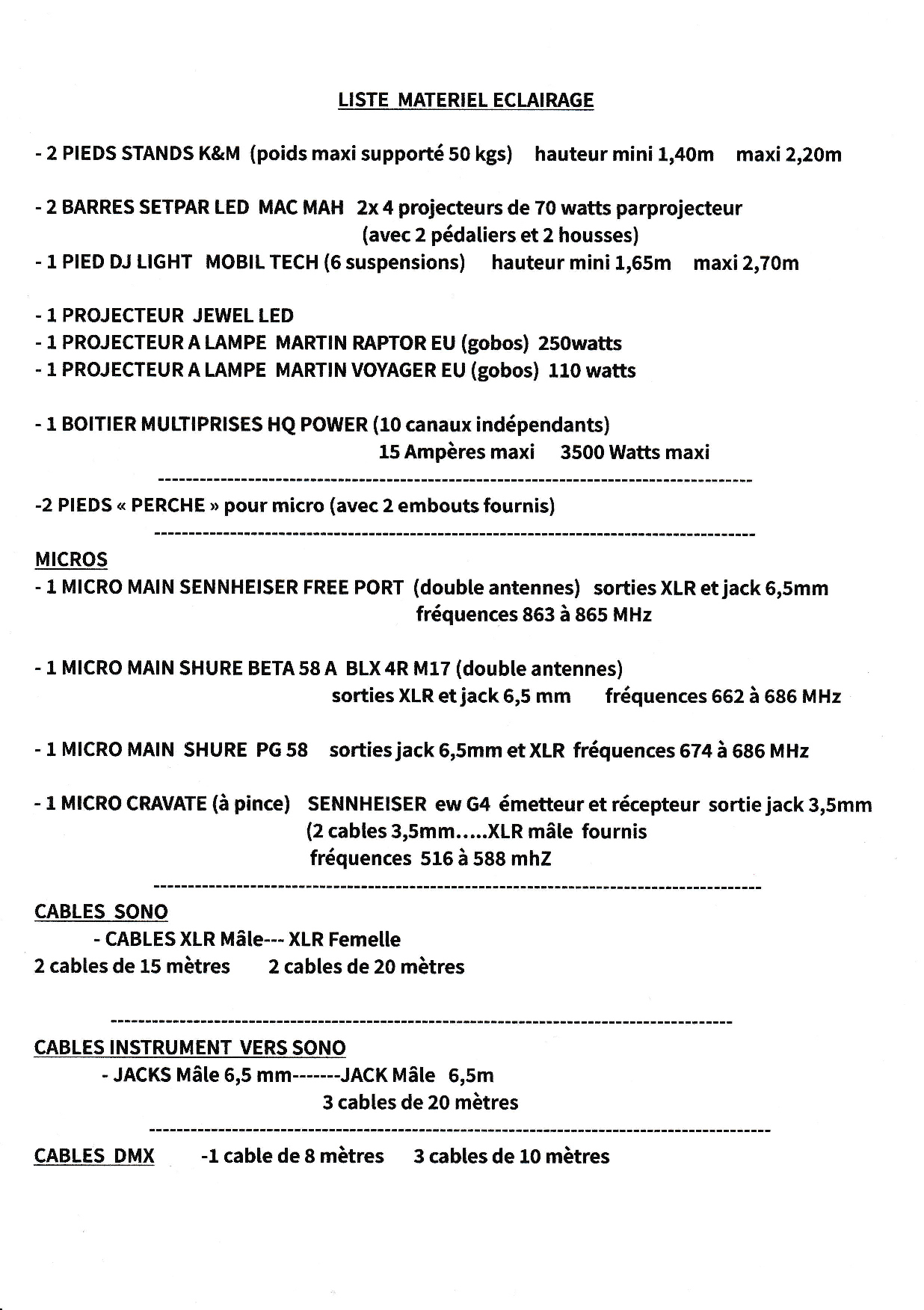 (150e) des pieds perches (10e pièce) des cables XLR JACK 6,5mm DMX (10e pièce)