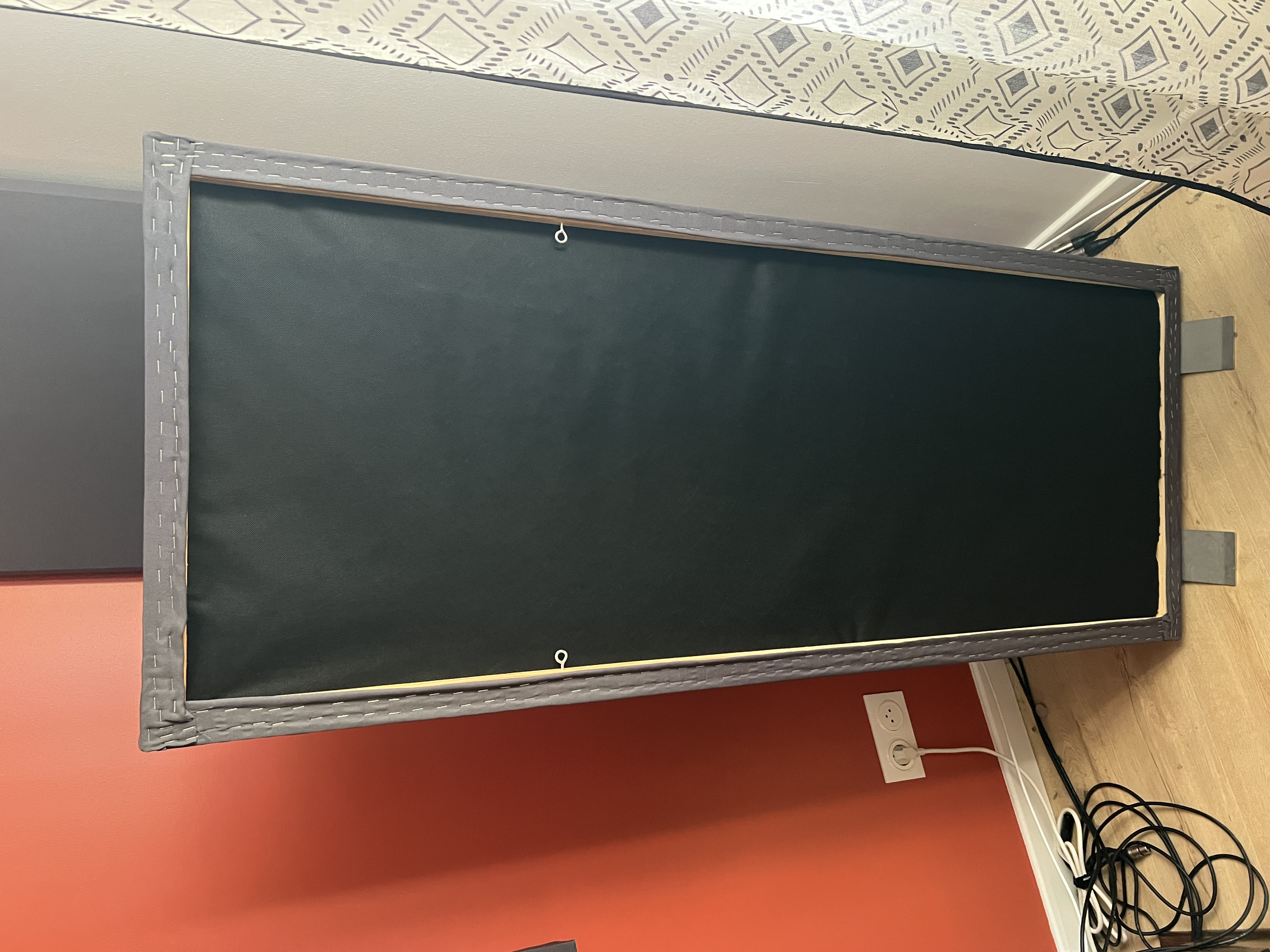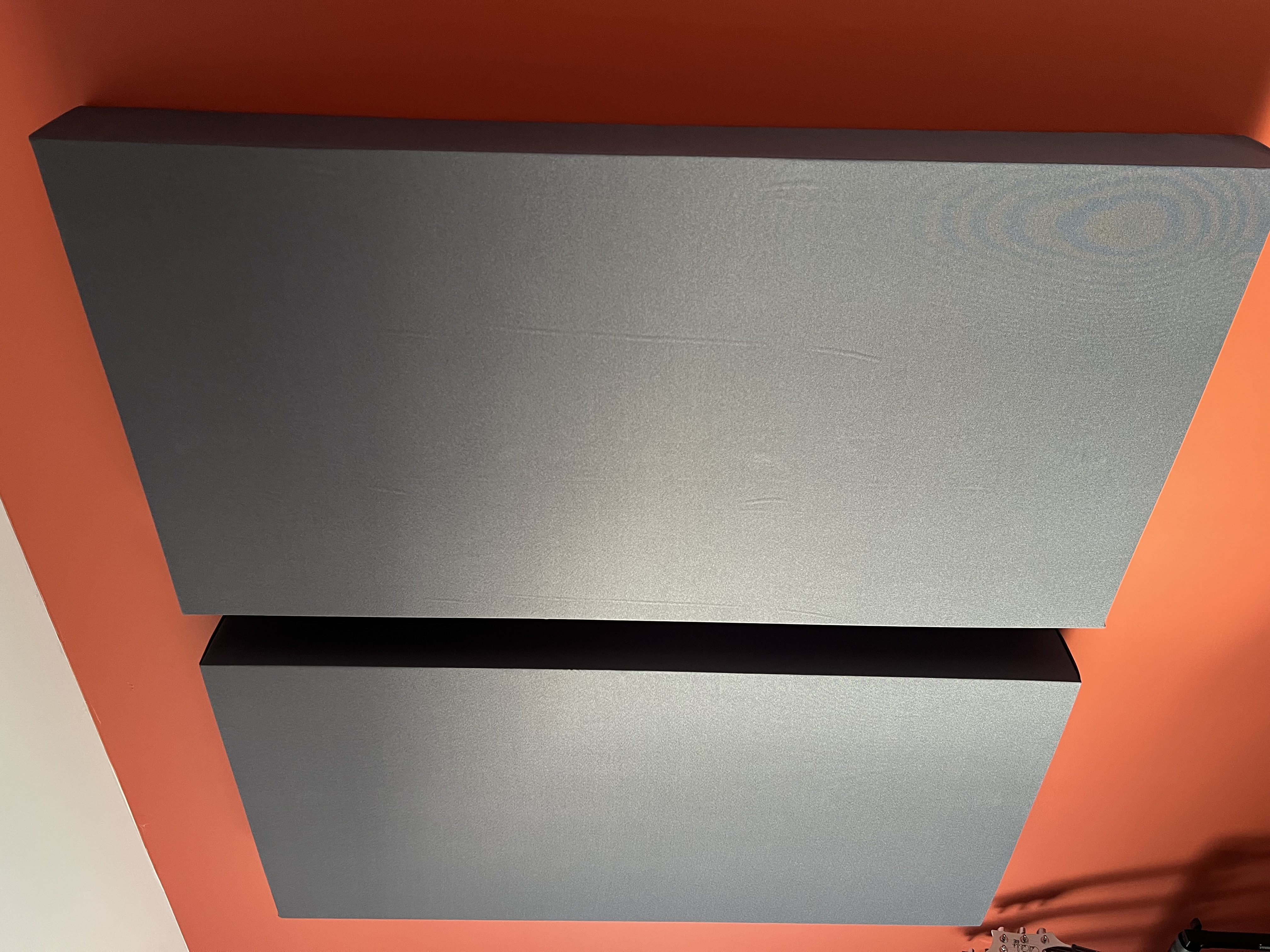 Lot de panneaux acoustiques composé de 9 panneaux de 120x60cm (dont 3 pour les ceiling cloud), 6 corner bass traps (110cm) et 1 Gobo sur pied de 150x60cm que vous pouvez déplacer à votre guise pour enregistrer une voix ou un instrument n’importe où dans la pièce. Ils font 11cm d’épaisseur.Ils ont été fait avec des panneaux Recticels en denim pour leur caractéristiques acoustiques mais aussi pour la santé car ce sont des matériaux totalement sain/bio contrairement à du Rockwool ou laine de roche.
