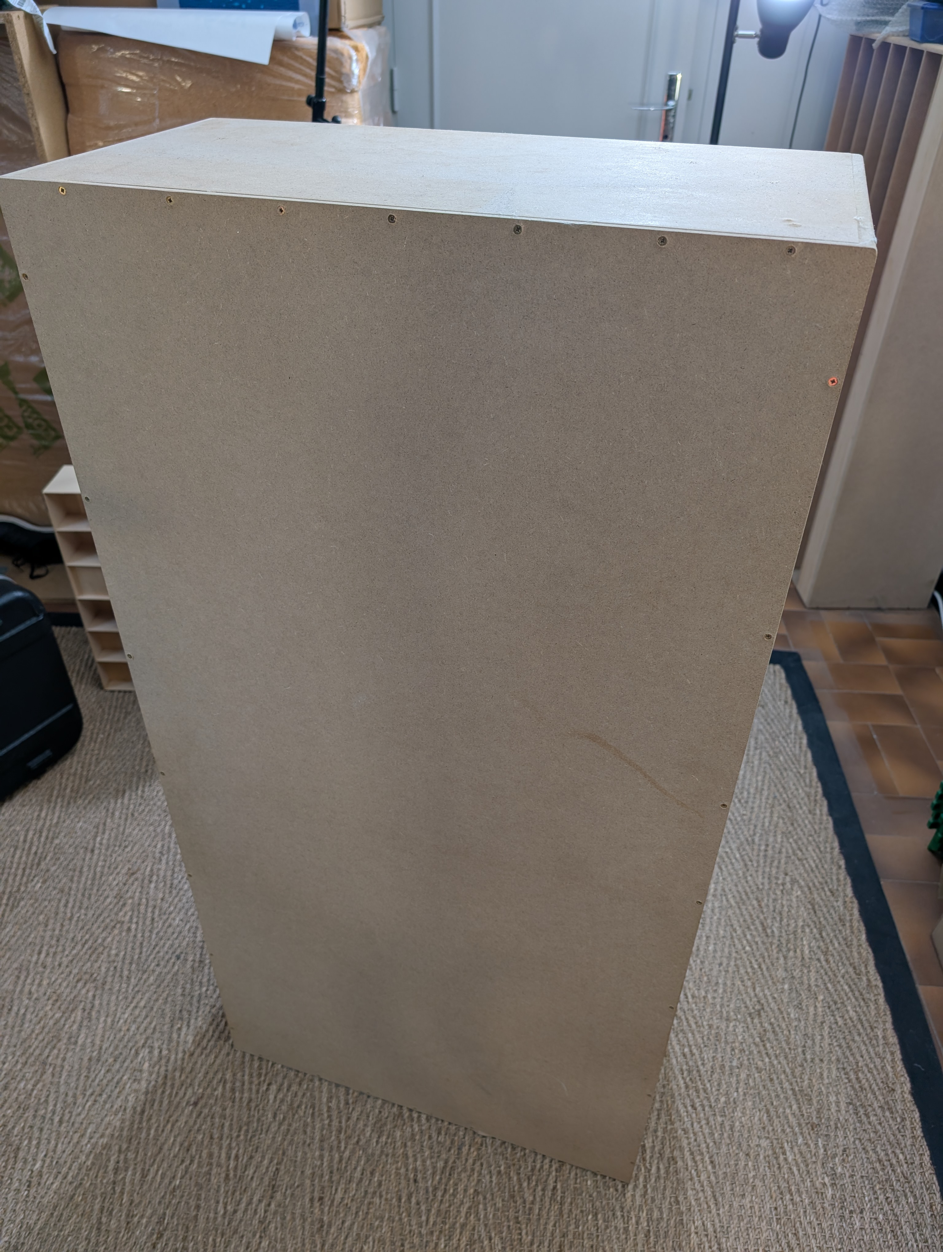 Ils sont en MDF brut et contreplaqué, avec alvéoles remplies de laine minérale.