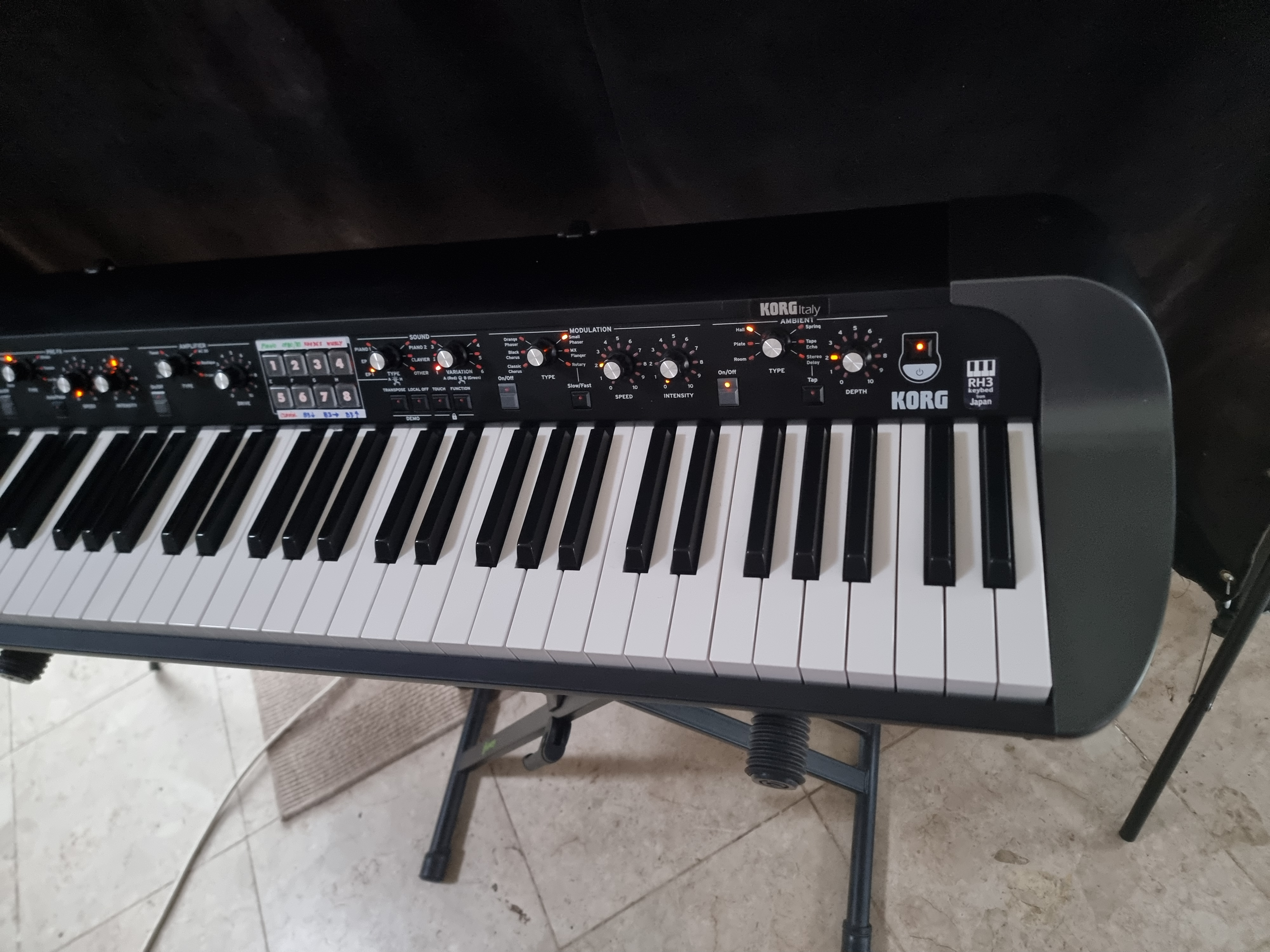 Vendu avec pédale de sustain Korg et câble d’alimentation (Prise IEC habituelle).