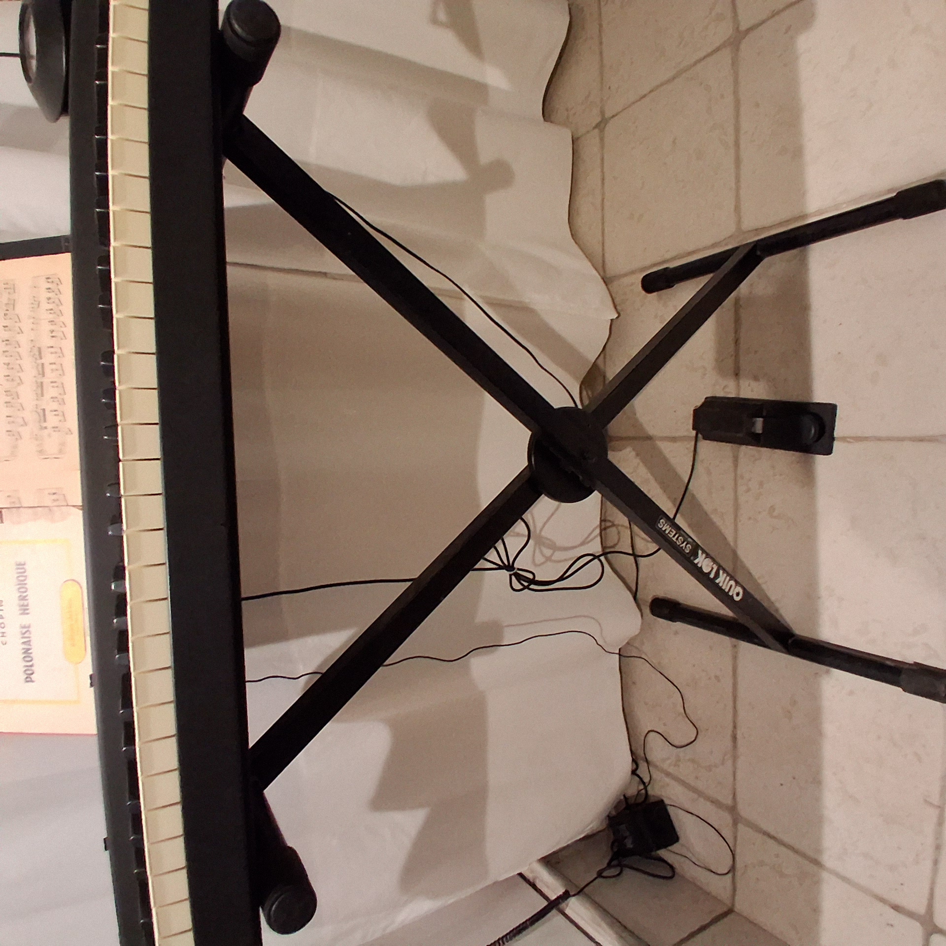 Pour reposer, nul besoin de pieds en X ; Roland le vendait avec des pieds en bois sur mesure, ce qui est fort pratique, et bien plus esthétique.