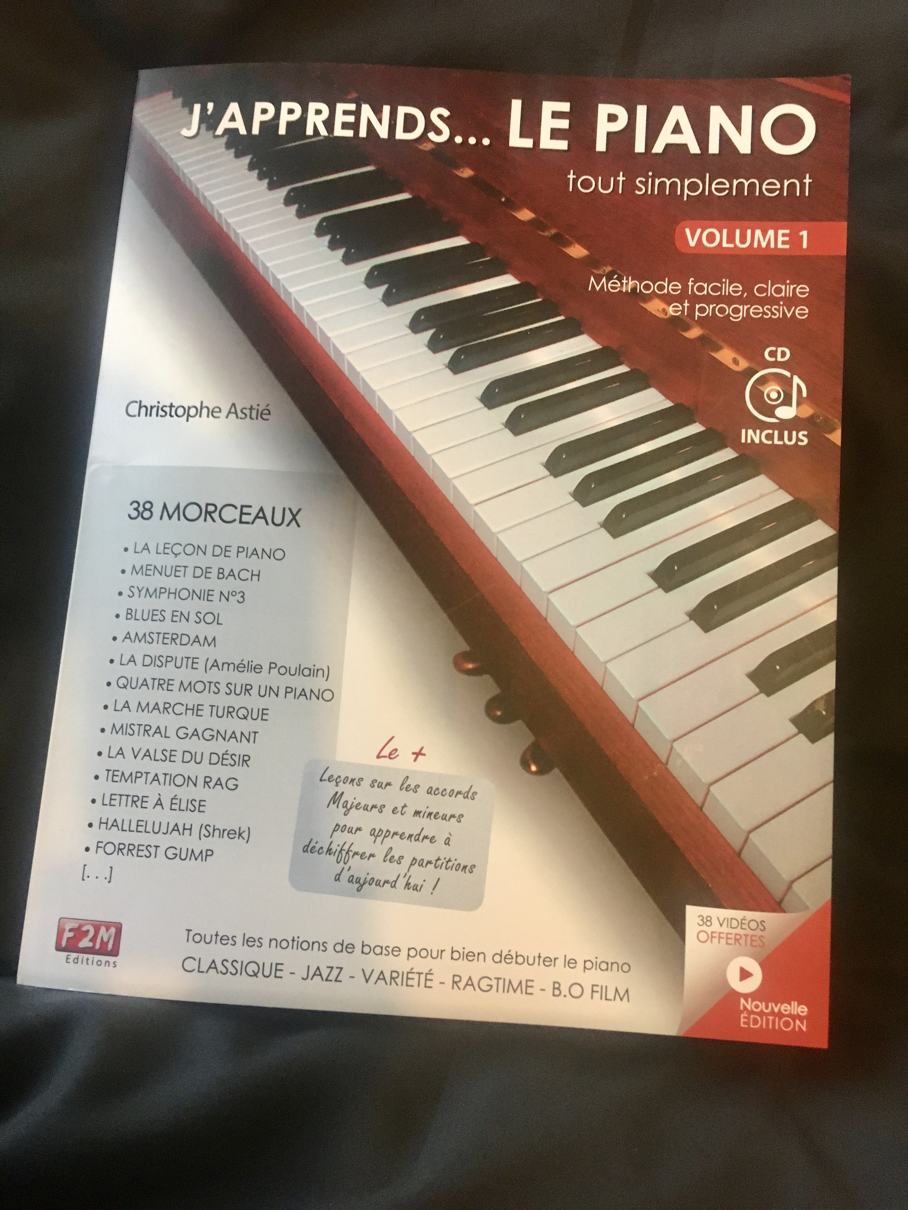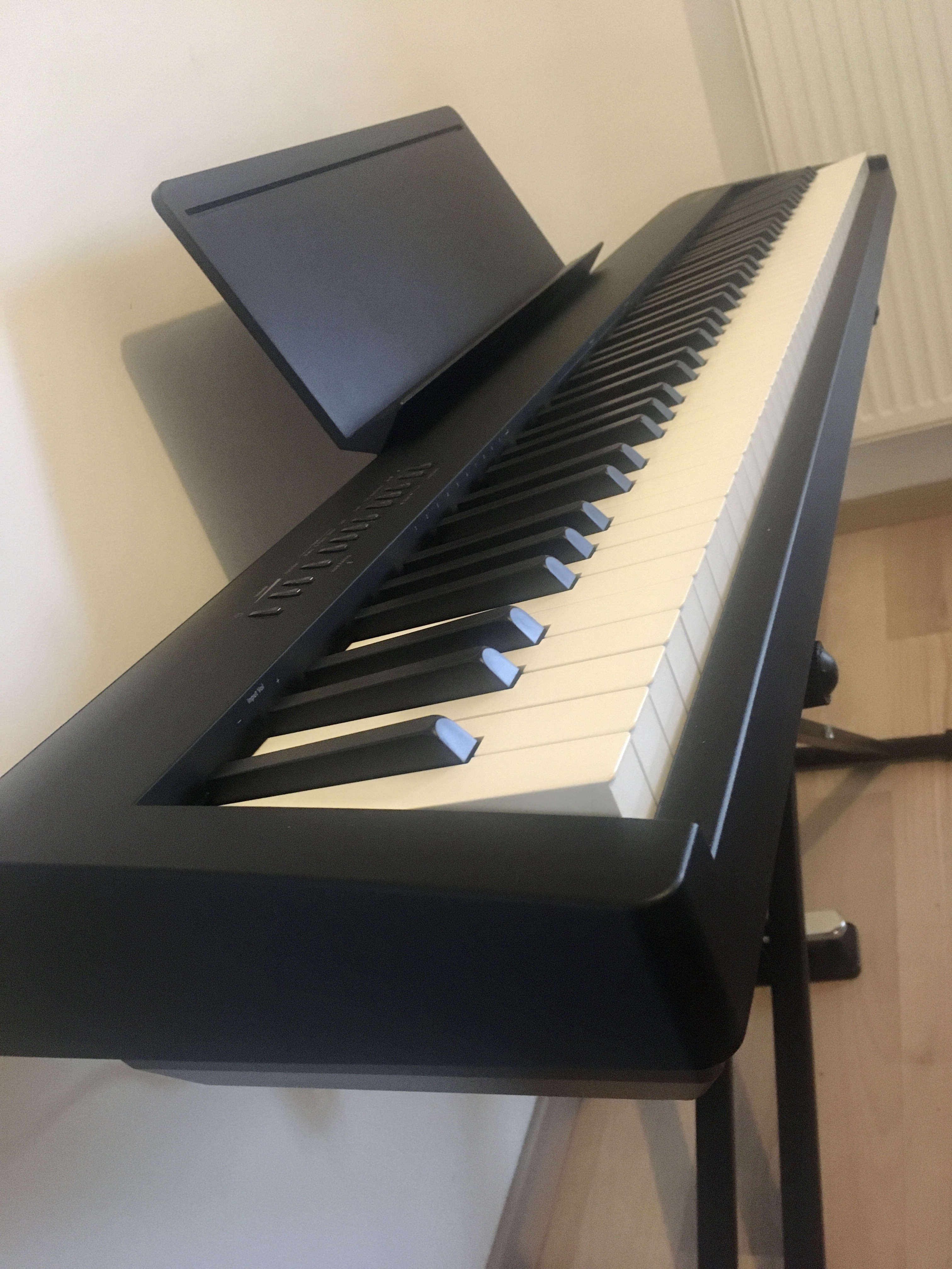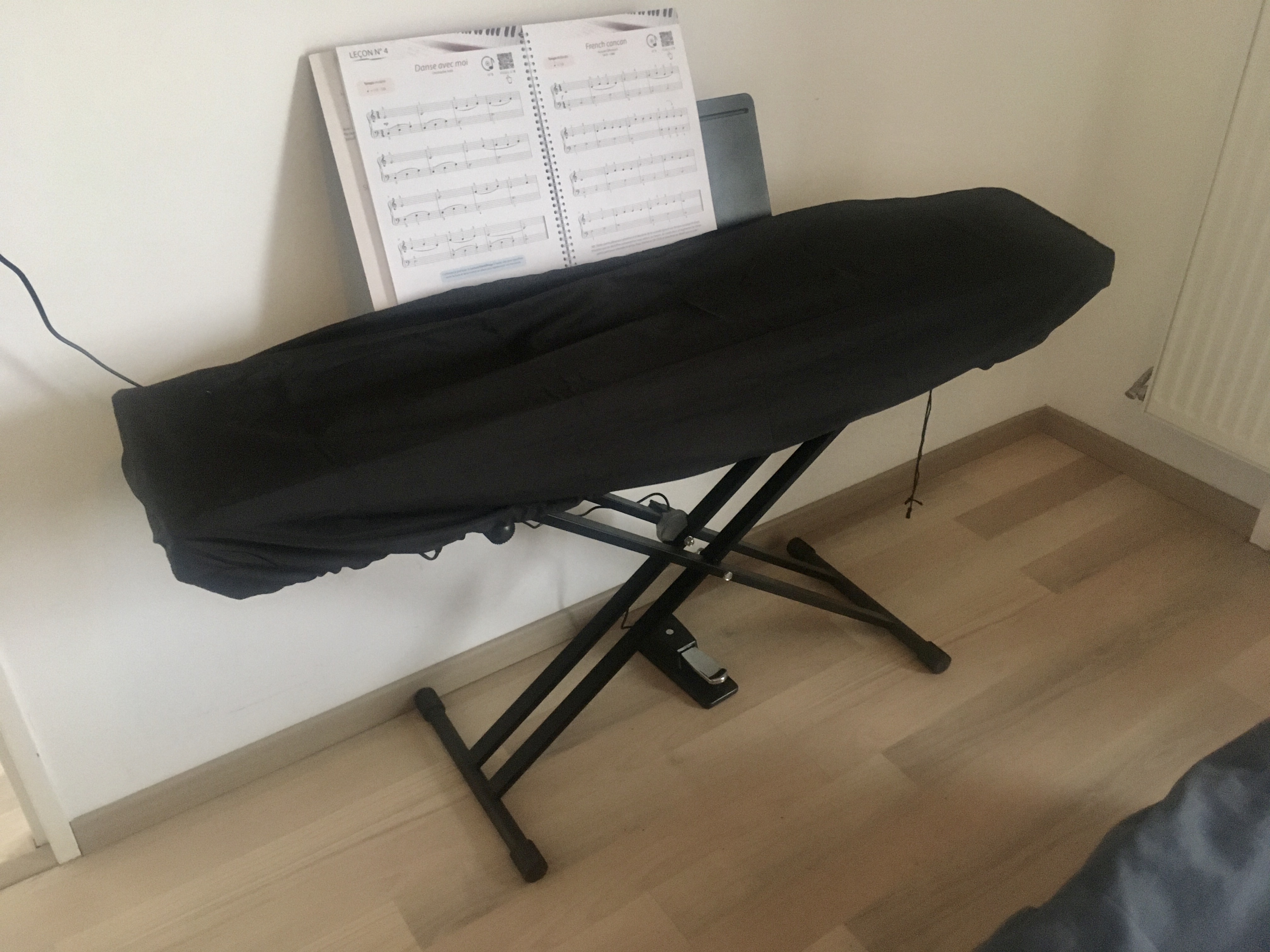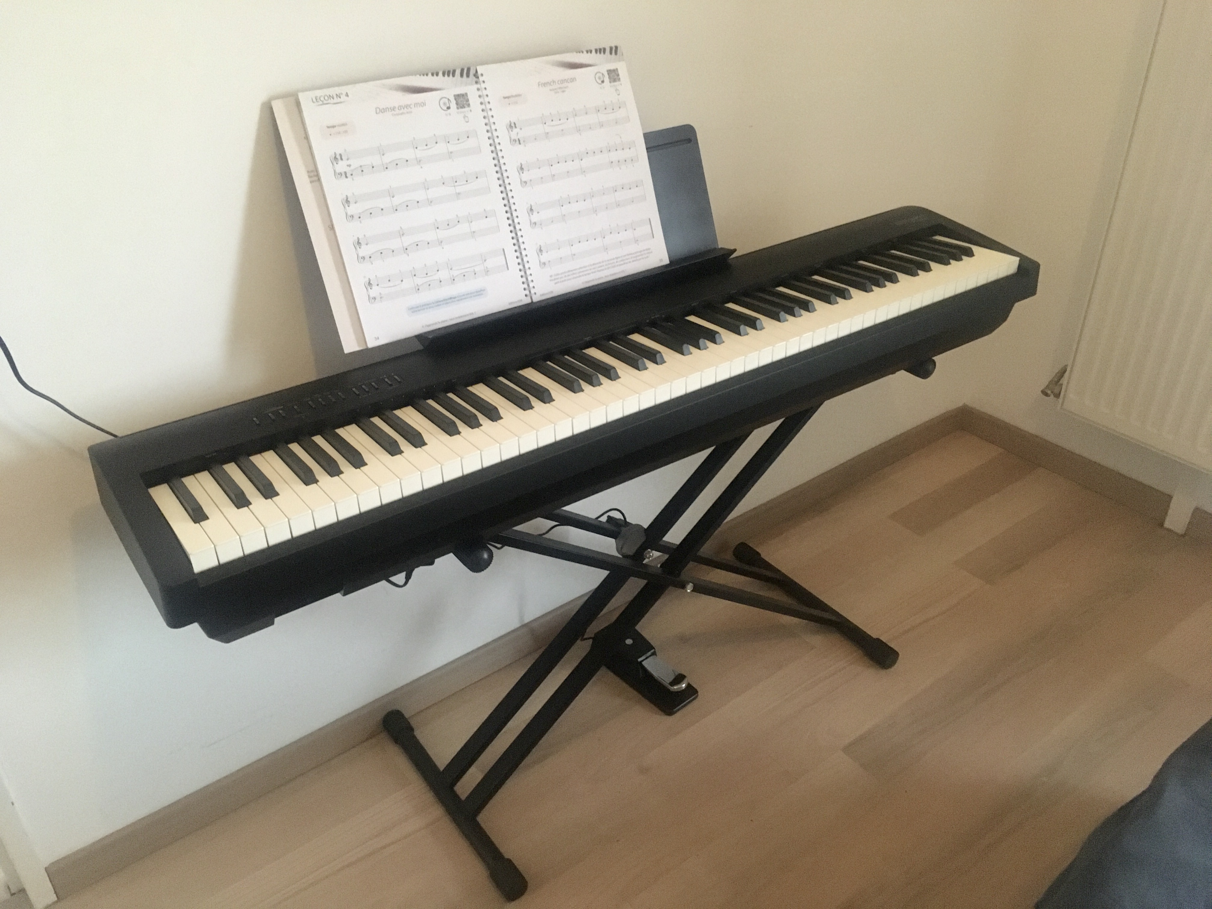 j'offre avec, une housse pour le protéger de la poussière, un pied en X, une méthode de piano pour adulte et en plus de la pédale d'origine, une bonne pédale de sustain digne de ce nom.