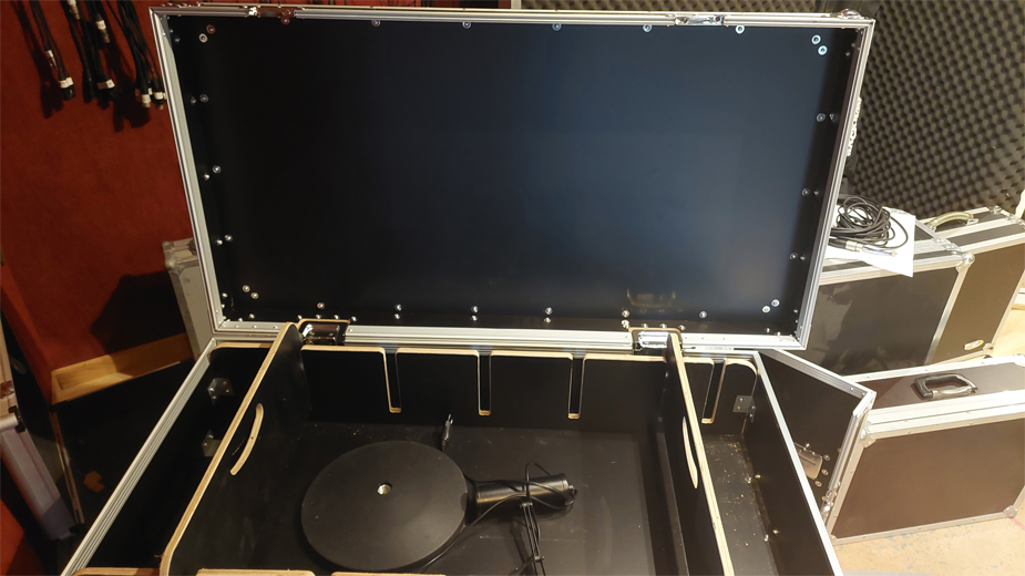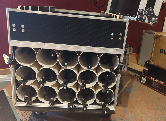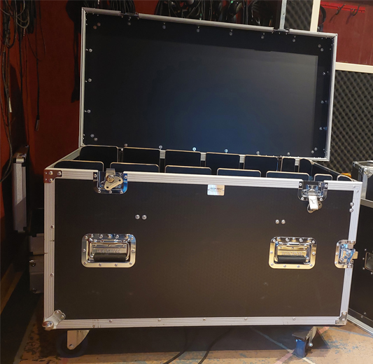 - 1 flight case de transport 15 pieds de micros avec rangement supplémentaire sur le dessus.
