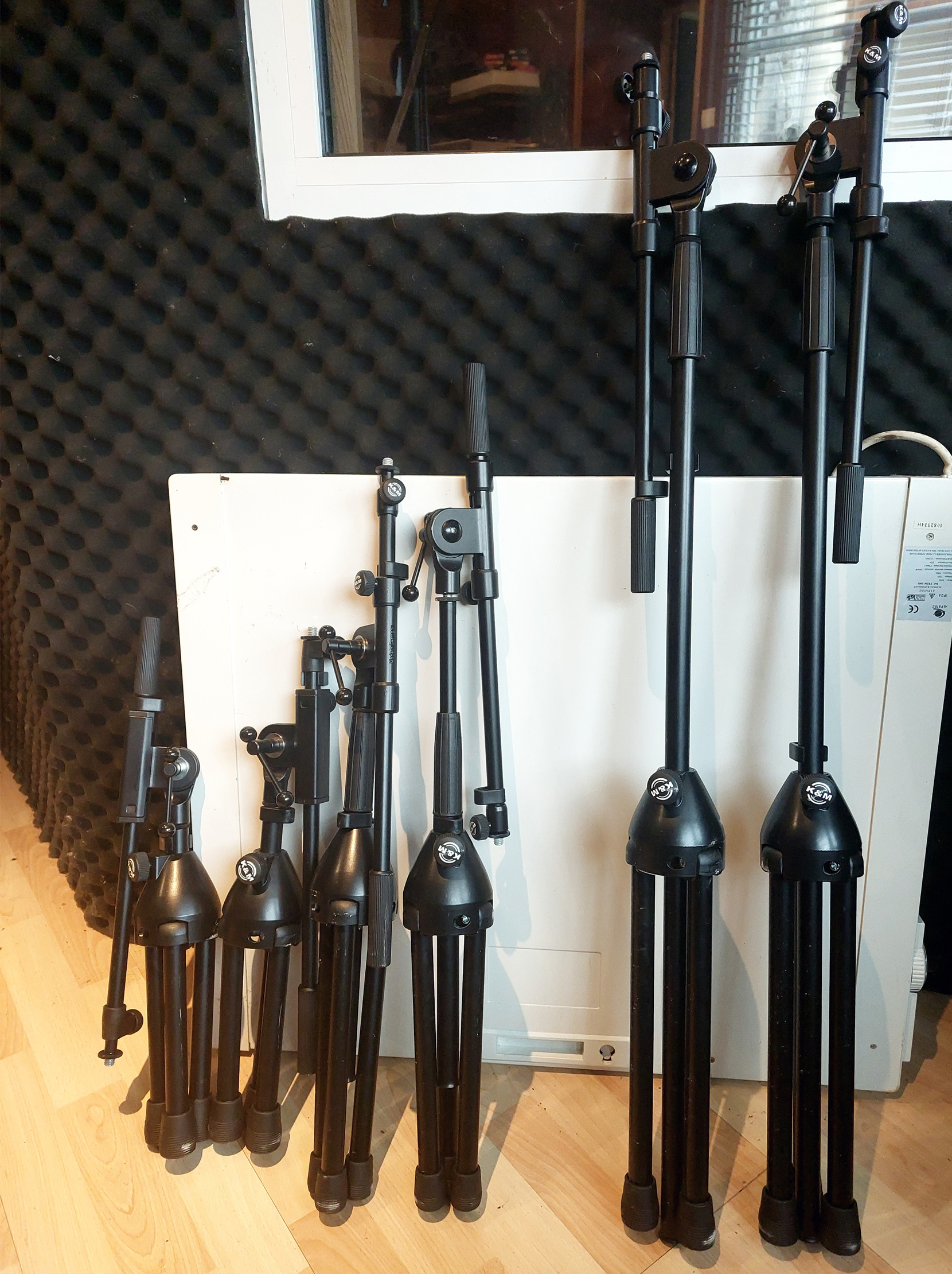 Vend ensemble pieds de micros et flight case de rangement pour pieds de micros.-8 pieds perche de micros K&M 210/9 Black . Hauteur réglable de 900 à 1600 mm