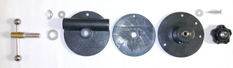 D'abord, à quoi ca ressemble ? Cette "rotule" est composée de deux disques en plastique, l'un comportant un orifice pour le fixer sur le tube vertical, l'autre comportant une goulotte dans laquelle coulisse la perche. Entre les deux, une grosse rondelle en caoutchouc assure la friction entre les différentes pièces. Une seule grosse vis effectue donc le serrage de la perche en translation et dans deux rotations.