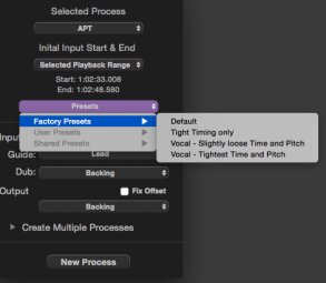 La caractéristique phare de ReVoice Pro 3 répond au doux nom de APT, pour Audio Performance Transfer. Le but de cette fonction est d’extraire certaines caractéristiques d’une piste audio (qui servira de « guide »), comme le pitch, le vibrato, le niveau et le timing, et d’appliquer ces données au contenu d’une autre piste (qui sera la cible). Une troisième piste sera alors créée et contiendra le signal audio de la piste cible, modifié plus ou moins drastiquement par certaines caractéristiques de la piste « guide ». On pourra évidemment doser certains paramètres, comme la limite du pitch, les différentes tolérances d’alignement temporel ou de pitch, etc. Il sera ensuite possible de sauvegarder ses présets de les rappeler plus tard.