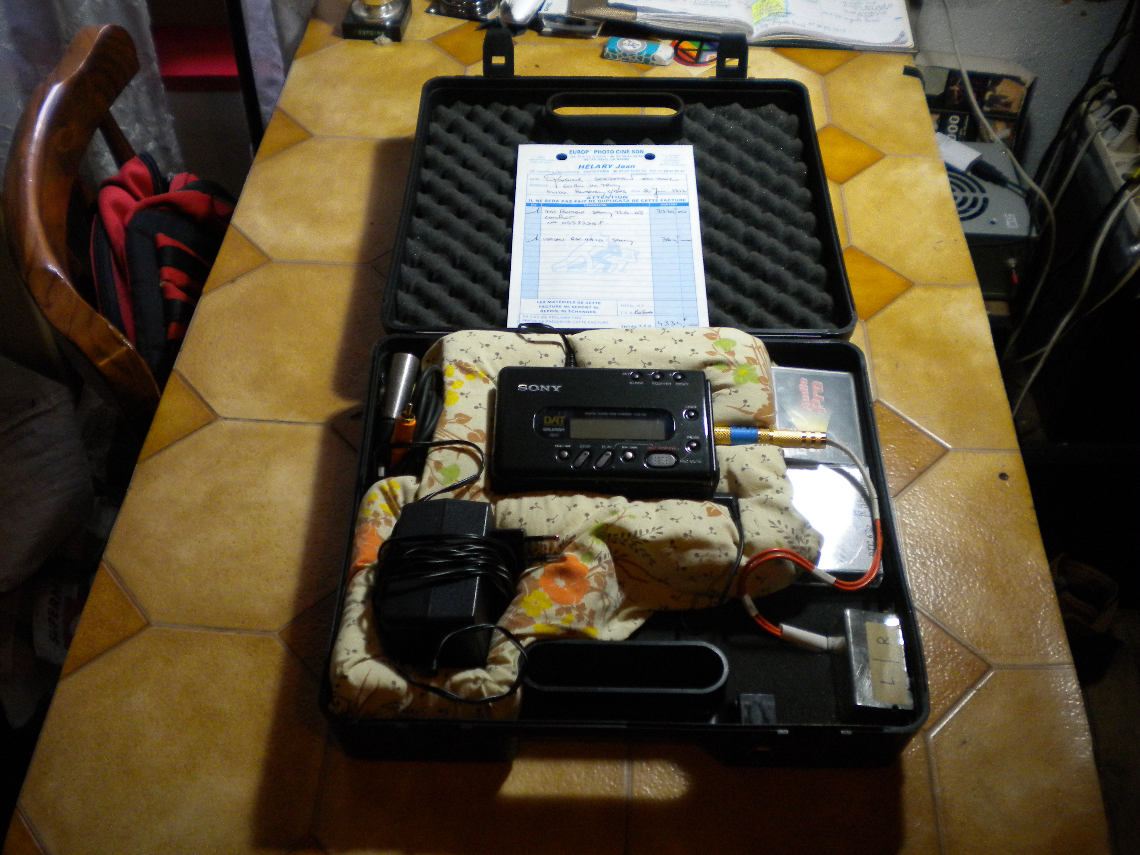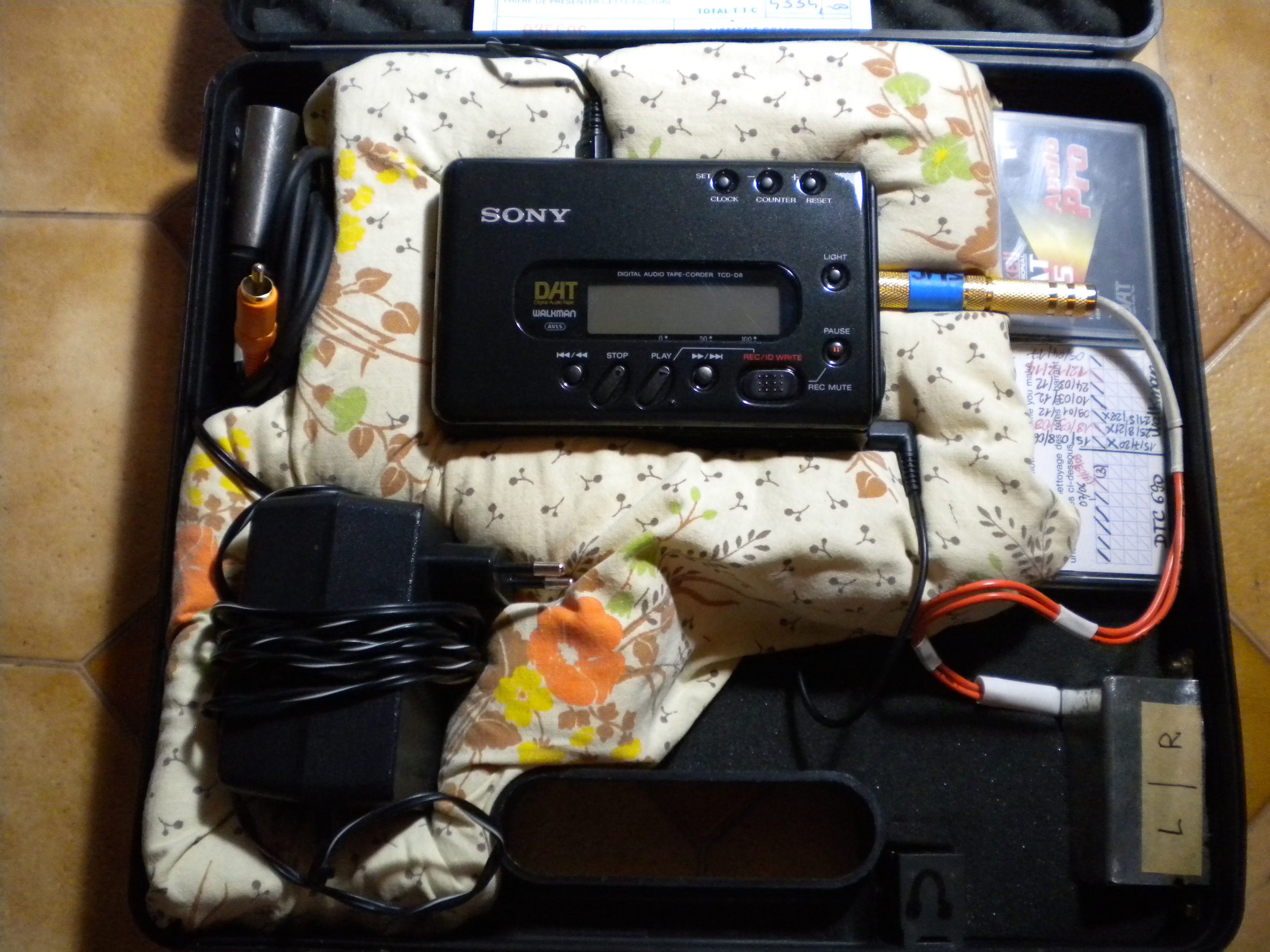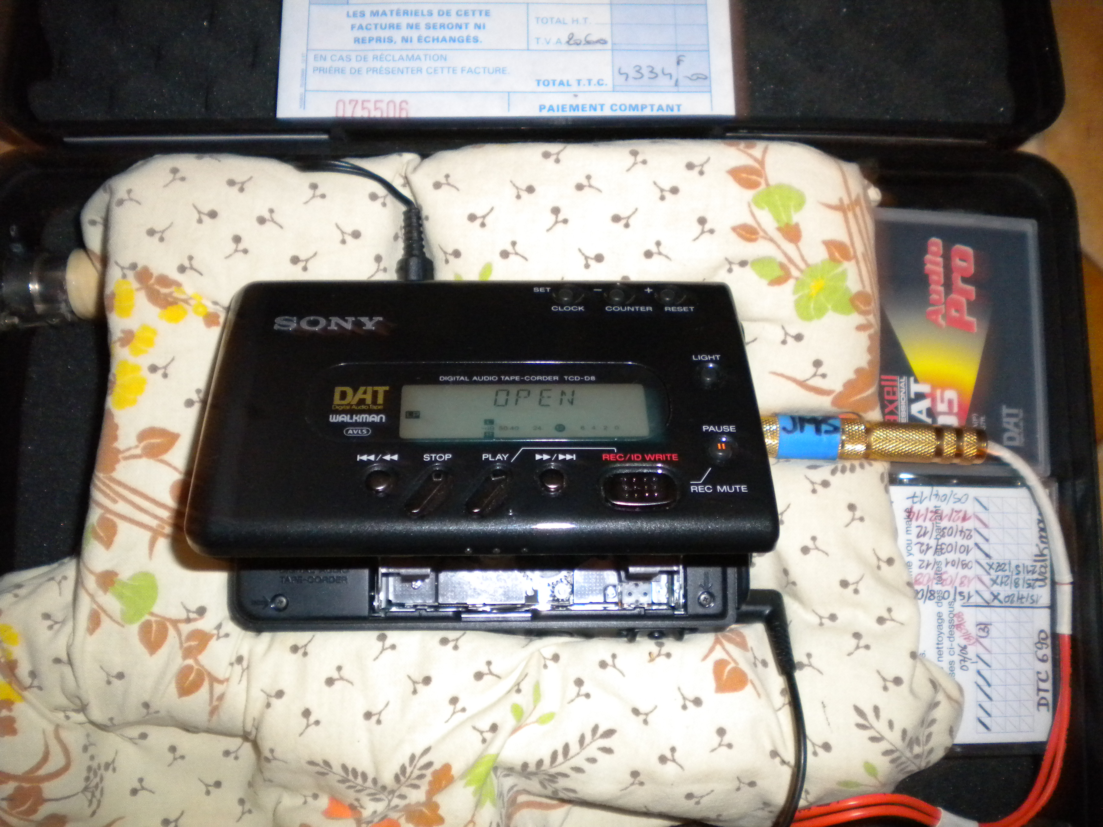 Pour protéger les connecteurs mini-jacks fragiles, le DAT est installé sans une mallette de transport en plastique, rembourrée avec de la mousse. 2 prises XLR "à tout faire" fixées sur la mallette, avec cordon adaptateur ; prise casque de même ; prise alimentation XLR 4 broches de même. 1 cassette "cleaning" offerte. 1 cassette Maxell DAT 95 neuve offerte. Ce DAT est en bon état et fonctionne parfaitement.