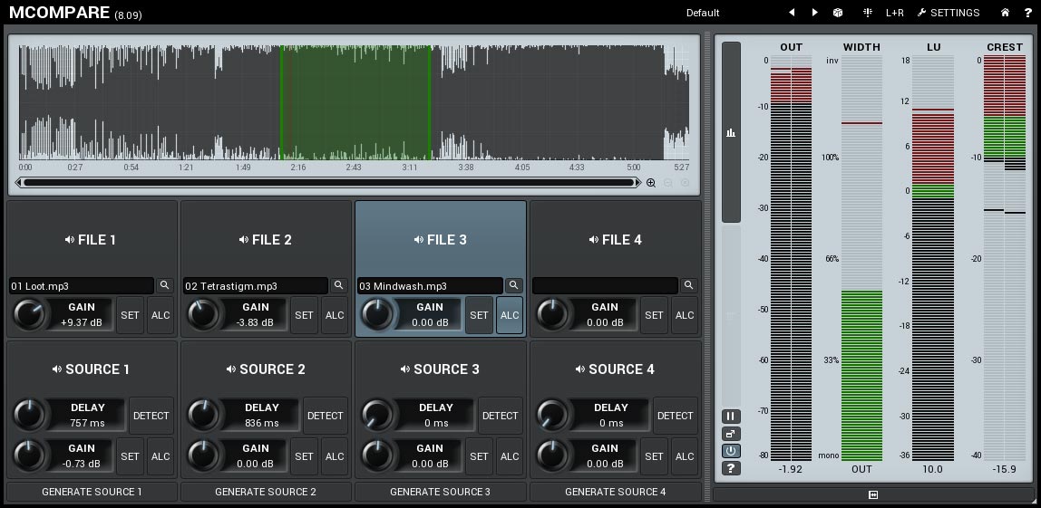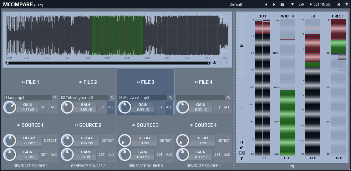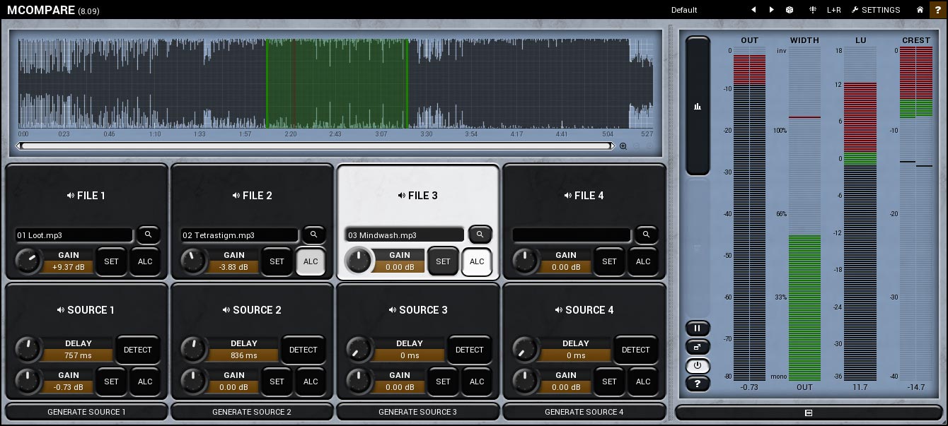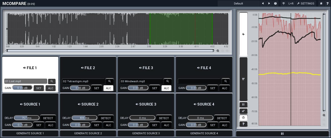 Vous pourrez comparer jusqu’à 4 sources et 4 fichiers de référence, et le plug-in est capable de régler automatiquement le niveau de volume par rapport à celui du morceau de référence et de compenser la latence.